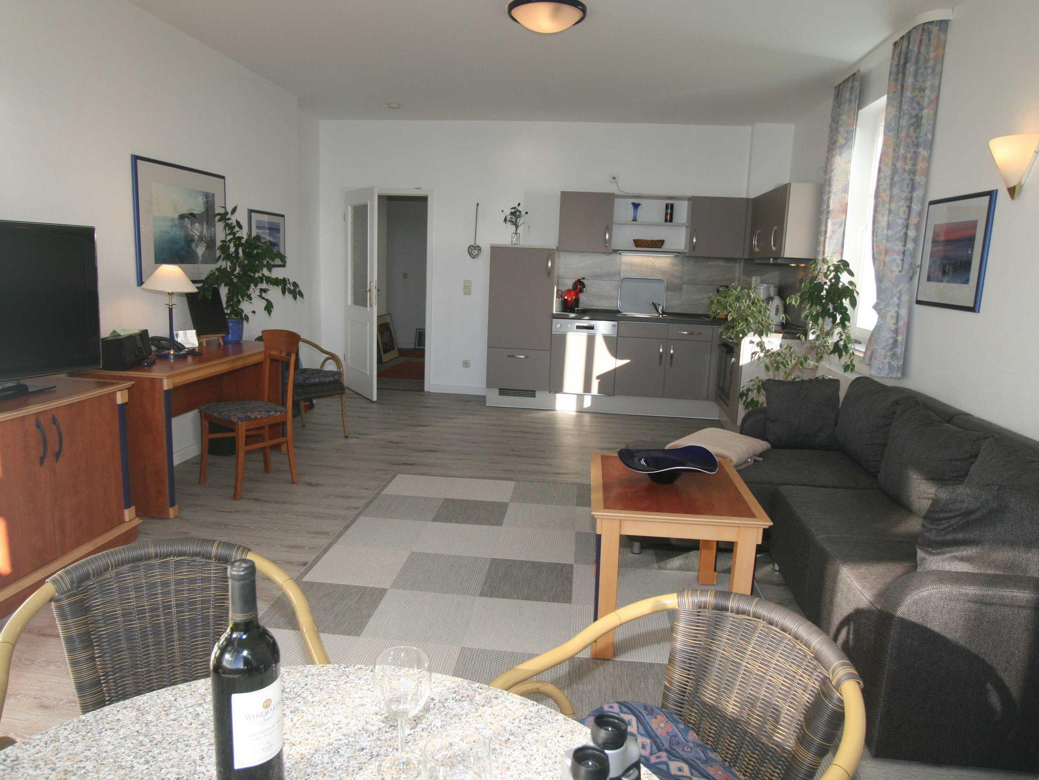 Im Wohnzimmer befindet sich ein Schreibtisch, eine gemütliche Wohnlandschaft, die dann auch für 2 Aufbettungen genutzt werden kann, einen grossen Flatscreen-TV und eine Multifunktionanlage, mit der Sie auch CD' s & DVD's abspielen können. Wir leihen Ihnen auch gerne eine DVD über die schöne Insel Rügen aus.