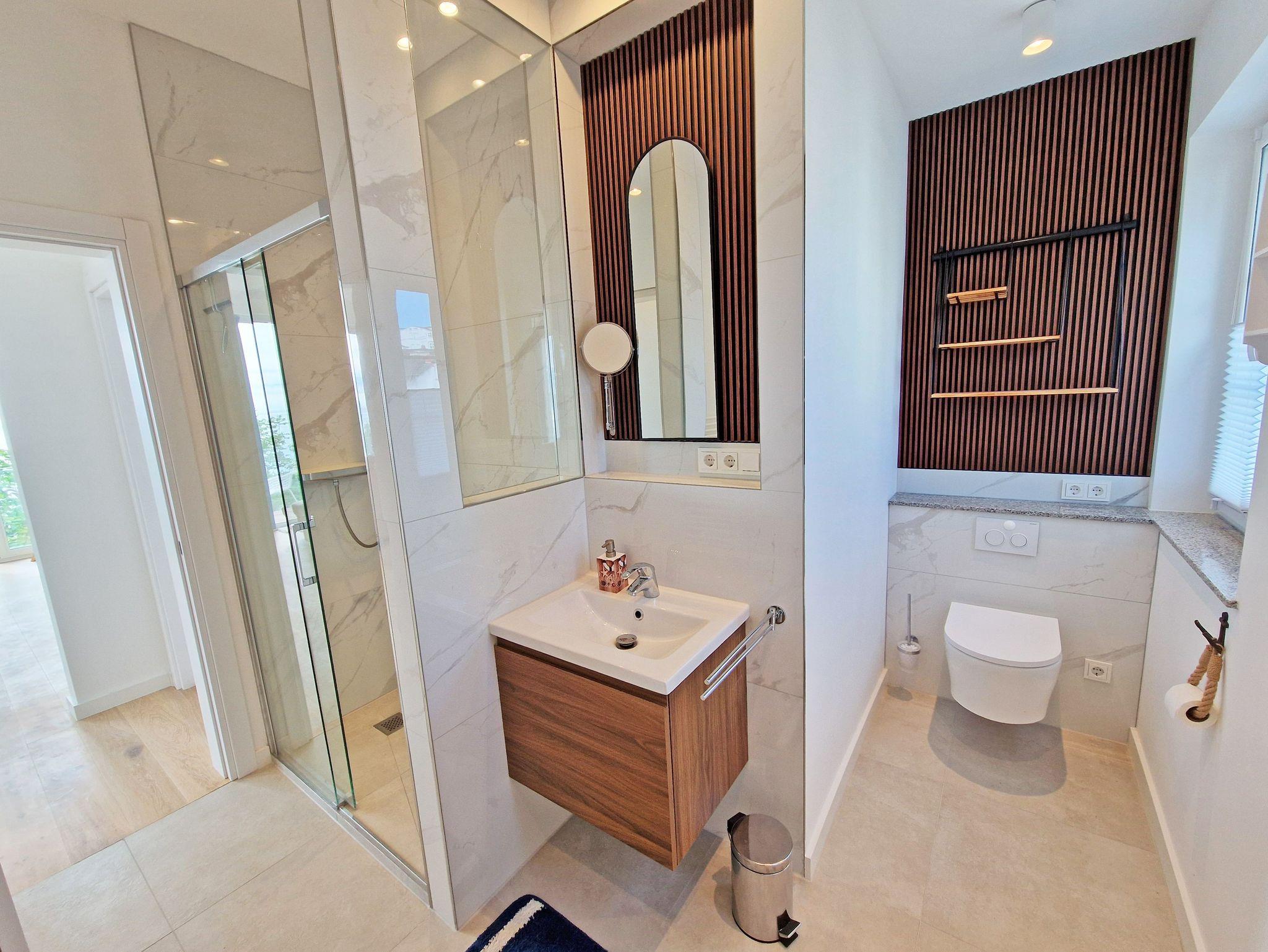 ? Das moderne Badezimmer ist ausgestattet mit bodengleicher Dusche, Regenbrause und WC.