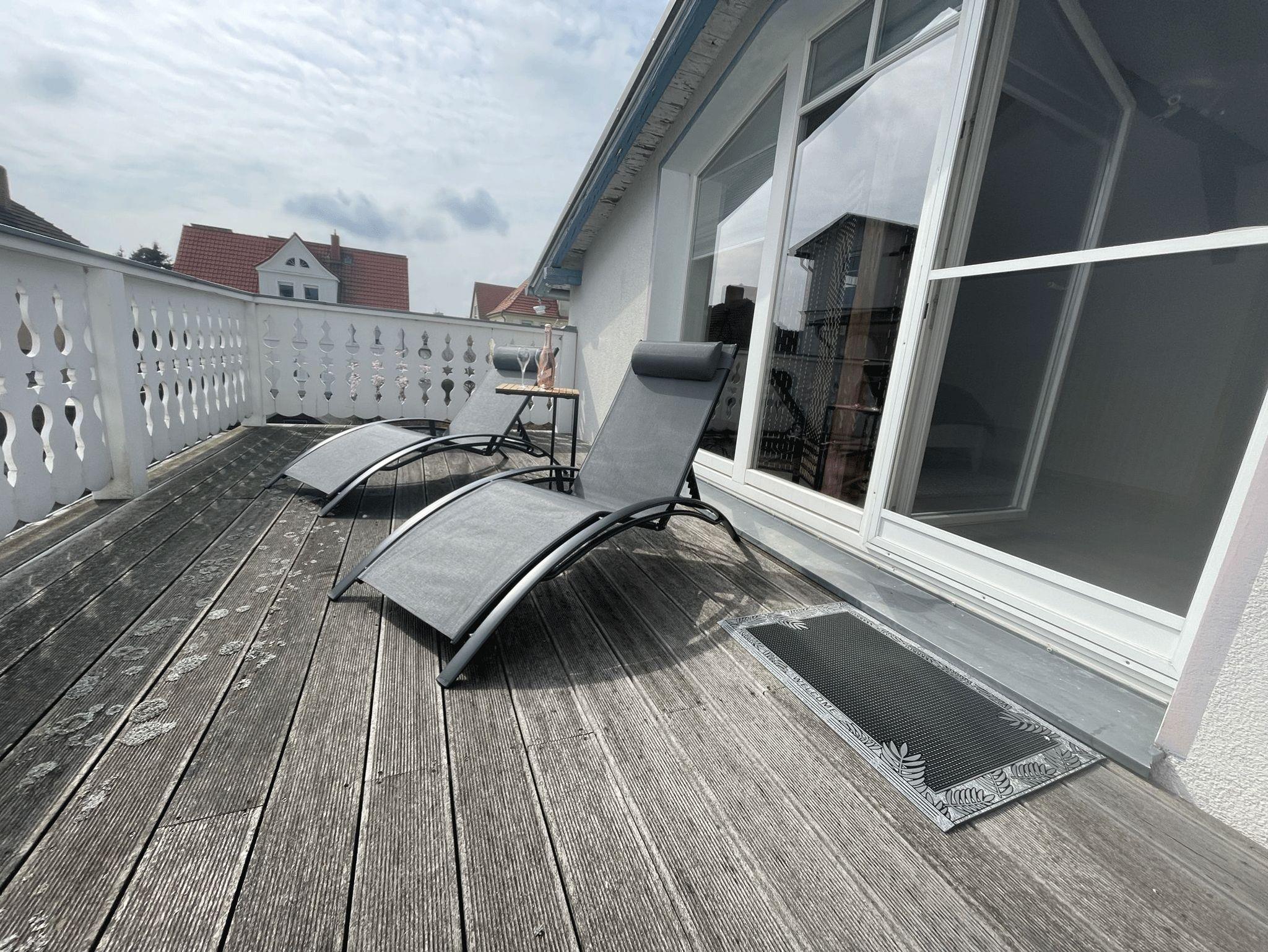 • Großer Wohnbereich mit wunderschöner Terrasse. Die Terrasse ist möbliert und ein zusätzlicher Strandkorb und Grill gehört zur weiteren Ausstattung.