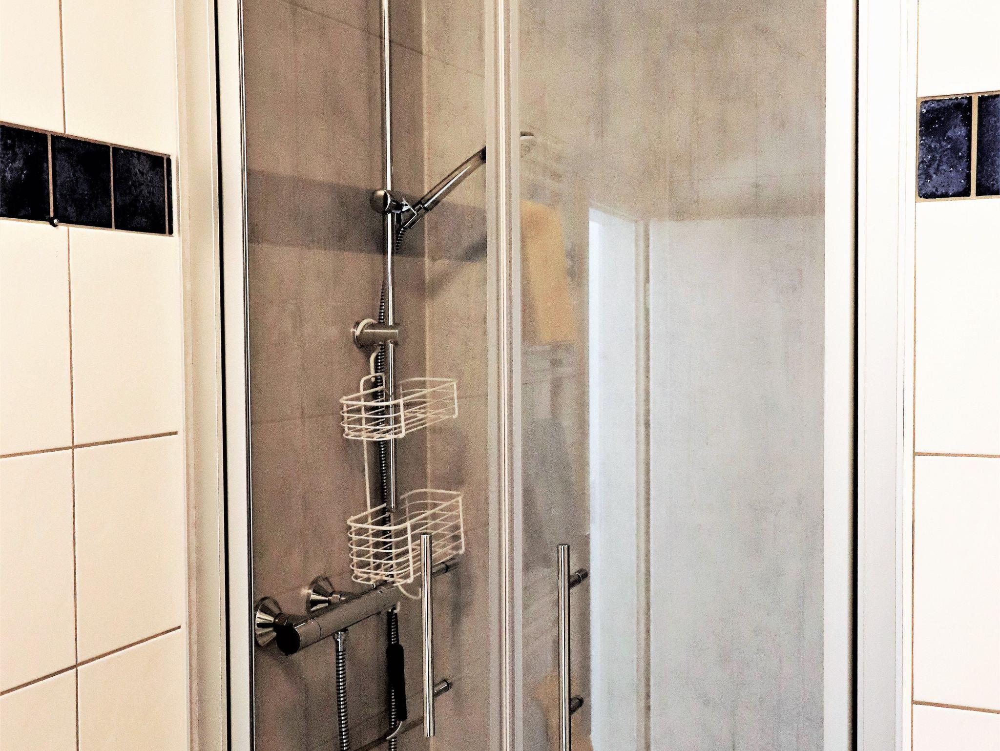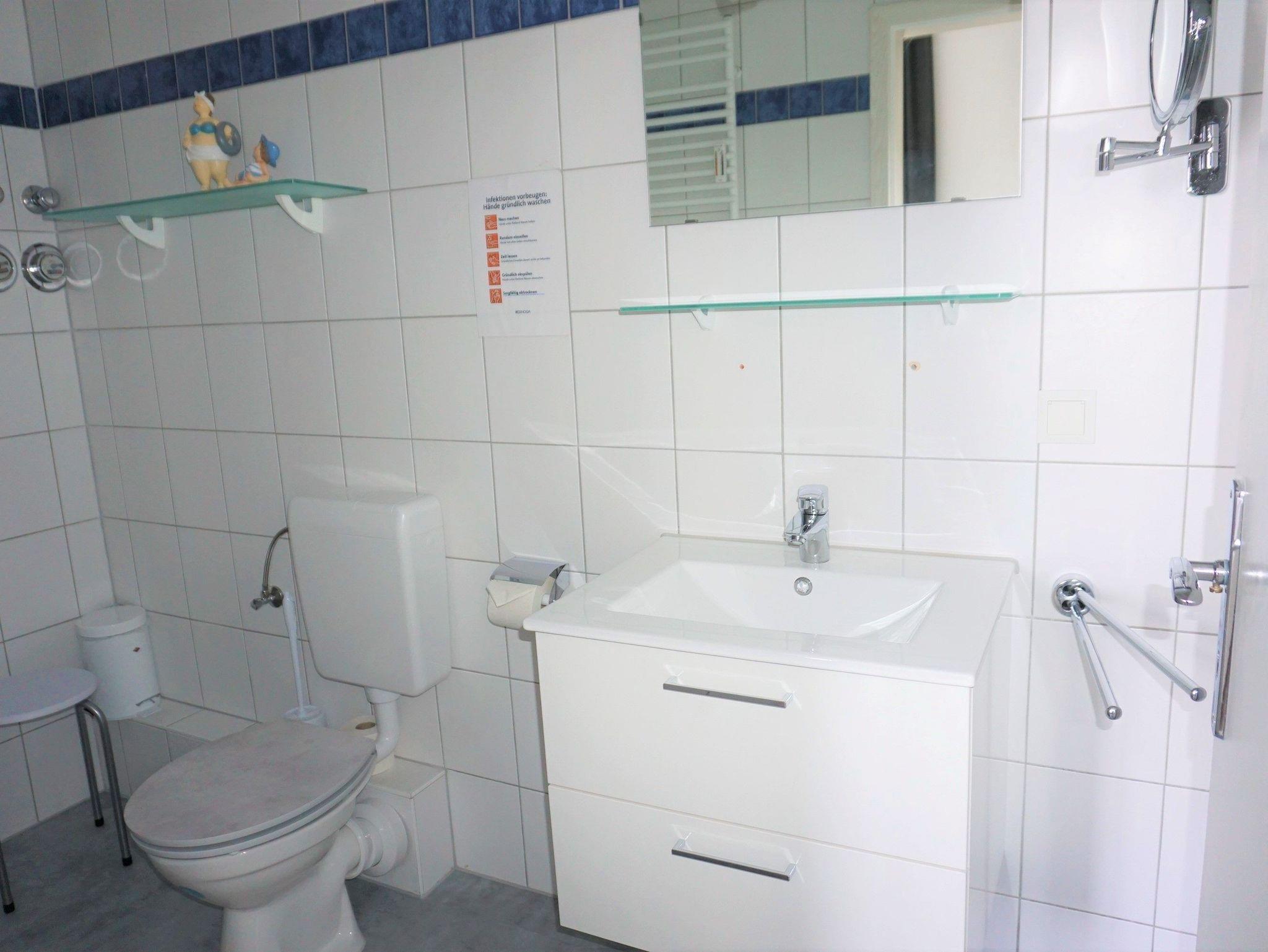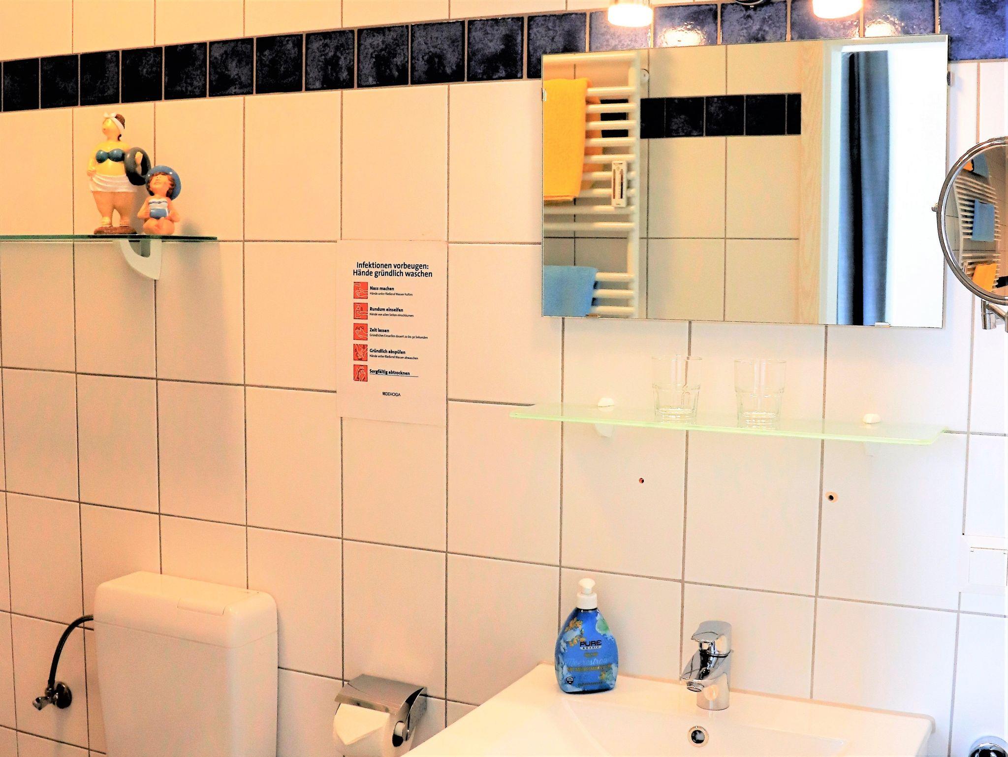Das helle Badezimmer (ebenfalls renoviert) mit Dusche und WC begrüßt sie am Morgen mit angewärmten Handtüchern.
