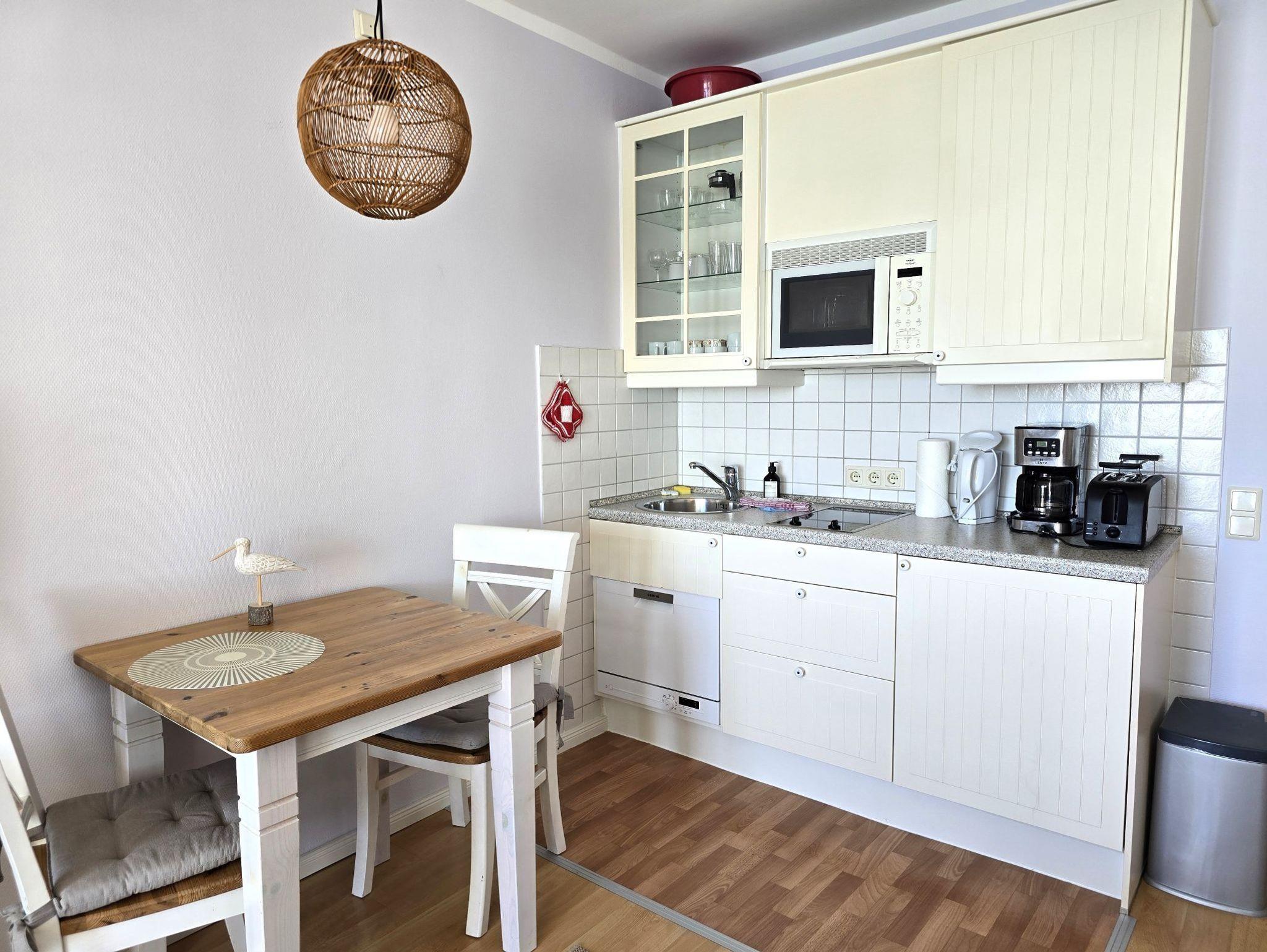 • Integrierte Küchenzeile im Wohnraum, ausgestattet mit 2 Platten-Ceranherd, Kühlschrank mit Gefrierfach, Geschirrspüler, Mikrowelle, div. Geschirr und Kochutensilien.