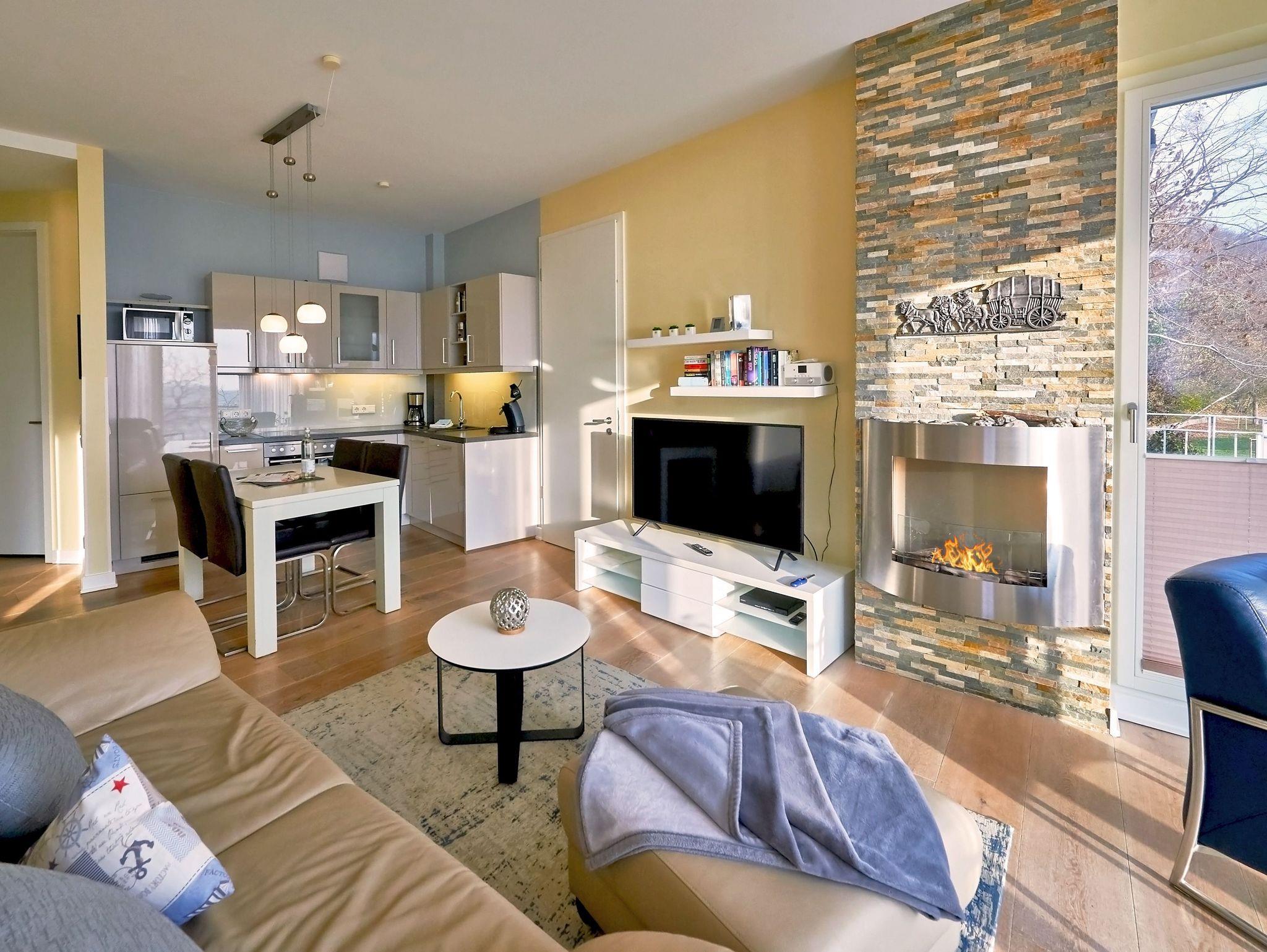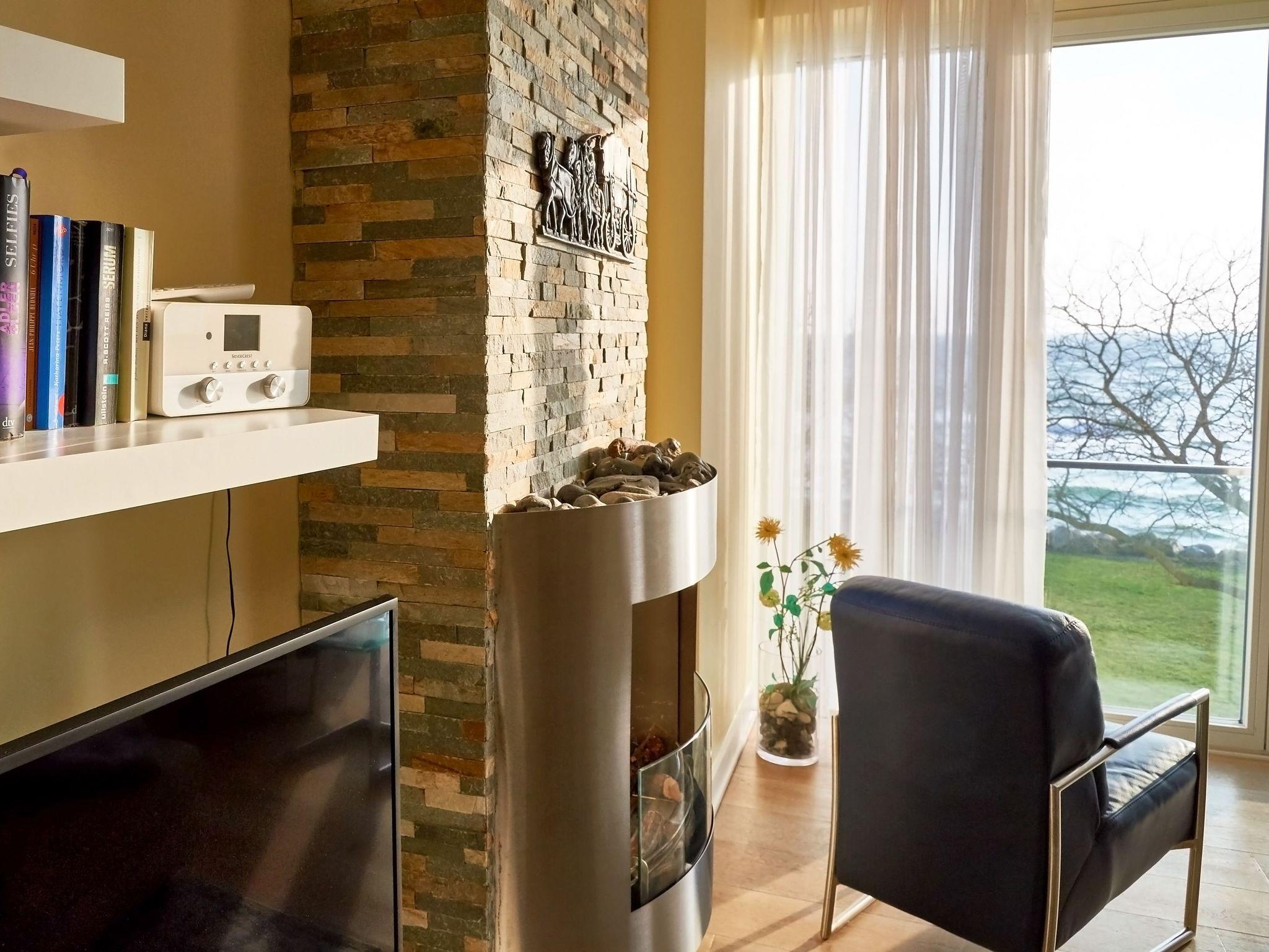 Im ca. 27 m² großen, sehr komfortabel gestalteten Wohnraum mit Essbereich können Sie den herrlichen Ausblick auf die Ostsee vor dem Ethanolkamin mit seinem anheimelnd flackernden Feuer genießen. Die bodentiefen Fensterelemente im Wohnraum sind so konstruiert, dass sie sich um 180 Grad öffnen lassen. So kann man wind- und wettergeschützt - wie in einem Wintergarten sitzend - die Sonne und den Blick geniessen - im Winter auch den Blick auf die Ostsee.