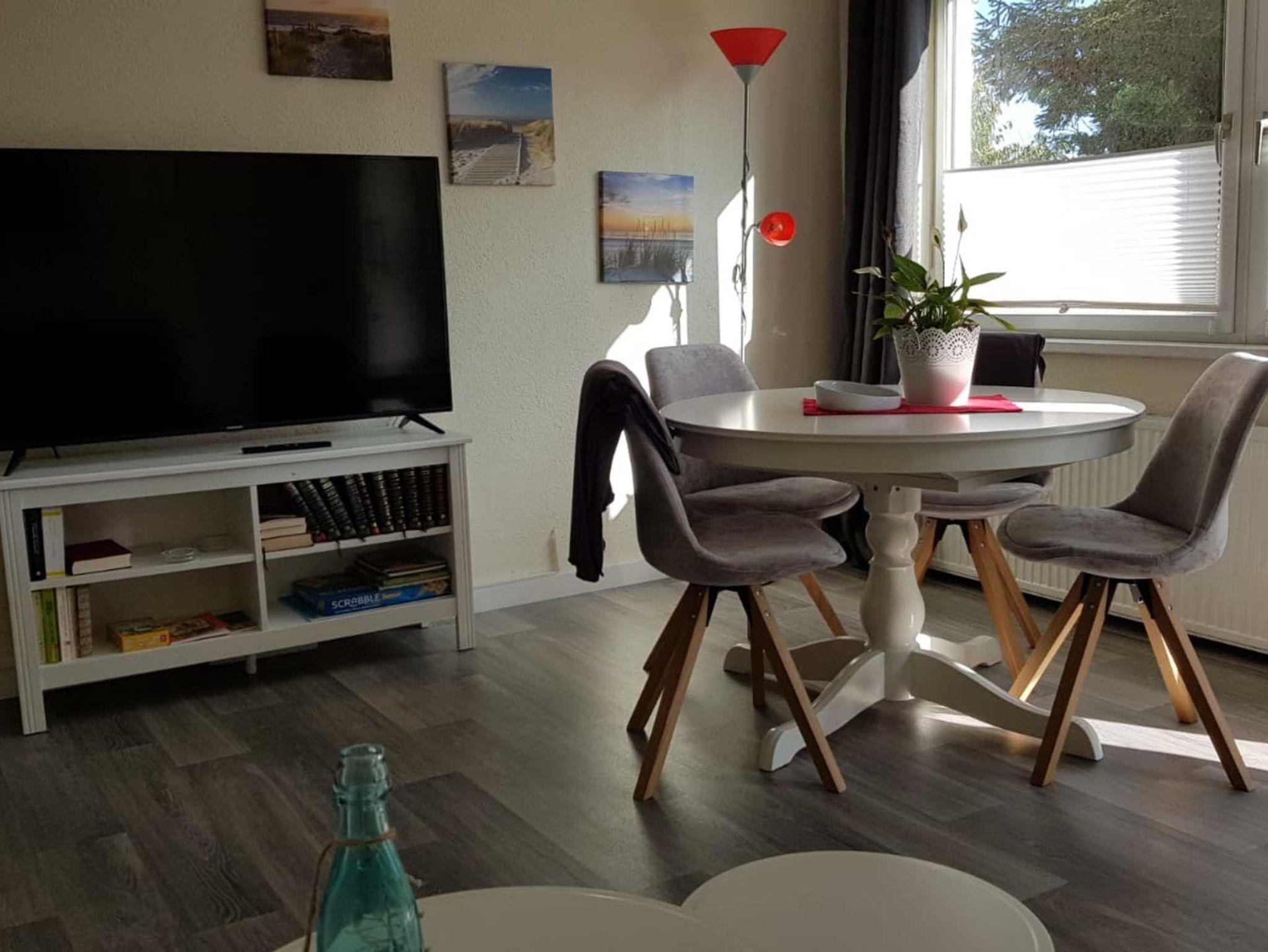 Im Wohnzimmer wartet ein großer Flachbildschirm und eine gemütliche Sitzgruppe auf ein Beisammensein bei Spiel und Spaß. 2 Aufbettungen sind auf dem Schlafsofa im Wohnzimmer möglich.