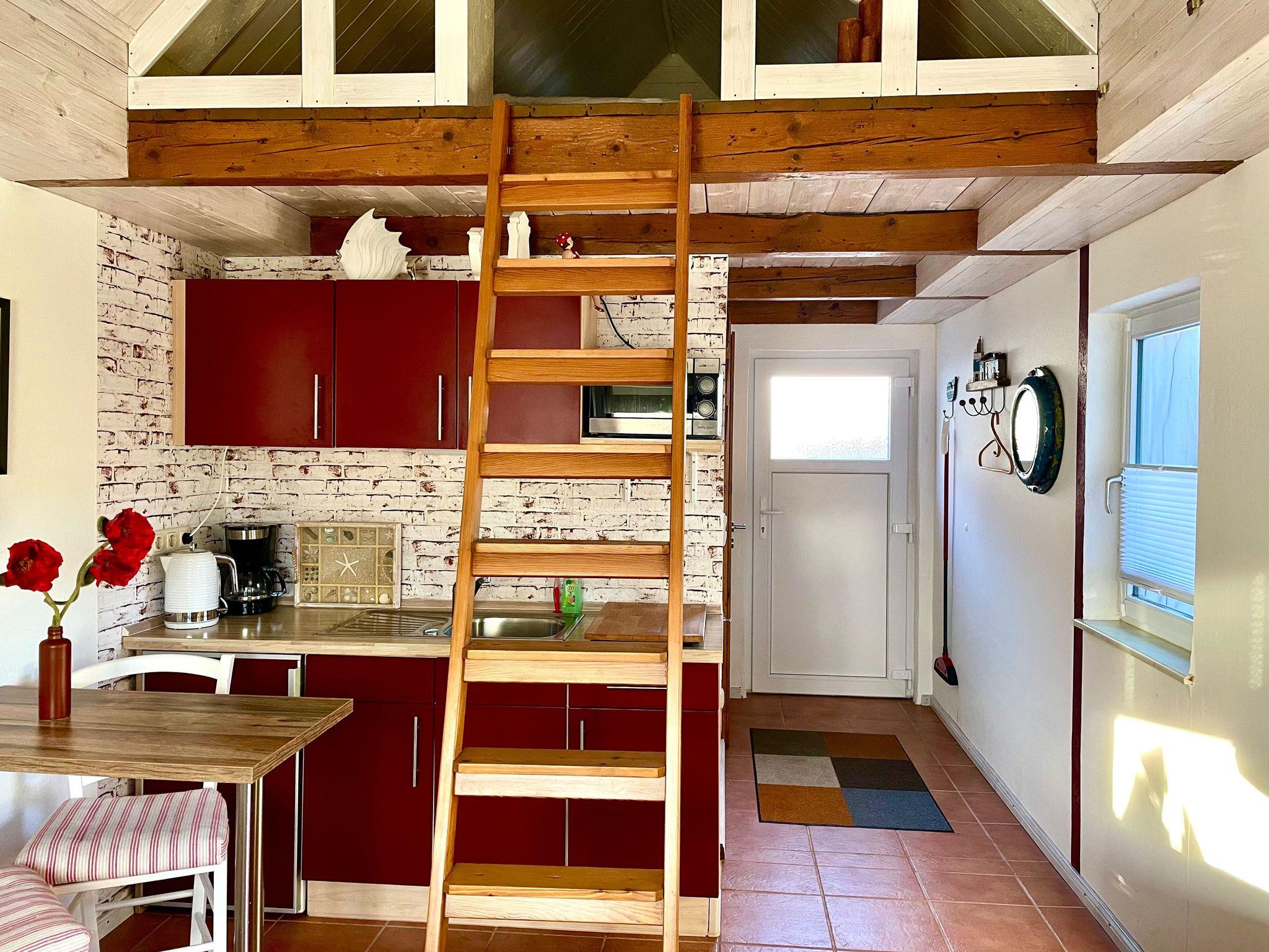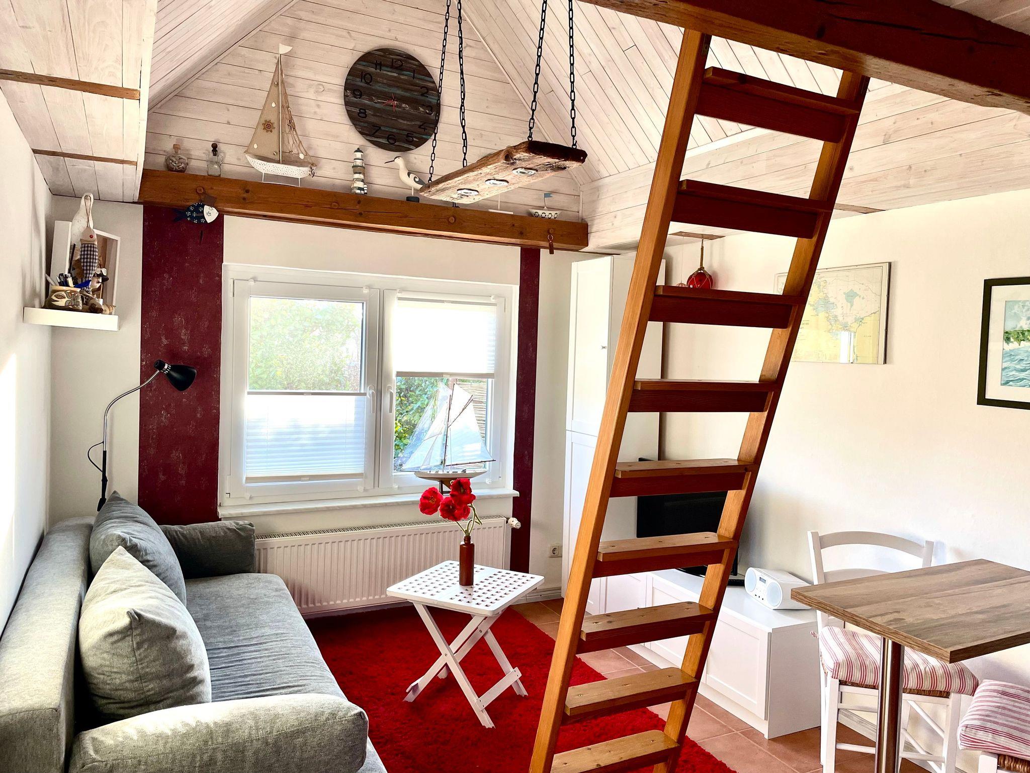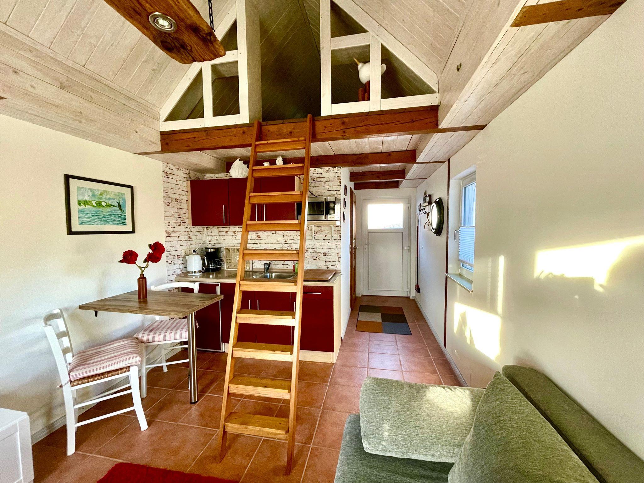 Das kleine Ferienhaus liegt am Stadtrand der Hafenstadt Sassnitz in einer ruhigen Seitenstraße und befindet sich auf dem Grundstück der Vermieter. Das Ferienhaus verfügt über einen kombinierten Wohn- und Schlafraum. Im unteren Teil des Hauses erwartet Sie eine gemütliche Couch mit TV, eine kleine Pantryküche mit Essplatz und das Bad mit Dusche und WC. Über eine kleine steile Treppe gelangt man in den gemütlichen Schlafboden, wo sich das Doppelbett befindet.