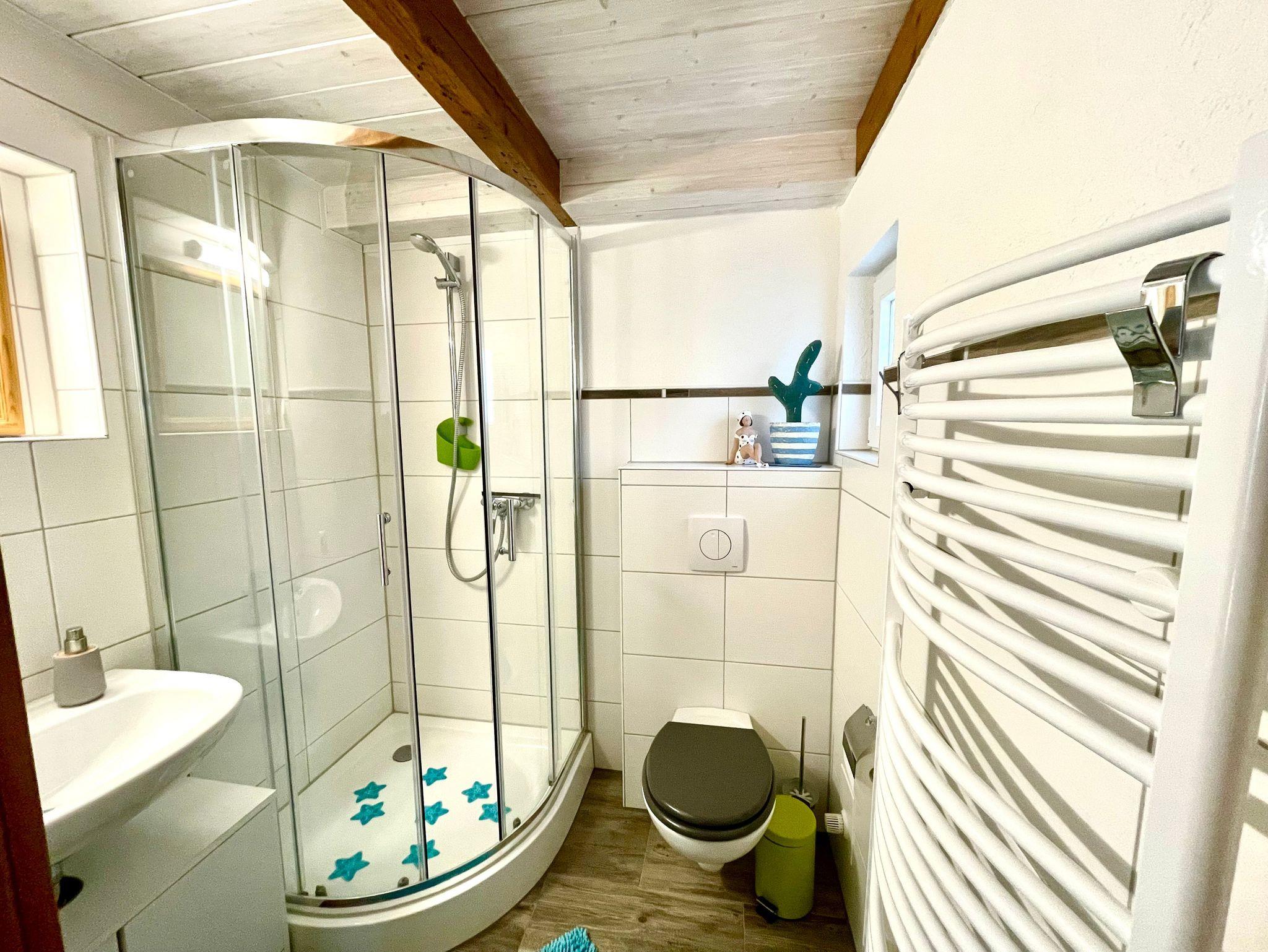 ? Modernes Badezimmer mit Dusche, WC, Fön und Handtuchwärmer