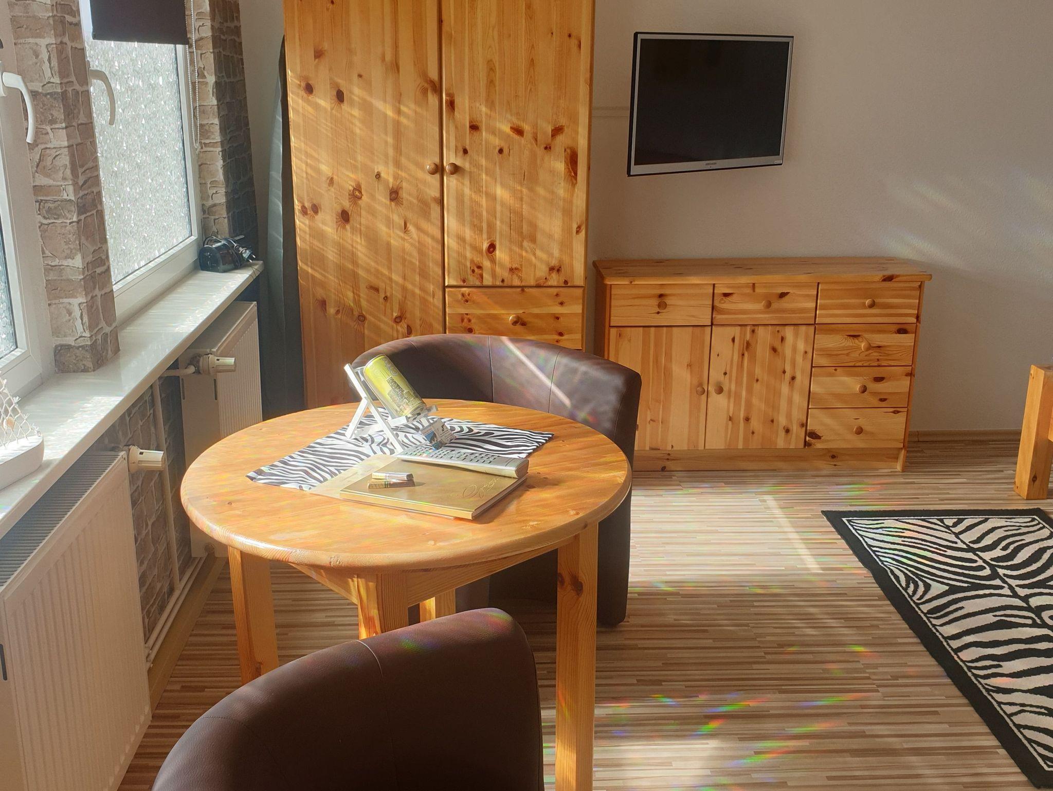 ? Weiterhin bietet die Fewo eine Sitzgruppe, einen Flachbild-Fernseher und genügend Stauraum.