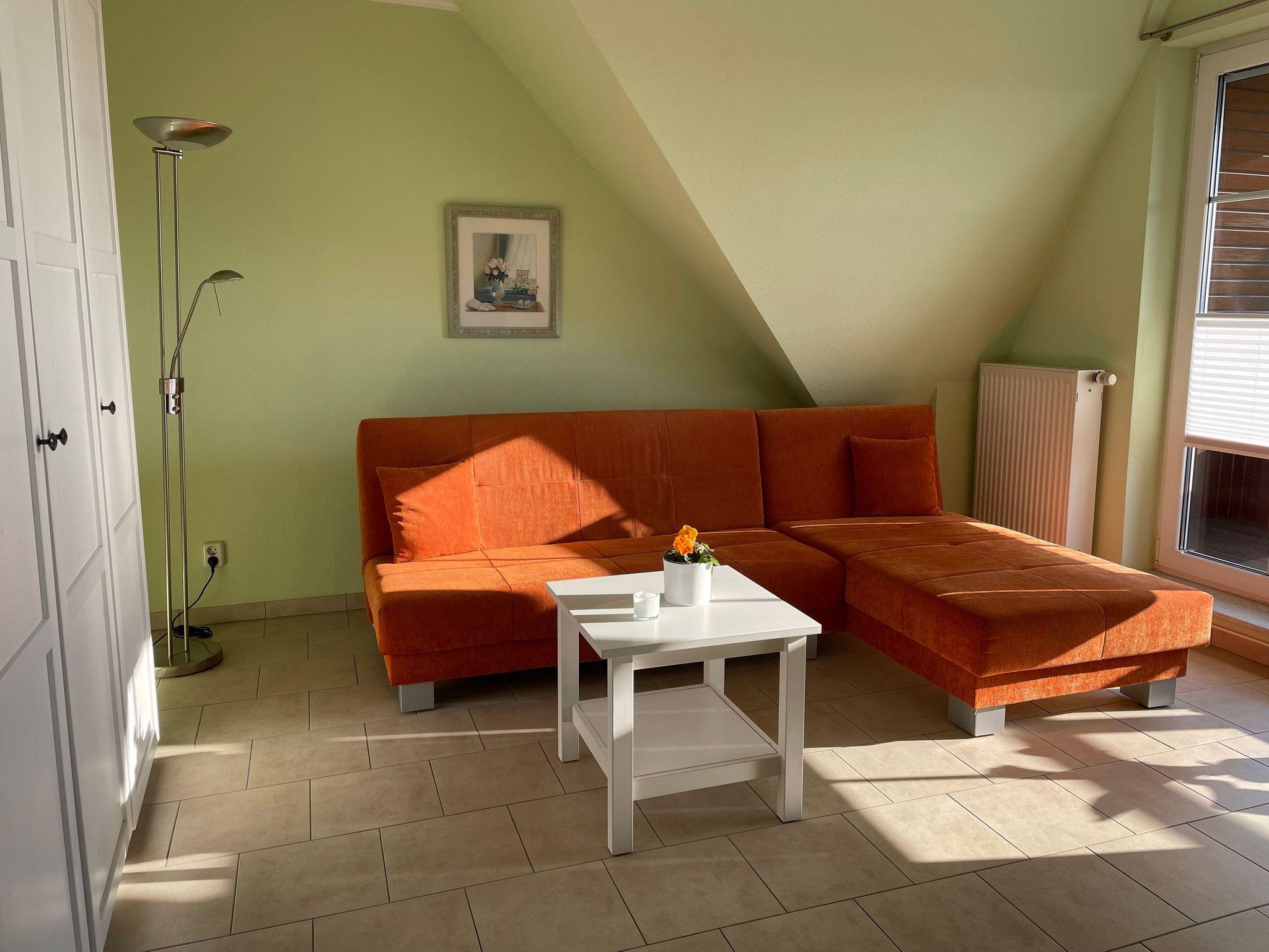 Eingang über eine sep. Treppe an der Hausseite direkt in den Küchenbereich mit Sitzecke, Küchenzeile und Aufbettung für eine 3 Person auf einem Schlafsessel. Das sonnige Wohn- und Schlafzimmer verfügt über eine Schlafcouch, einen großen Kleiderschrank, TV und einem große Balkon zur Südseite, von dem Sie den traumhaften Sonnenuntergang genießen können.