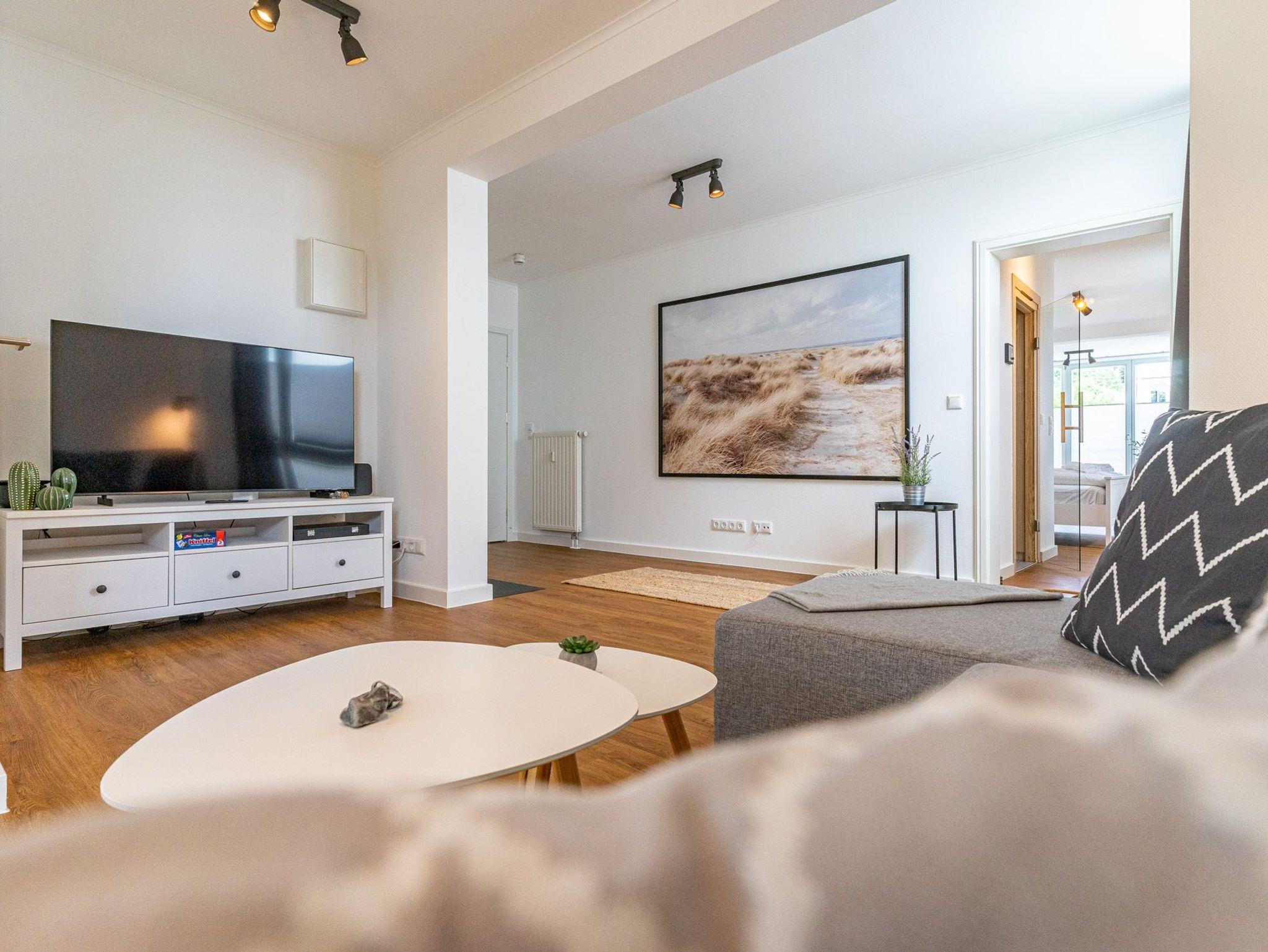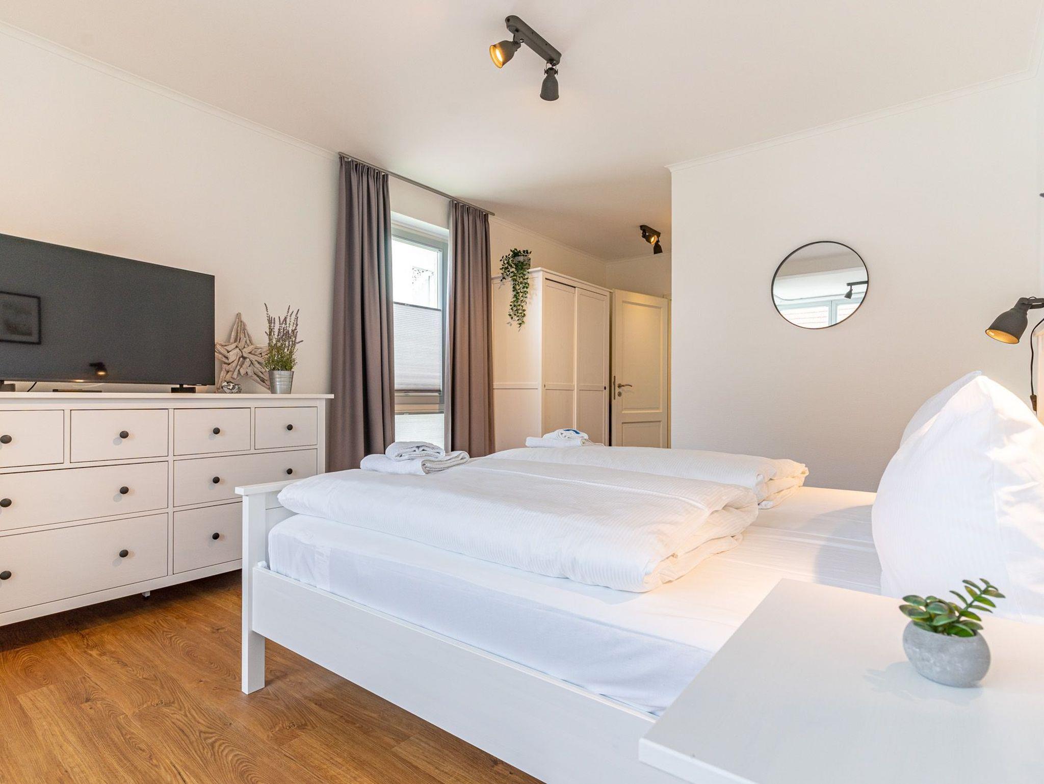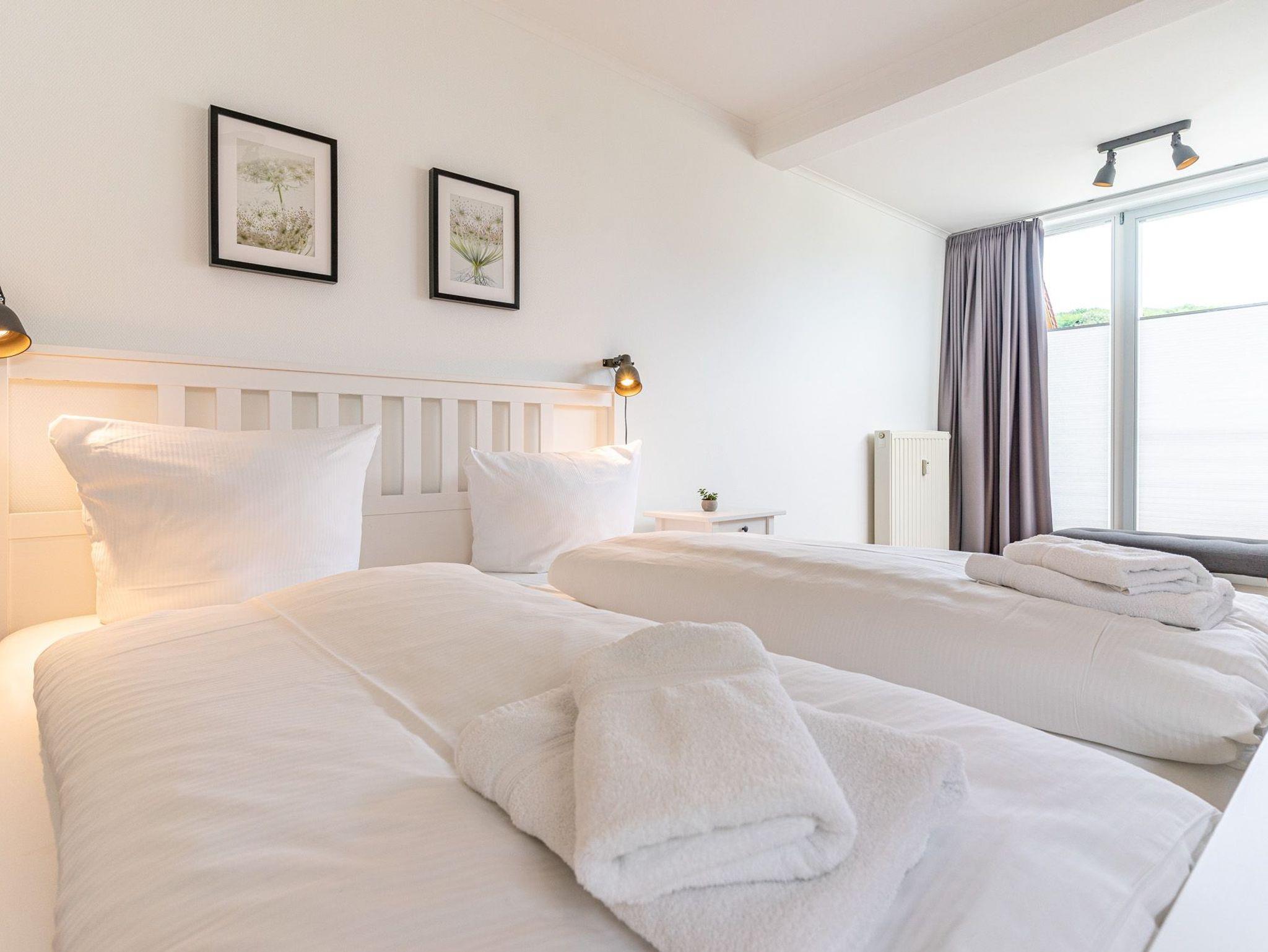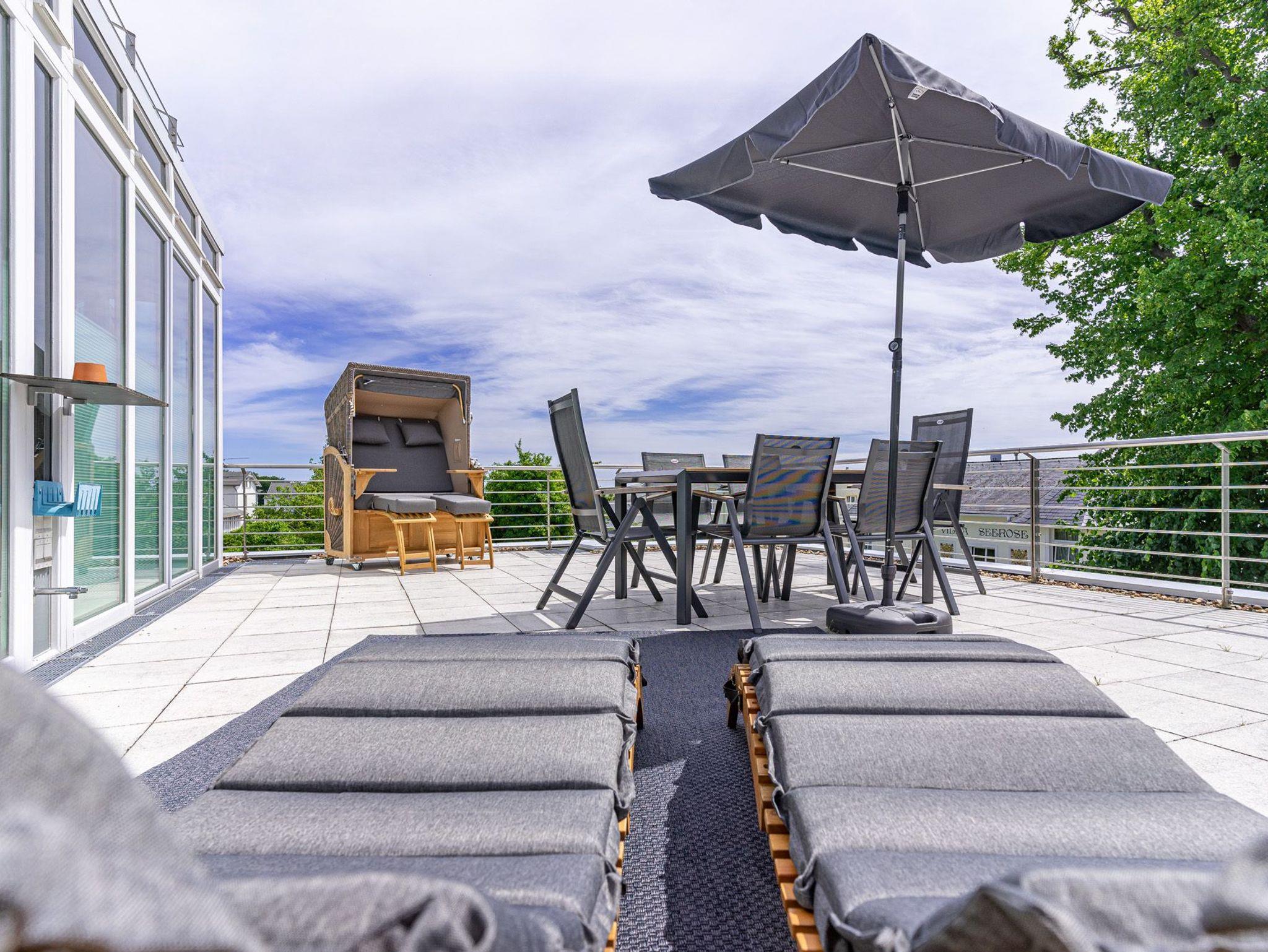 Penthouse-Appartement für bis zu 3 Personen, ca. 85 m² Wfl. im II.OG, große Sonnenterrasse (ca. 65 m²) möbliert + Strandkorb, 1 sep. Schlafzimmer mit Doppelbett, eine weitere Einzelschlafcouch im großen Wohnbereich. Ein Haustier ist erlaubt. WLAN; Flachbild-TV, Bluetooth-Player uvm.
