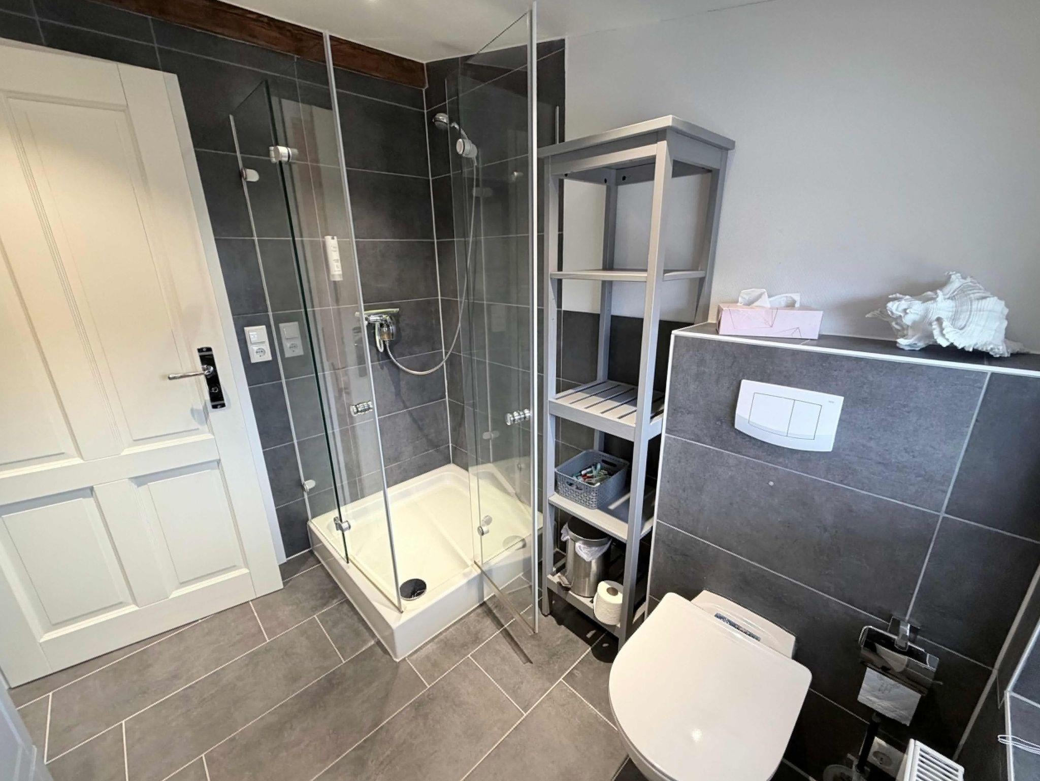 Das Bad bietet eine geräumige Dusche, Waschplatz mit großem Spiegel, WC, Waschmaschine, Ablageflächen und Fön.