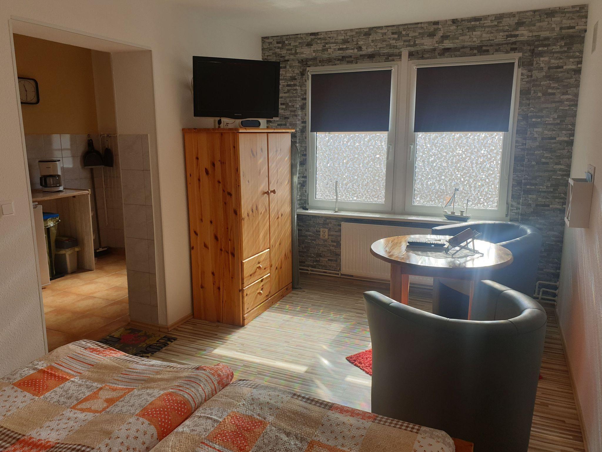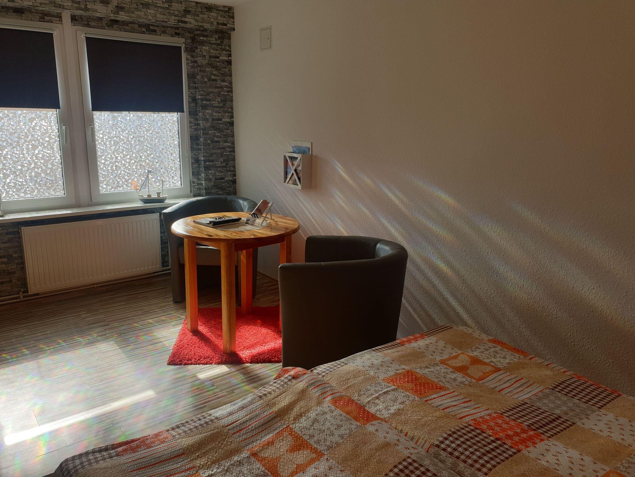 ? Weiterhin bietet die Fewo eine Sitzgruppe, einen Flachbild-Fernseher und genügend Stauraum.