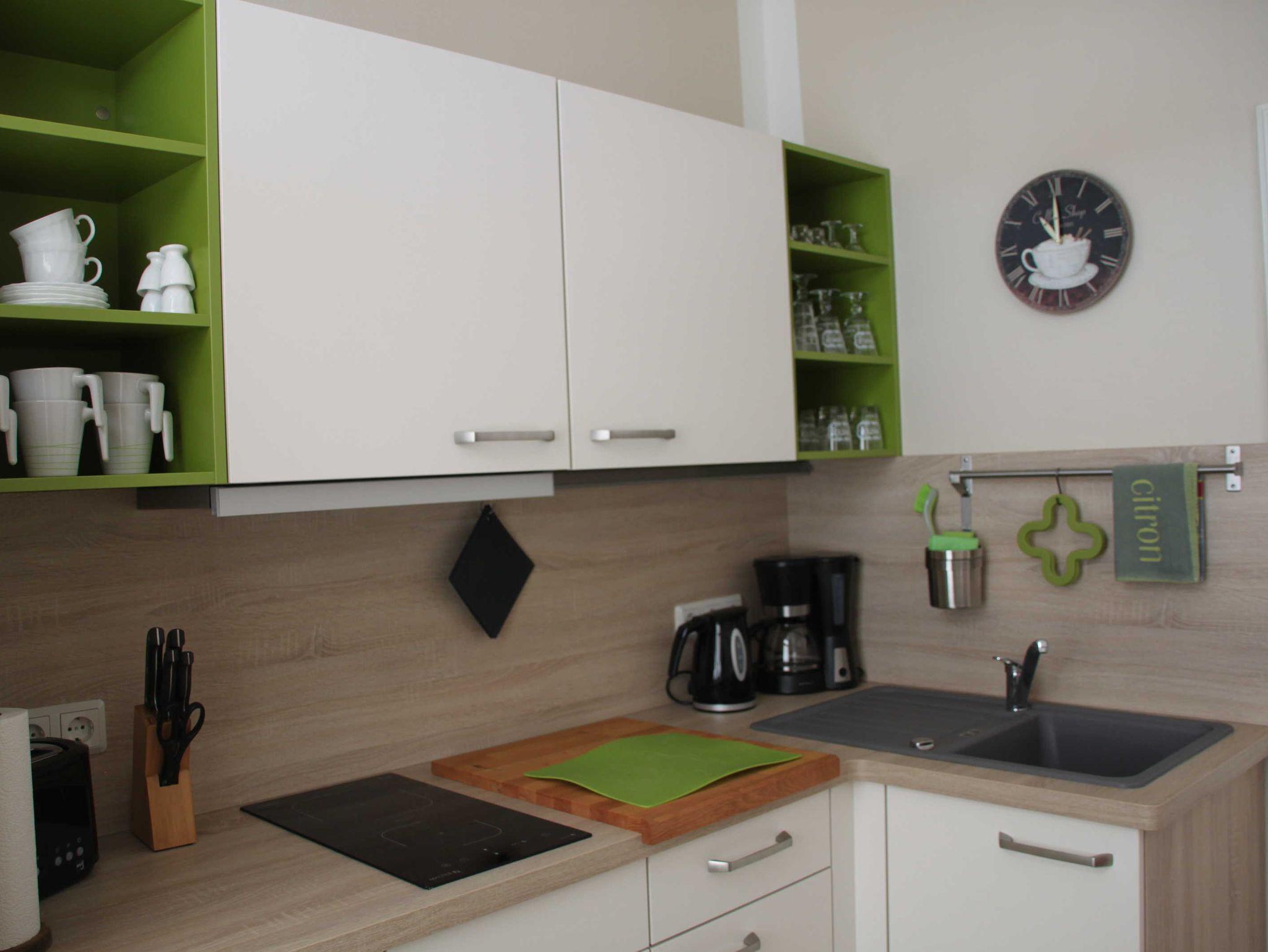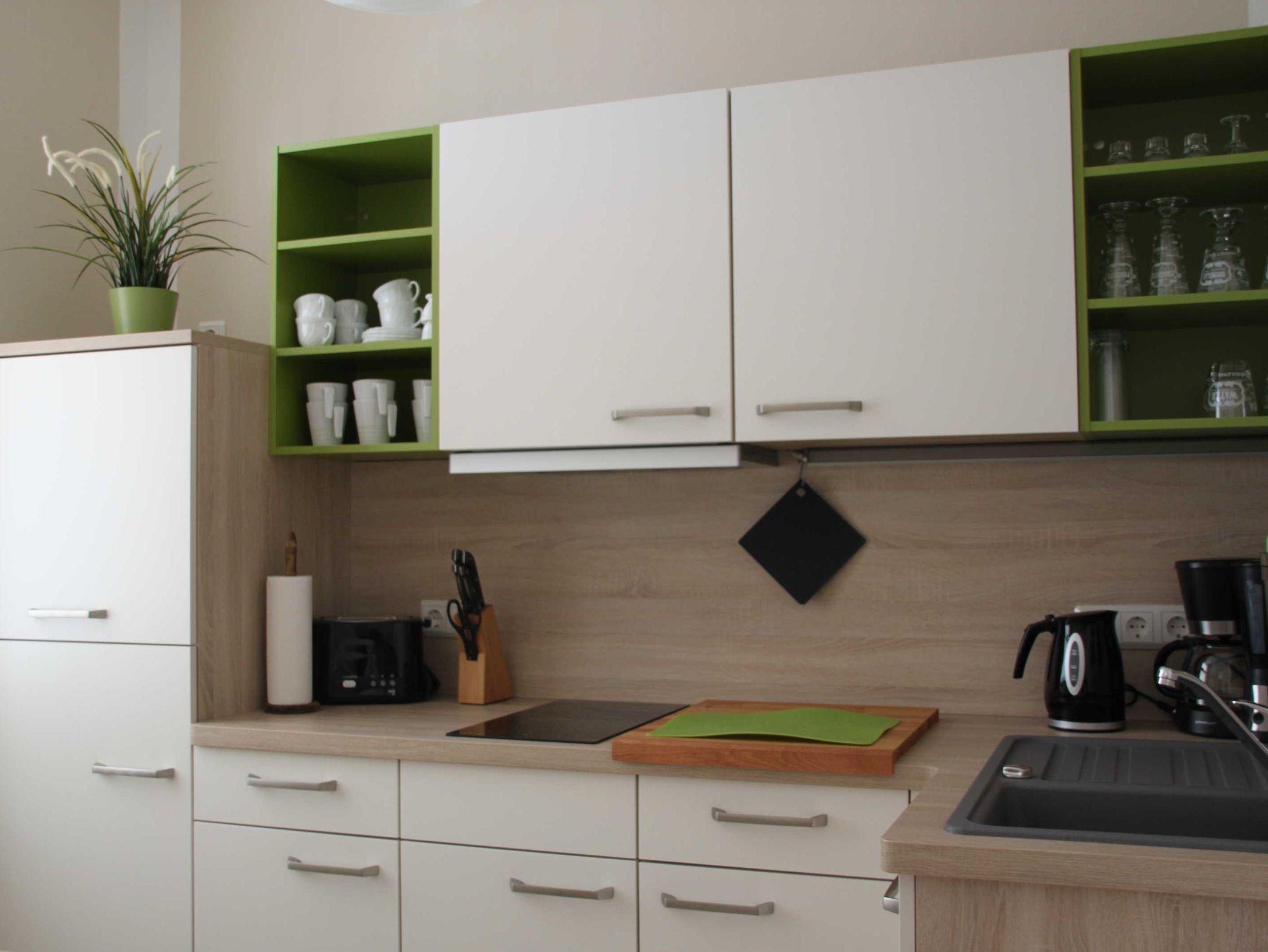• Einbauküche mit Kaffeemaschine, Toaster, Wasserkocher, Kühlschrank, Induktionskochfeld, Mikrowelle