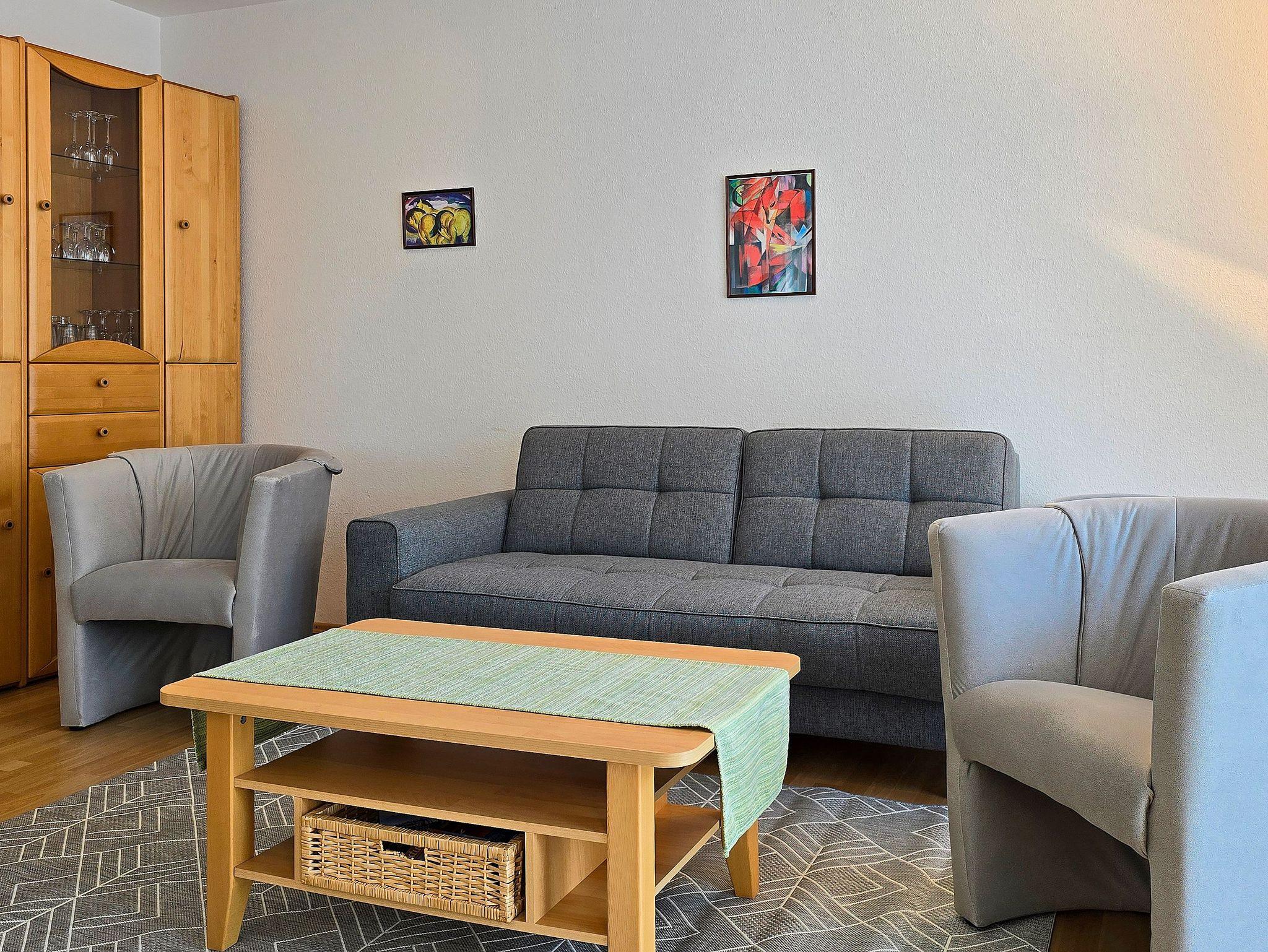 ? Im gemütlichen Wohnzimmer mit Couchgarnitur, die auch als Aufbettung dient, steht ein Esstisch mit 4 Stühlen, ein Flachbild TV, WLAN,Radio und CD-Player.
