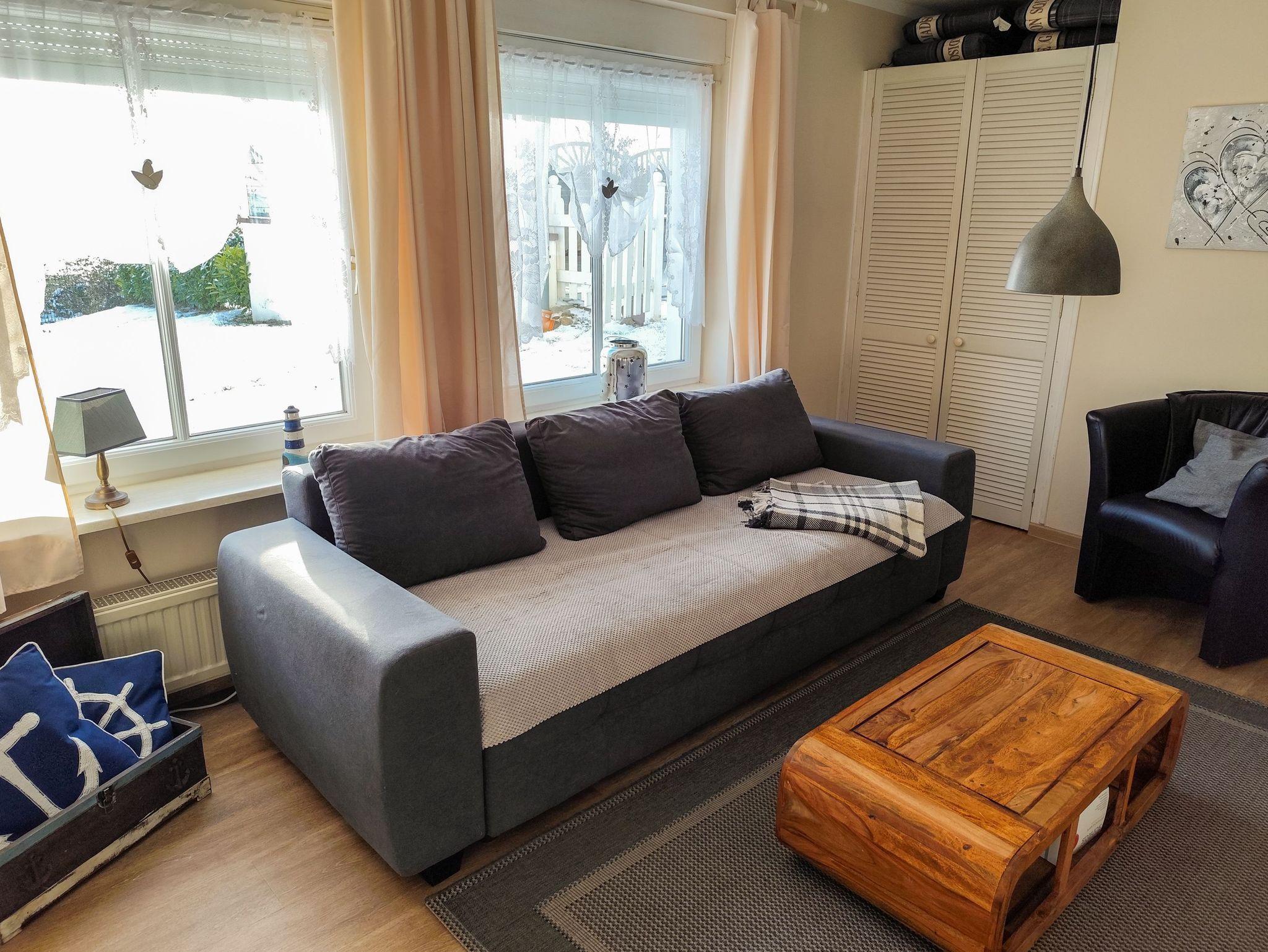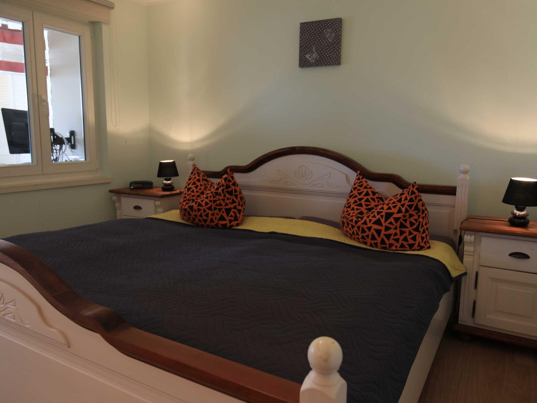 Das Wohnzimmer ist mit TV, Esstisch und als Schlafsofa (160x200) ausklappbarem Sofa ausgestattet und das Schlafzimmer mit Doppelbett (180x200; getrennte Matratzen). Ein Reise-Babybett steht zur Verfügung.