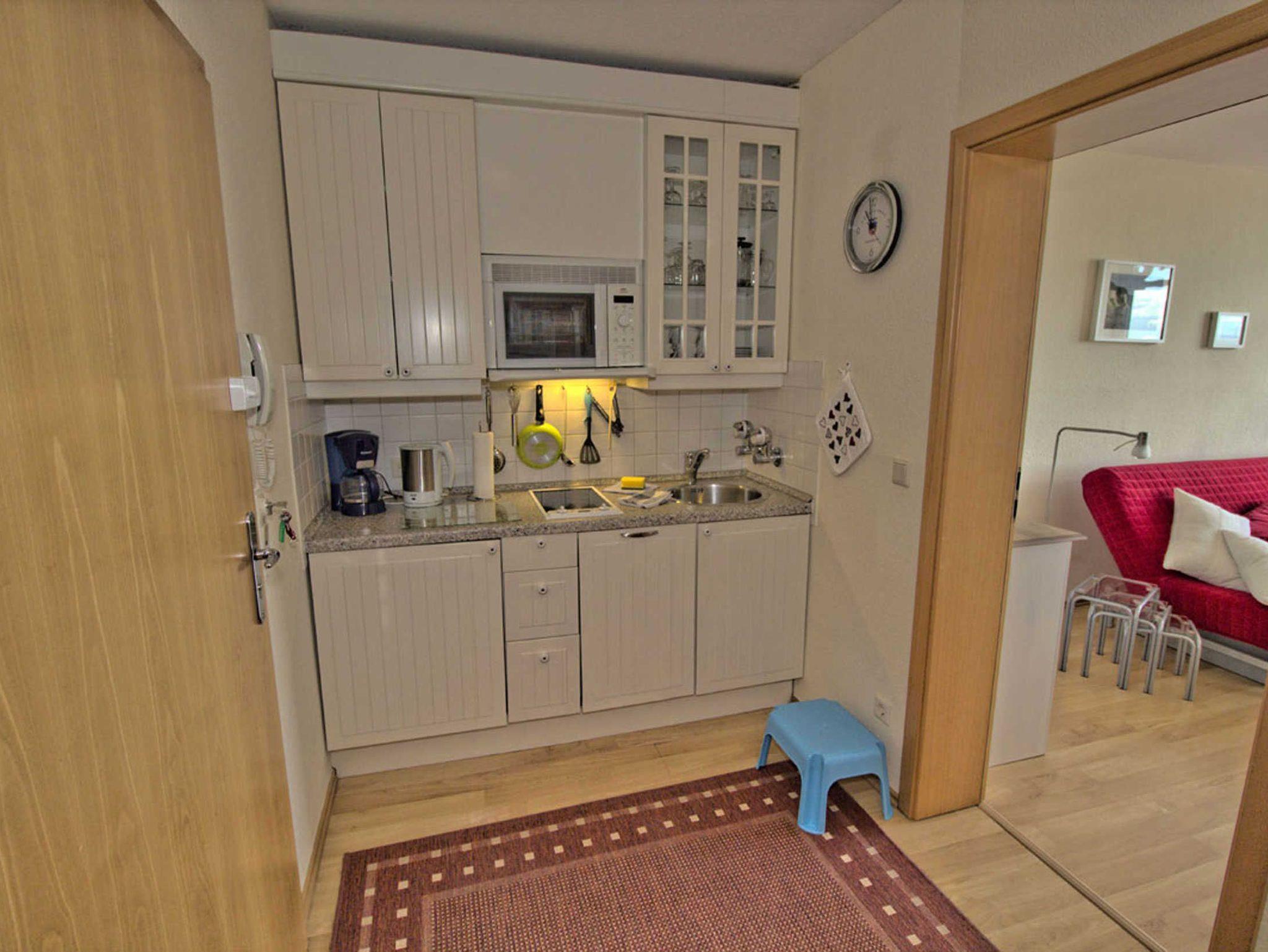? Im Eingangsbereich ist die Küche mit einem 2-Platten-Cerankochfeld, Mikrowelle, Spülmaschine, Kühlschrank mit TK-Fach, Wasserkocher, Toaster, Kaffeemaschine und Stabmixer ausgestattet.