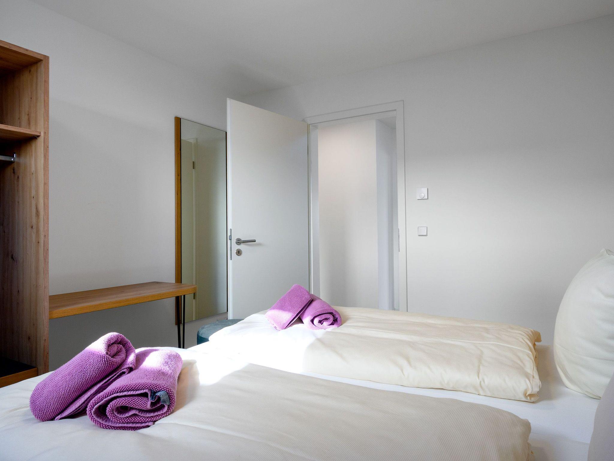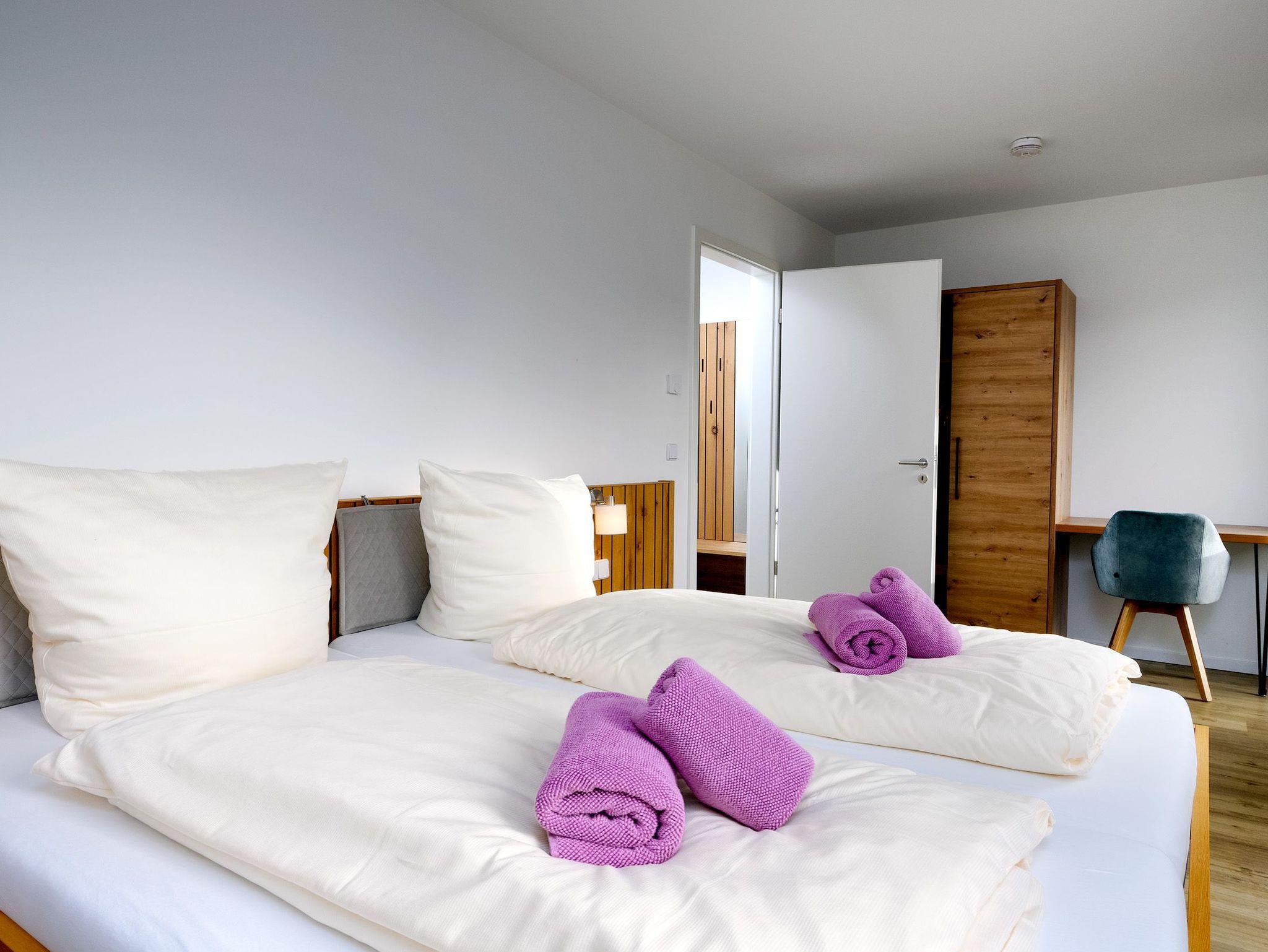 Die neue & hochwertig ausgestattete Ferienwohnung verfügt über zwei Schlafzimmer, jeweils mit Doppelbett (200 × 180) sowie ein Badezimmer mit Dusche, Badewanne & WC sowie Fön.
