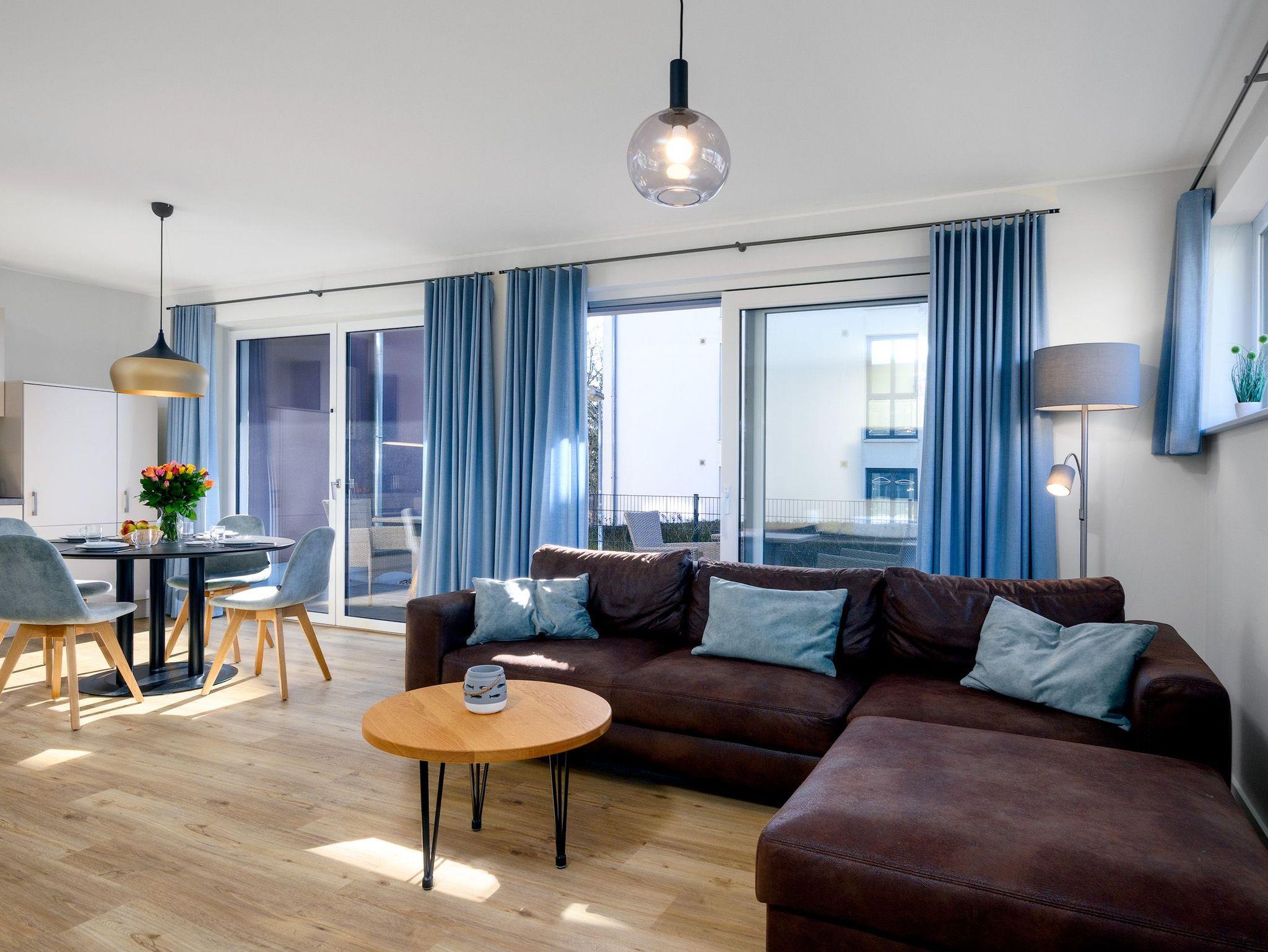 Darüber hinaus gibt es einen hellen Wohnraum mit Küche, Loungebereich und Esstisch sowie einem großen Süd-Balkon bzw. Terrasse, um die Ostseeluft zu genießen. Gerne stellen wir Ihnen ein Kinderbett und einen Hochstuhl zur Verfügung.
