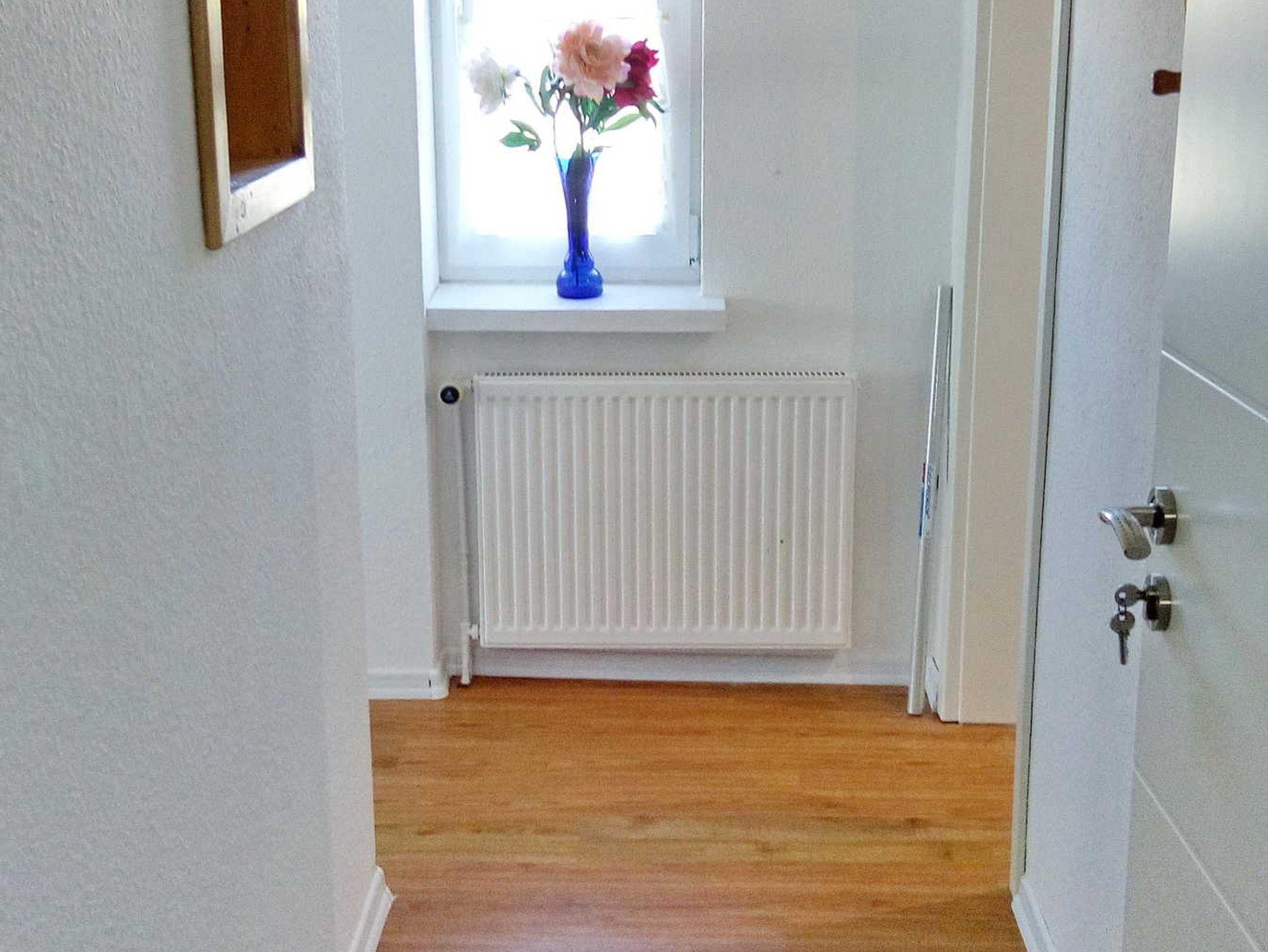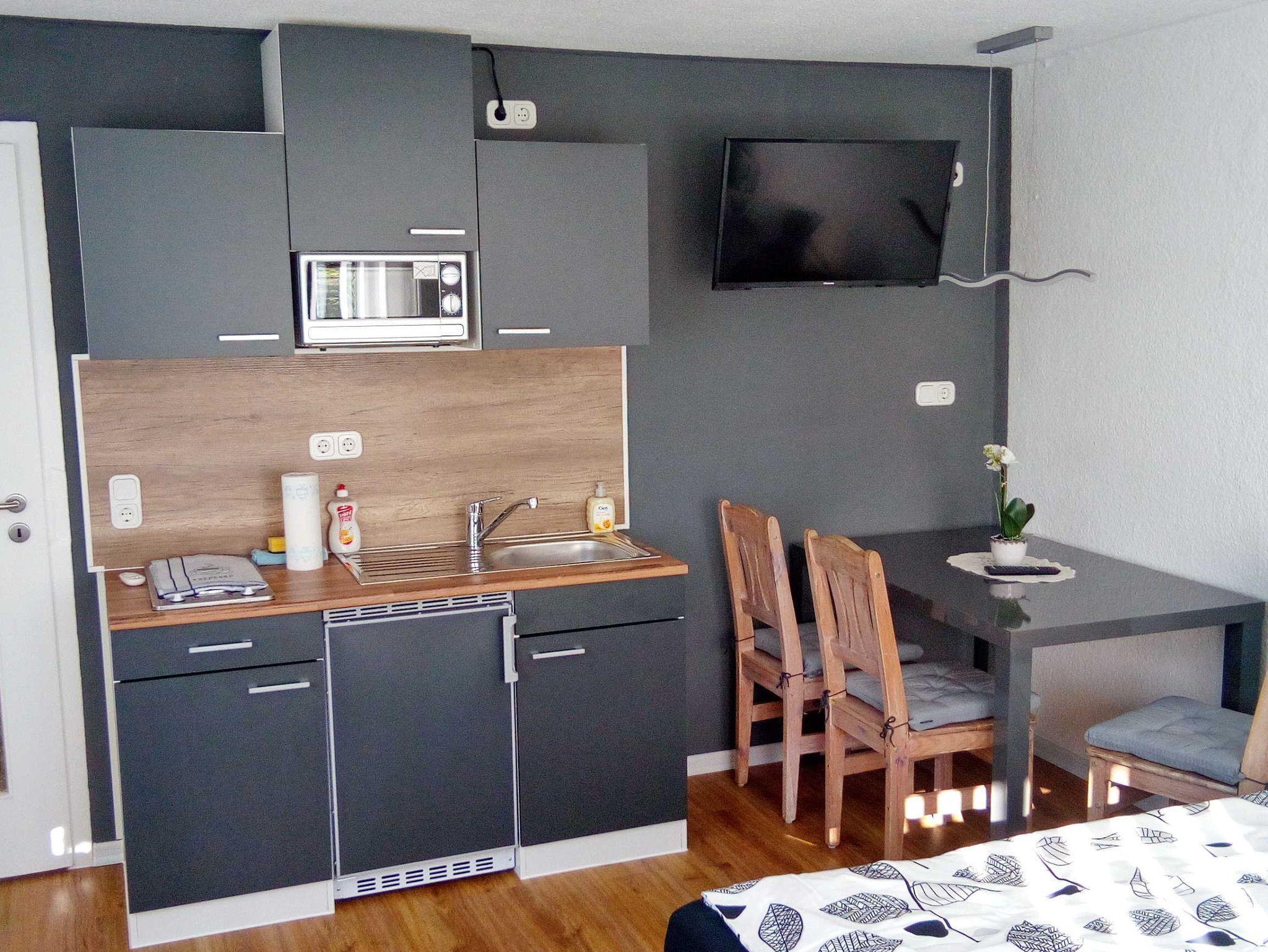 Unsere einfach gehaltene 1-Raum-Ferienwohnung besteht neben der obigen Ausstattung aus Wohn-/Schlafraum, Flur und Badezimmer. Die Gemeinschaftsküche mit unserem Aufenthaltsraum lädt zum Frühstück und Speisen ein.