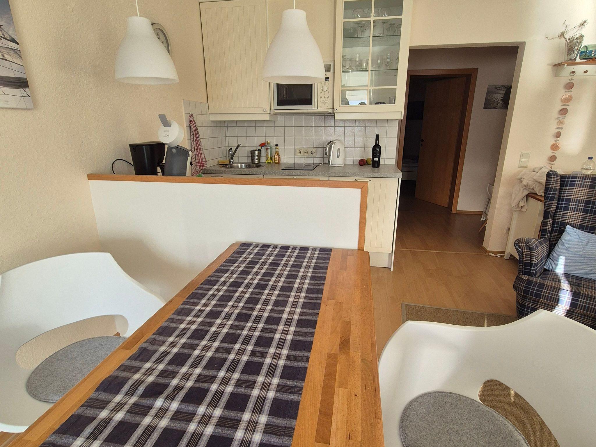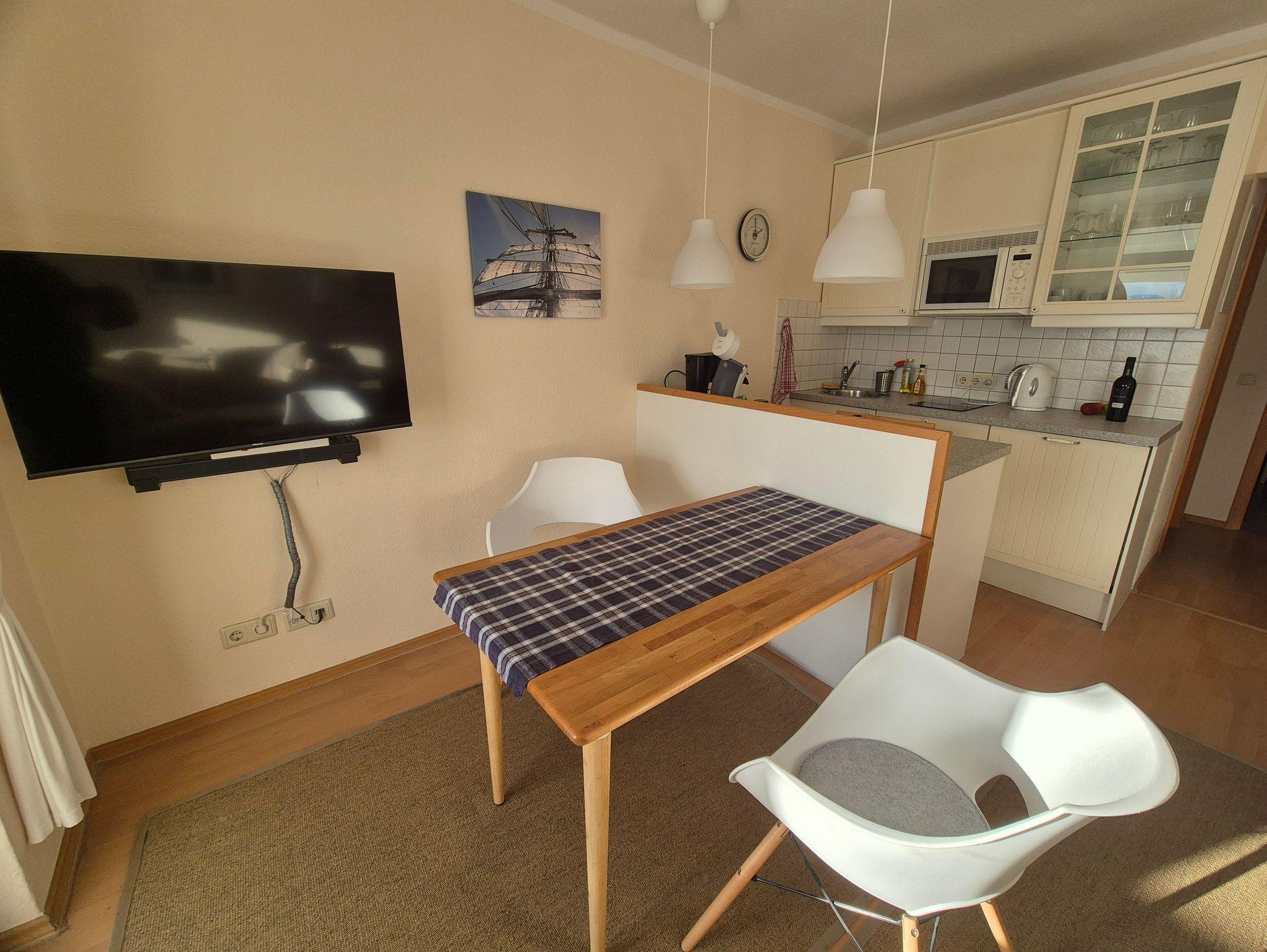 • Im Wohnzimmer befindet sich eine integrierte Küchenzeile mit 2-Plattenherd, Kühlschrank, Toaster, Wasserkocher und Kaffeemaschine.
