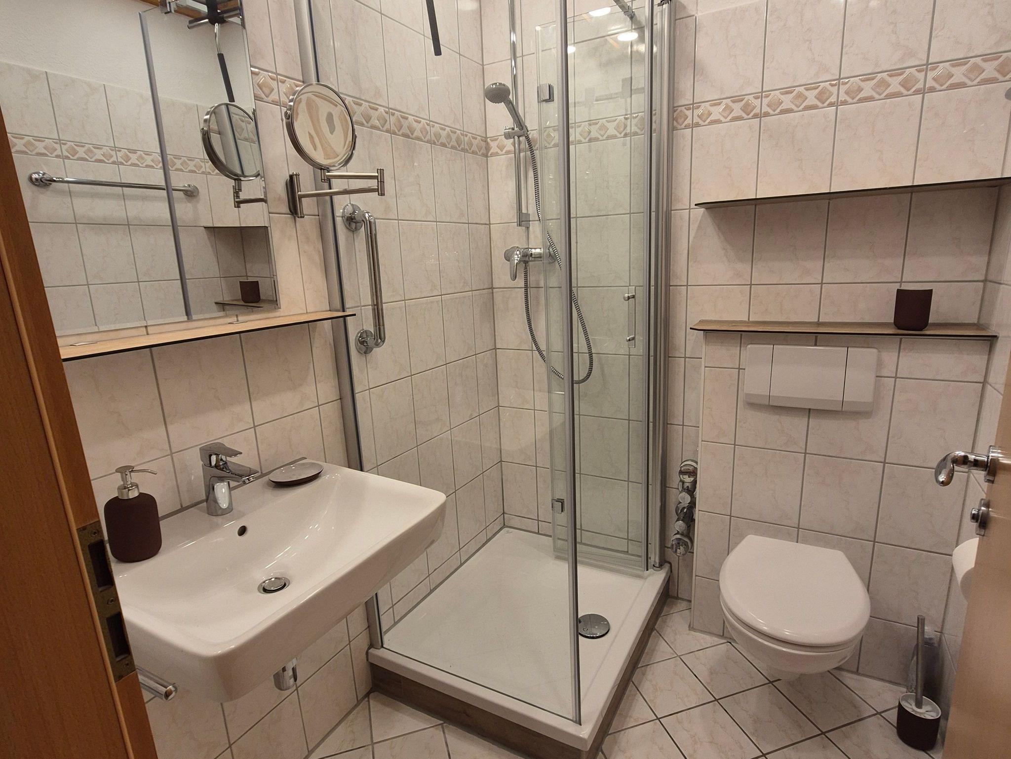 • Das Bad ist mit Dusche, WC und Fön ausgestattet. Pro Person liegen für Sie ein großes und ein kleines Handtuch bereit.