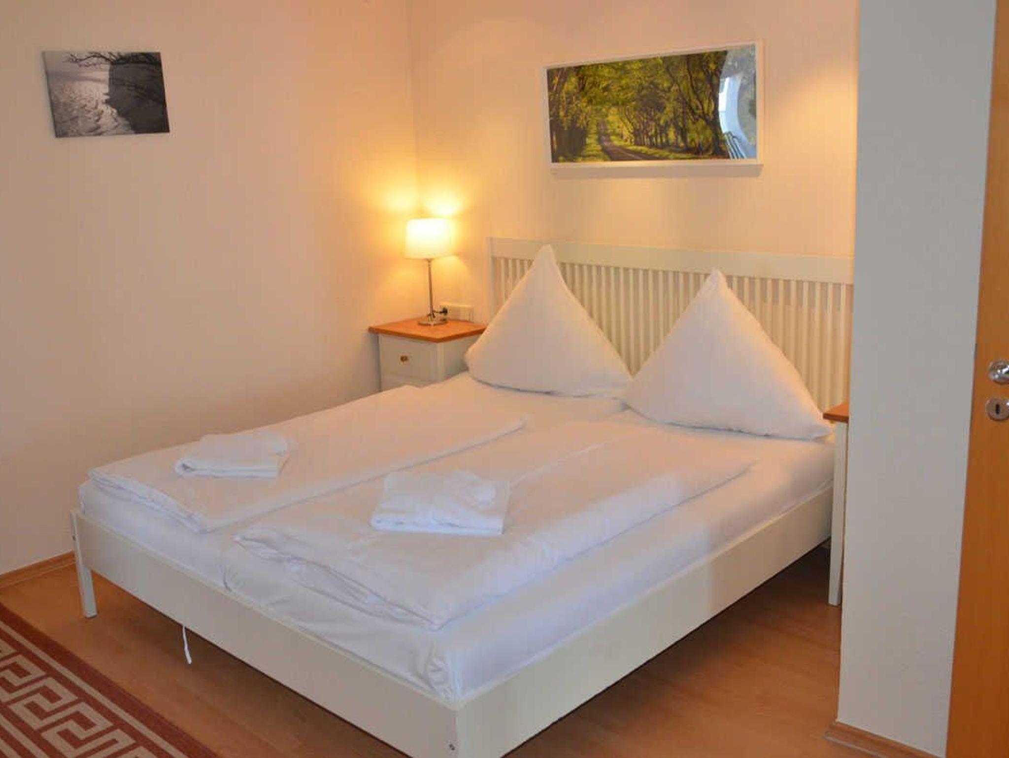 • Das Schlafzimmer ist mit einem bezogenen Doppelbett ausgestattet und verfügt über ausreichend Stauraum für Ihr Gepäck/Garderobe.