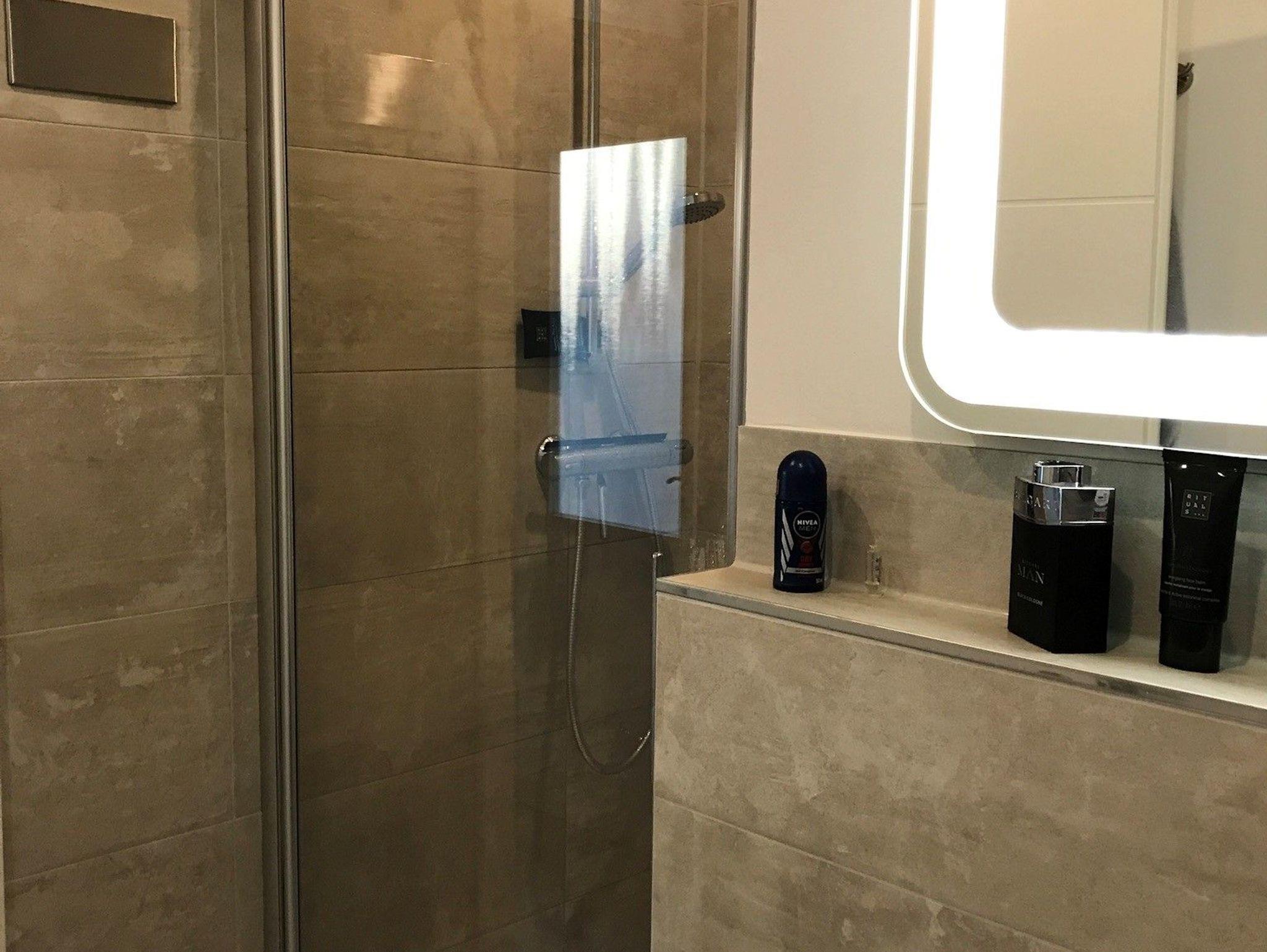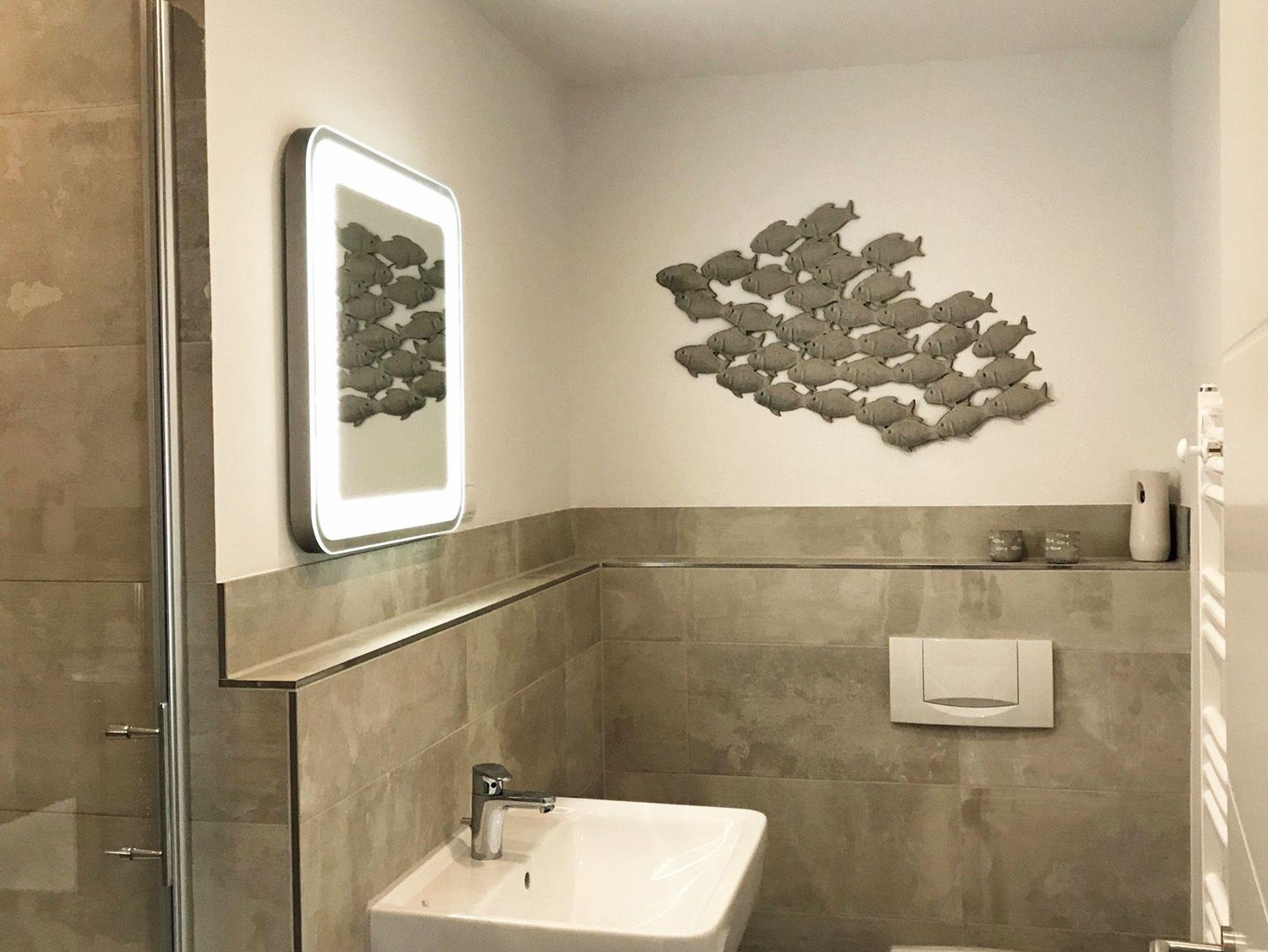 • Das Badezimmer bietet eine ebenerdige Dusche, Toilette, Waschtisch, Handtuchtrockner und Fön.