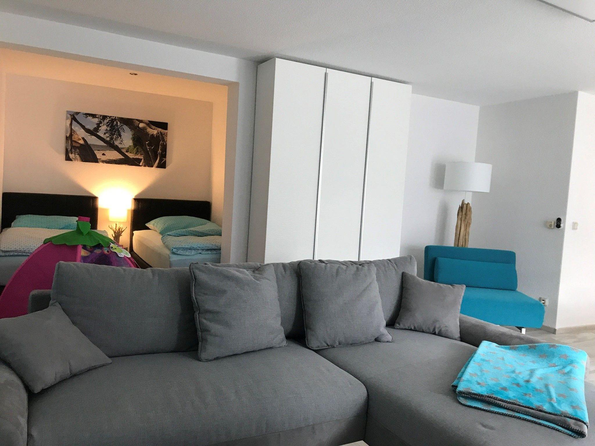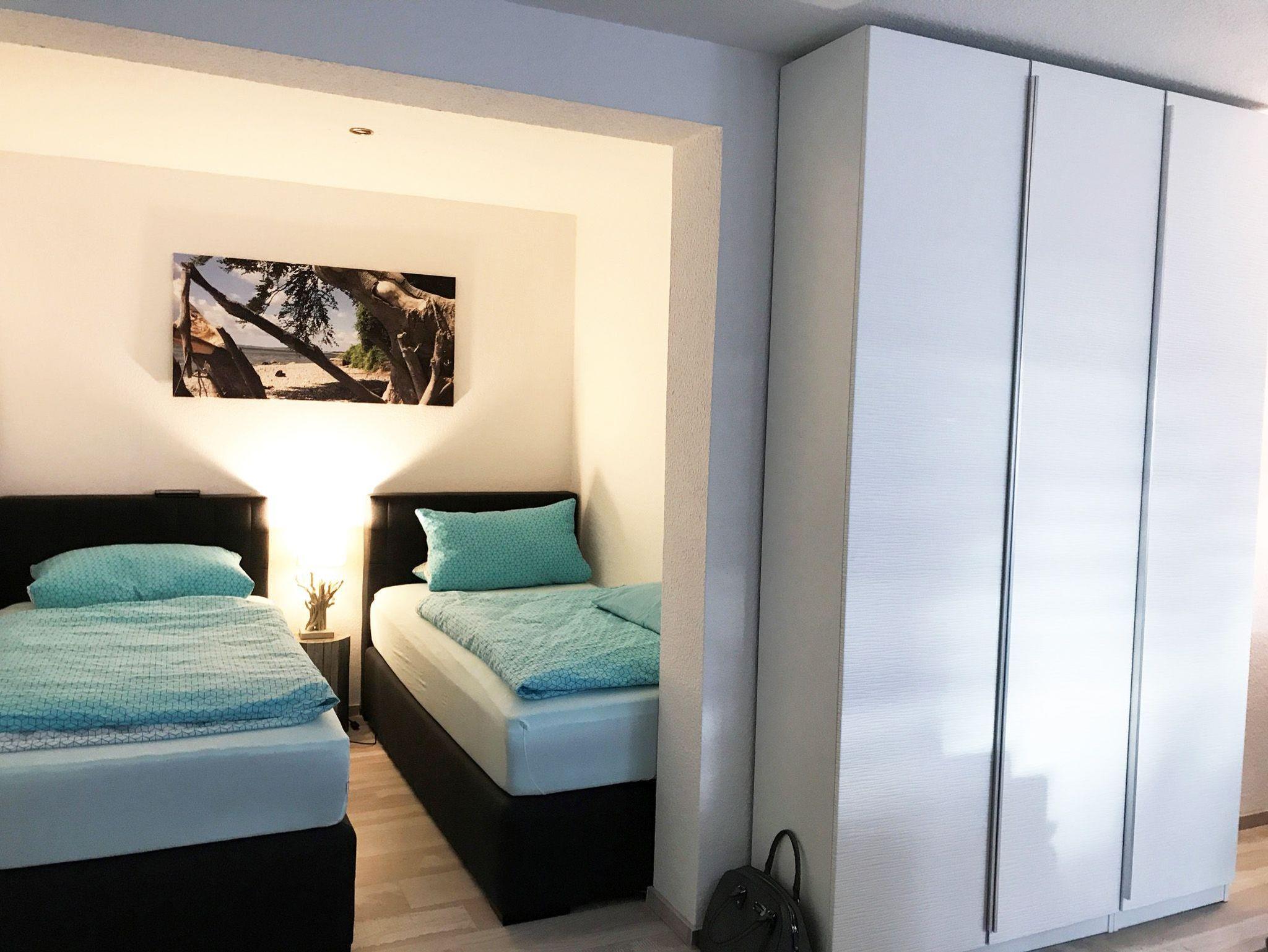 • Schlafnische mit 2 Einzelbetten, Nachtschrank und Leselampe. Für die 3. Person ist eine Aufbettung auf einem Schlafsessel im Wohnzimmer möglich.