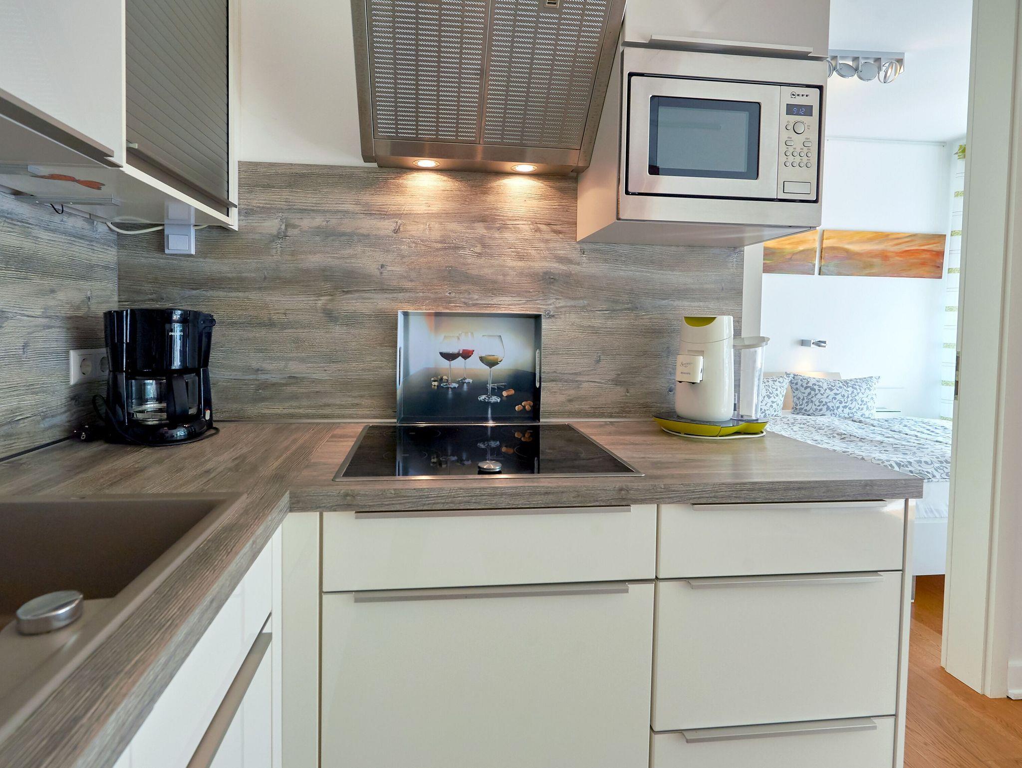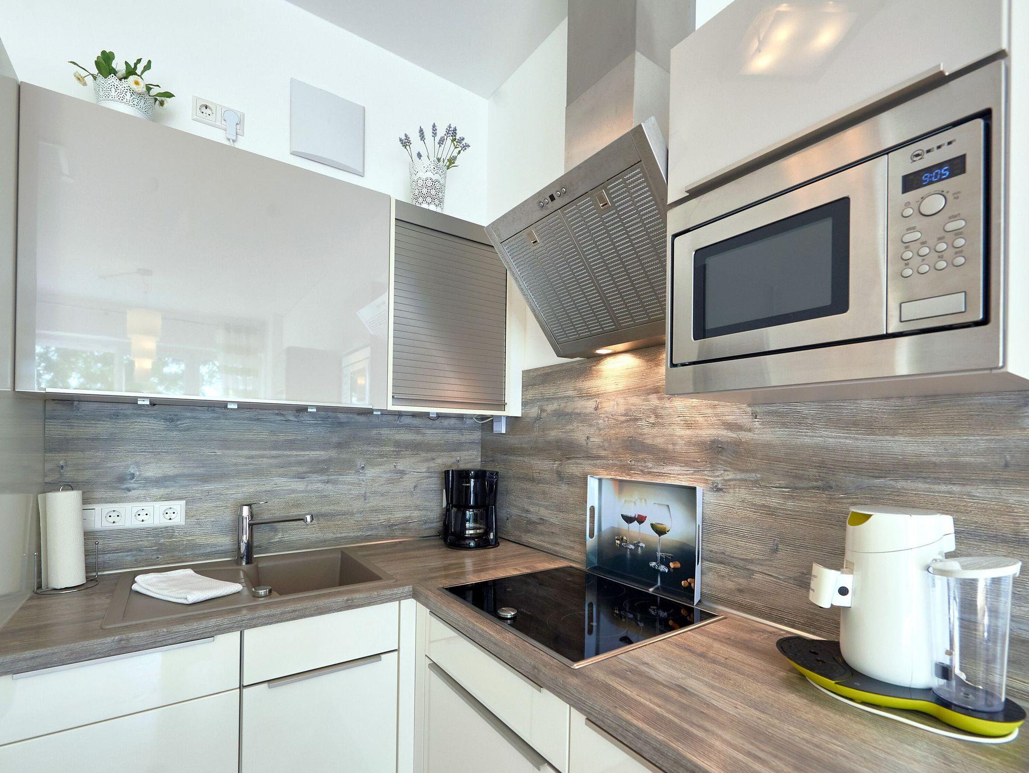? offener, komfortabel ausgestatteter Küchenbereich (Induktionskochfeld, Backofen, Mikrowelle, Geschirrspüler, Senseo Kaffeemaschine)