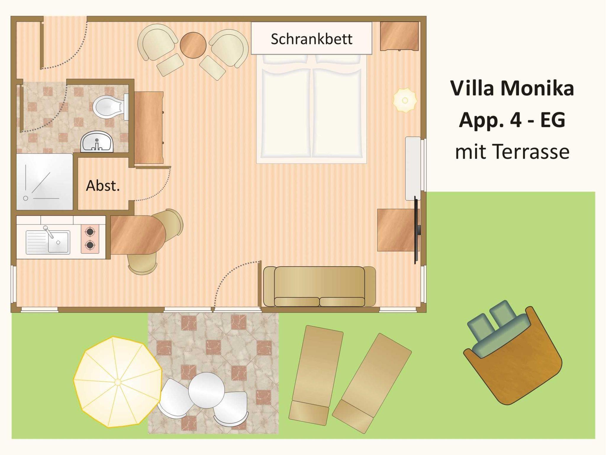 Das gemütliche 1-Raum-Appartement hat eine Größe von ca. 43 qm und befindet sich im Erdgeschoss der Villa Monika, zur straßenabgewandten Seite. Es besteht aus einem kombinierten Wohn-Schlafraum, einer kleinen Küchenzeile (mit Geschirrspüler), einer Essecke und einem Bad mit Dusche/WC. Über den Terrassenausgang gelangen Sie in den eigenen kleinen Garten. Hier befinden sich nochmals ein Tisch mit 2 Stühlen, 2 Sonnenliegen und ein Strandkorb zum Relaxen.
