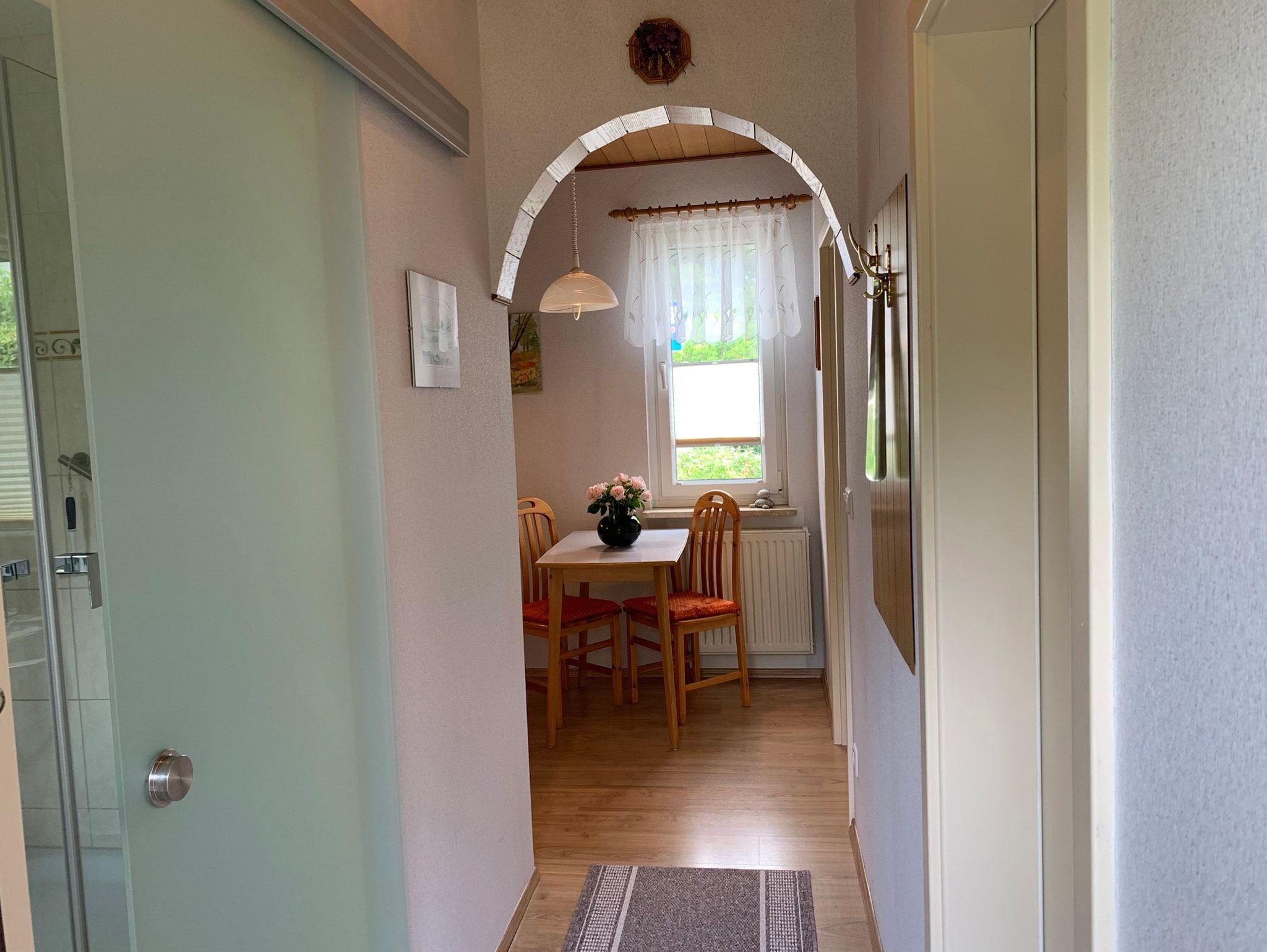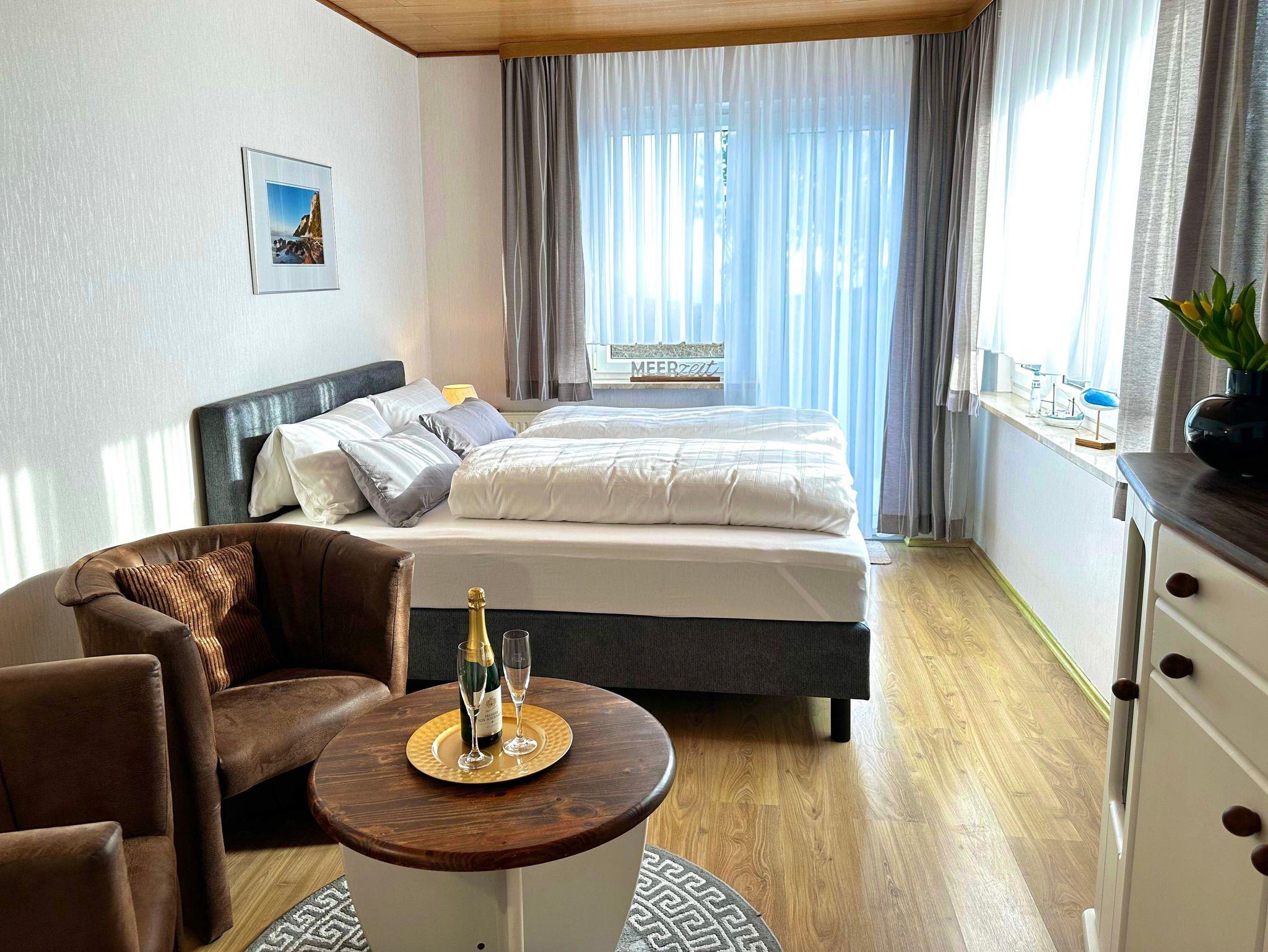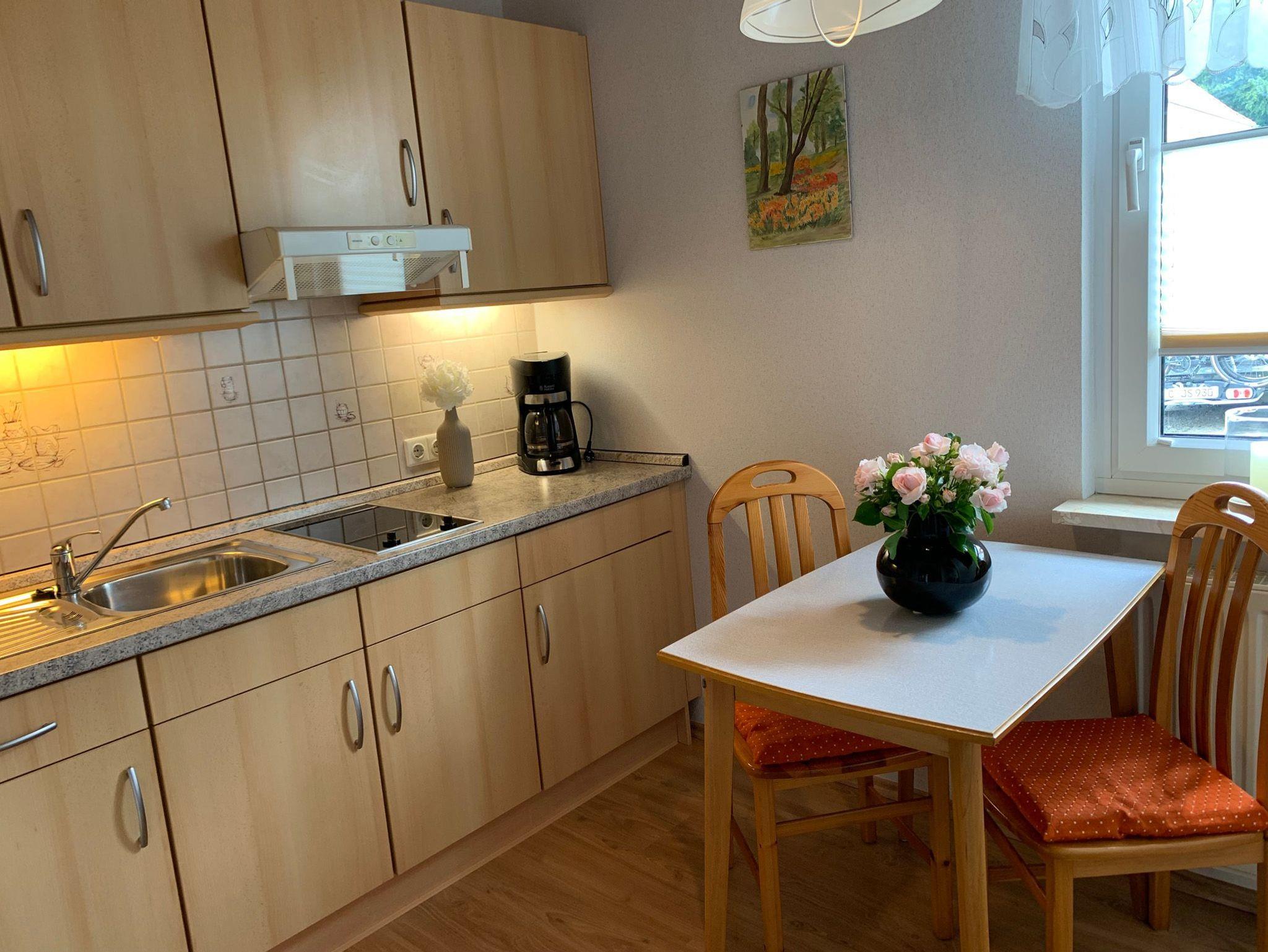 Die Unterkünft verfügt außerdem über einem separaten Schlafraum, einen gut ausgestatteten Küchbereich (Ceranfeld, Kaffeemaschine, Toaster, Kühlschrank und Sitzmöglichkeit) und ein schickes Duschbad mit ebenerdigem Einstieg.