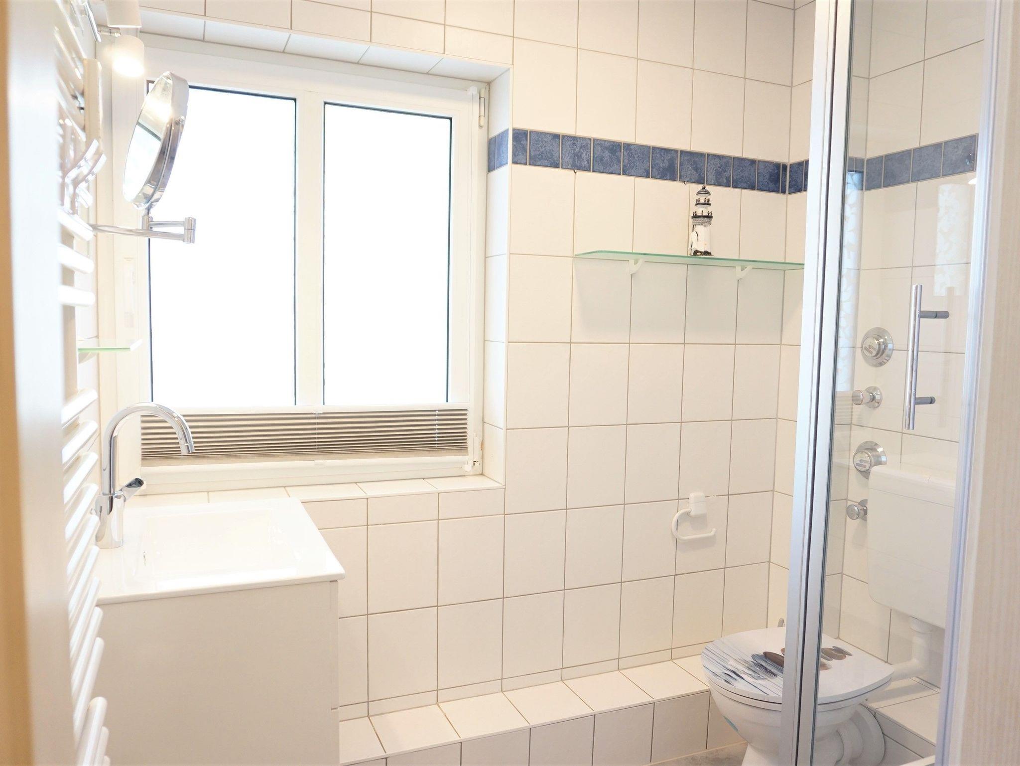Das helle Tageslicht-Badezimmer (ebenfalls renoviert) mit Dusche und WC begrüßt sie am Morgen mit angewärmten Handtüchern. Anschließend am (ausziehbaren) Garten-Tisch auf dem Balkon gemütlich in der Sonne frühstücken > ein gelungener Start in den Tag.