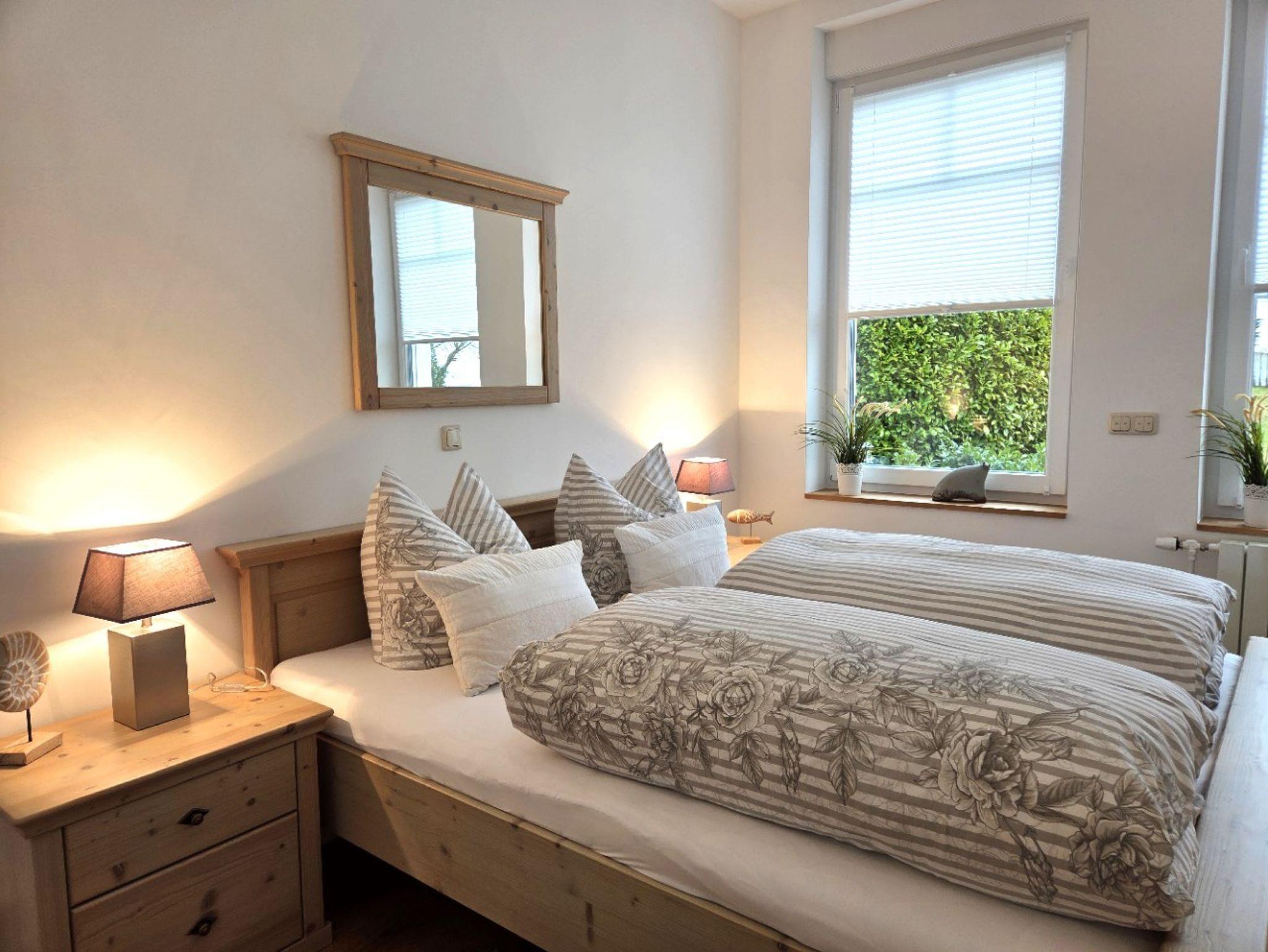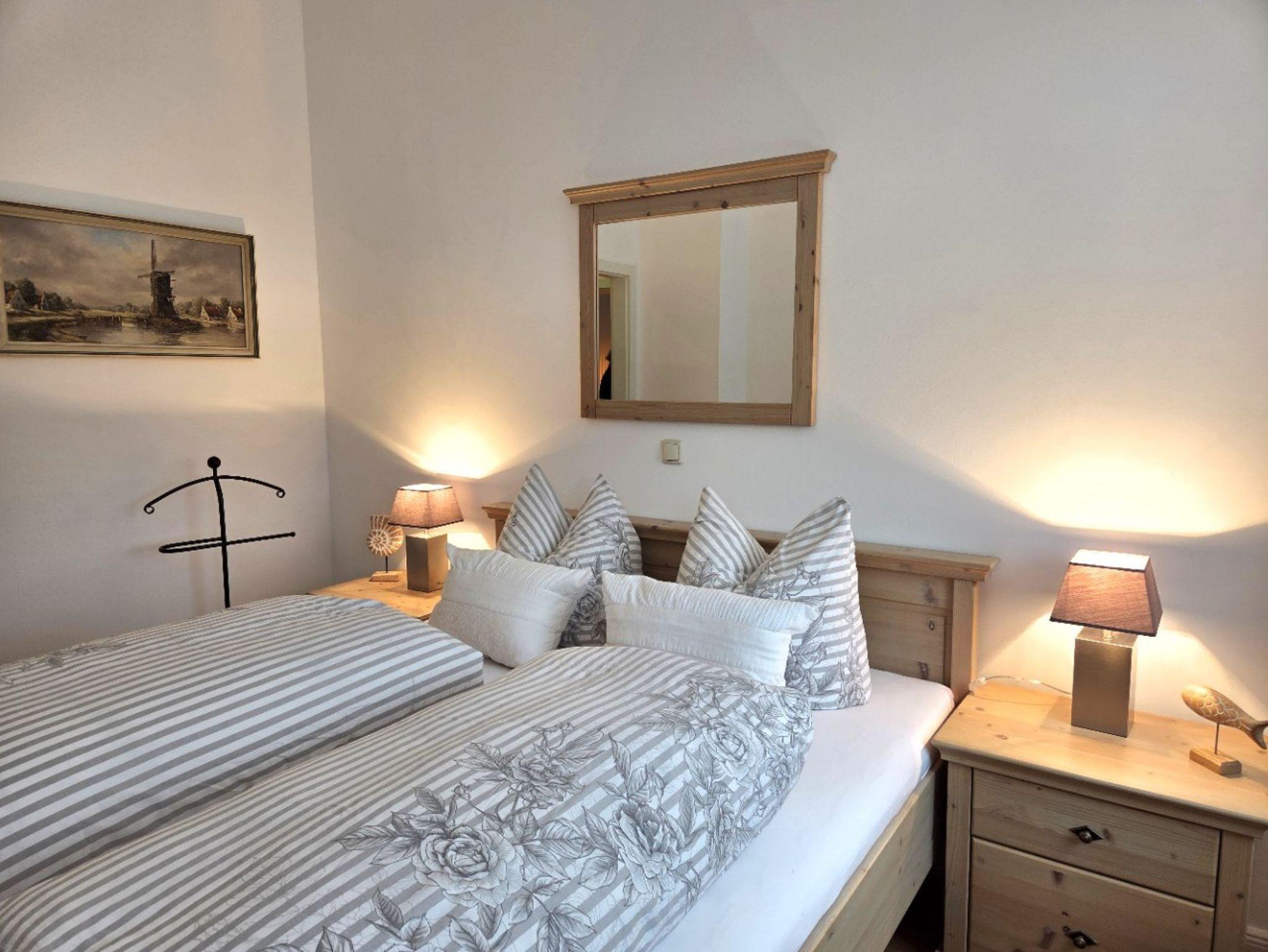 - Ein Schlafzimmer mit einem Doppelbett und Kleiderschrank. Bei Anreise sind die Betten bezogen und es liegen Handtücher bereit. Strandtücher bitte selbst mitbringen.
