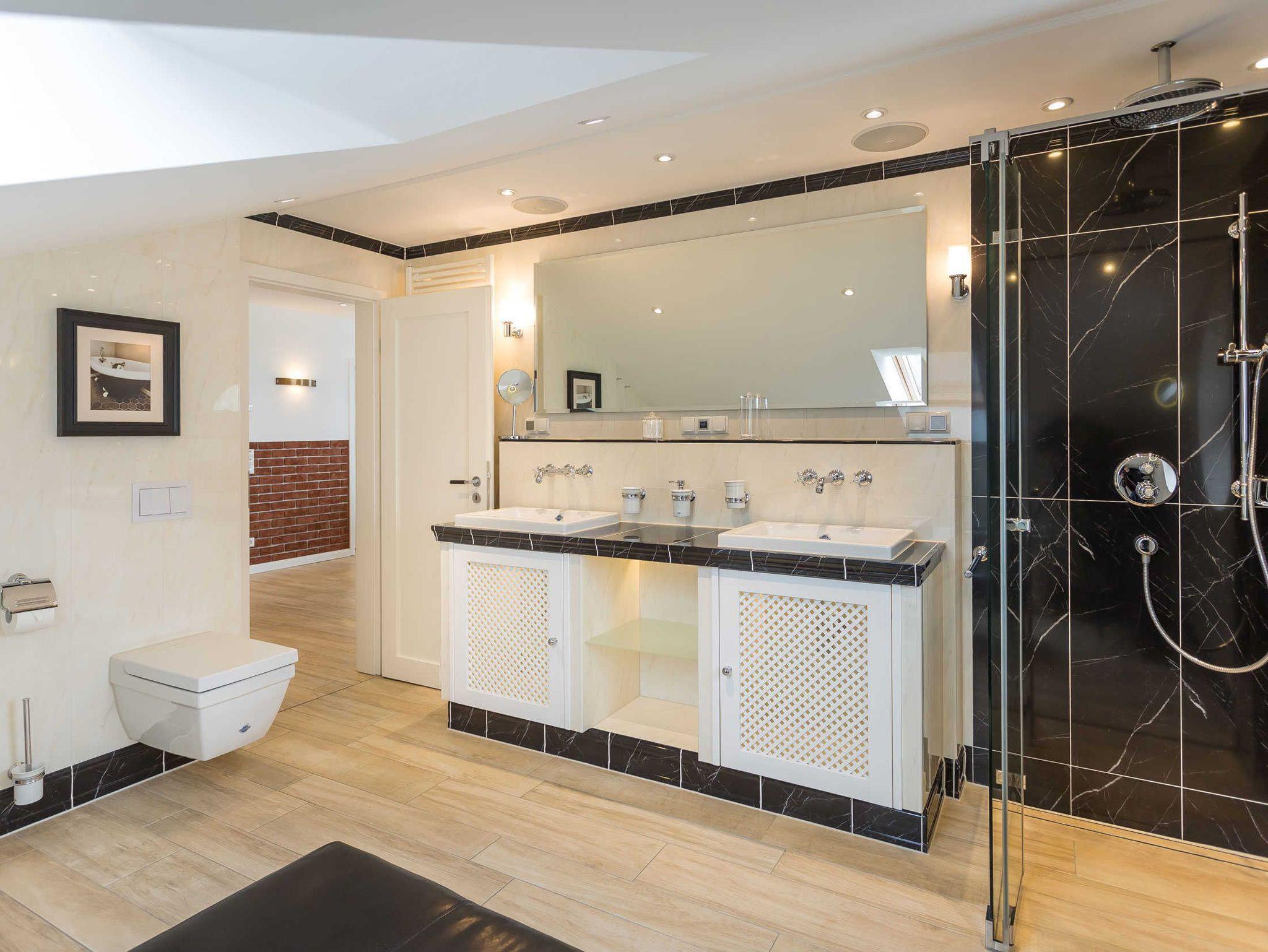 ? Moderne Bäder mit Badewanne und Wellnessdusche. Auch eine Waschmaschine steht bereit.