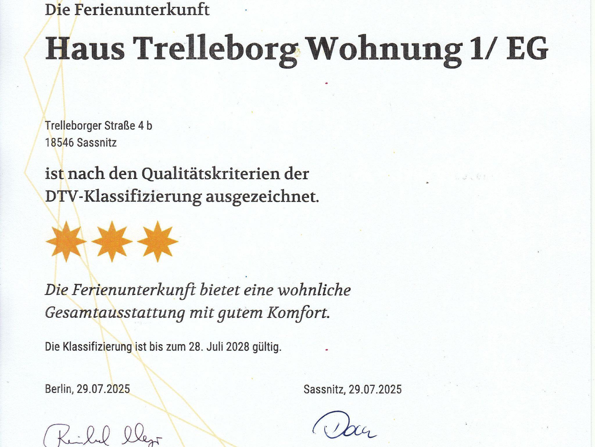 Die 55 m ² große und mit DTV Sternen klassifizierte Ferienwohnung 1 befindet sich auf der rechten Seite im Erdgeschoss im Ferienhaus Trelleborg. Sie bietet mit ihren drei Zimmern ausreichend Platz für bis zu 5 Personen.