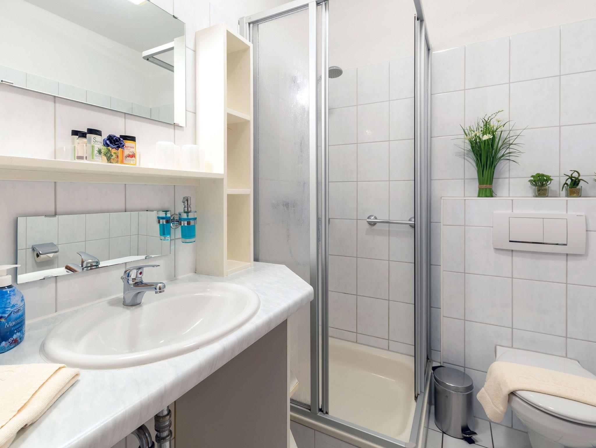 Das Badezimmer ist mit einer Dusche und WC ausgestattet. In den Schränken haben Sie genügend Stauraum für Ihre Wasch- und Kosmetikutensilien.