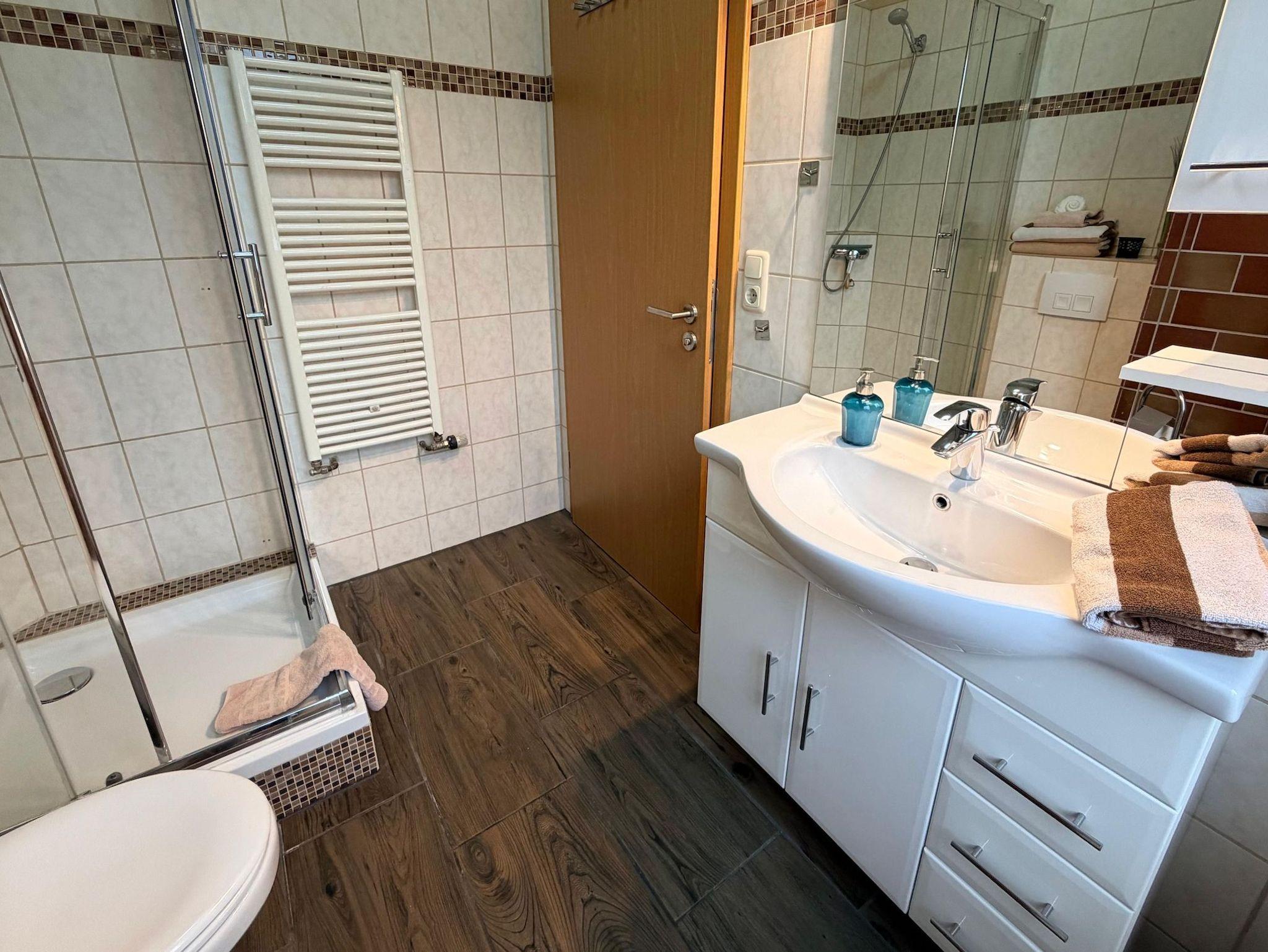 Badezimmer mit Dusche, Handtuchtrockner und Fön. WLAN und Parkplatz sind inklusive, Grillplatz mit Sitzgruppe, Haustiere willkommen (5,- Euro p. Tag und 20,00 Euro Haustierendreinigung einmalig).