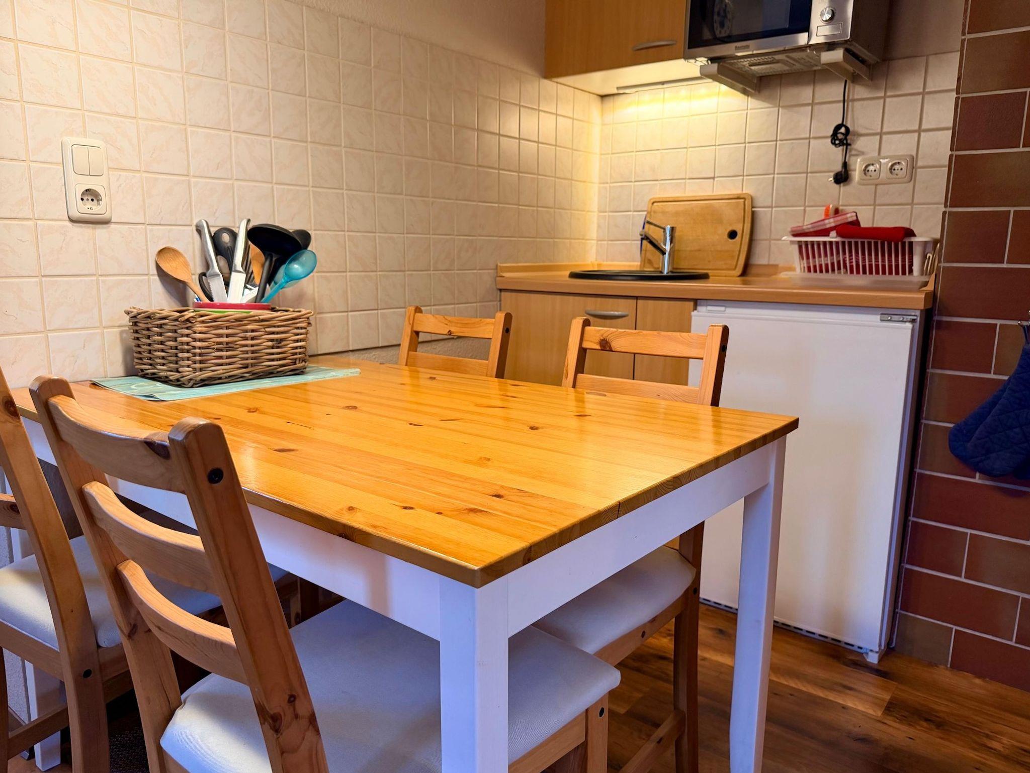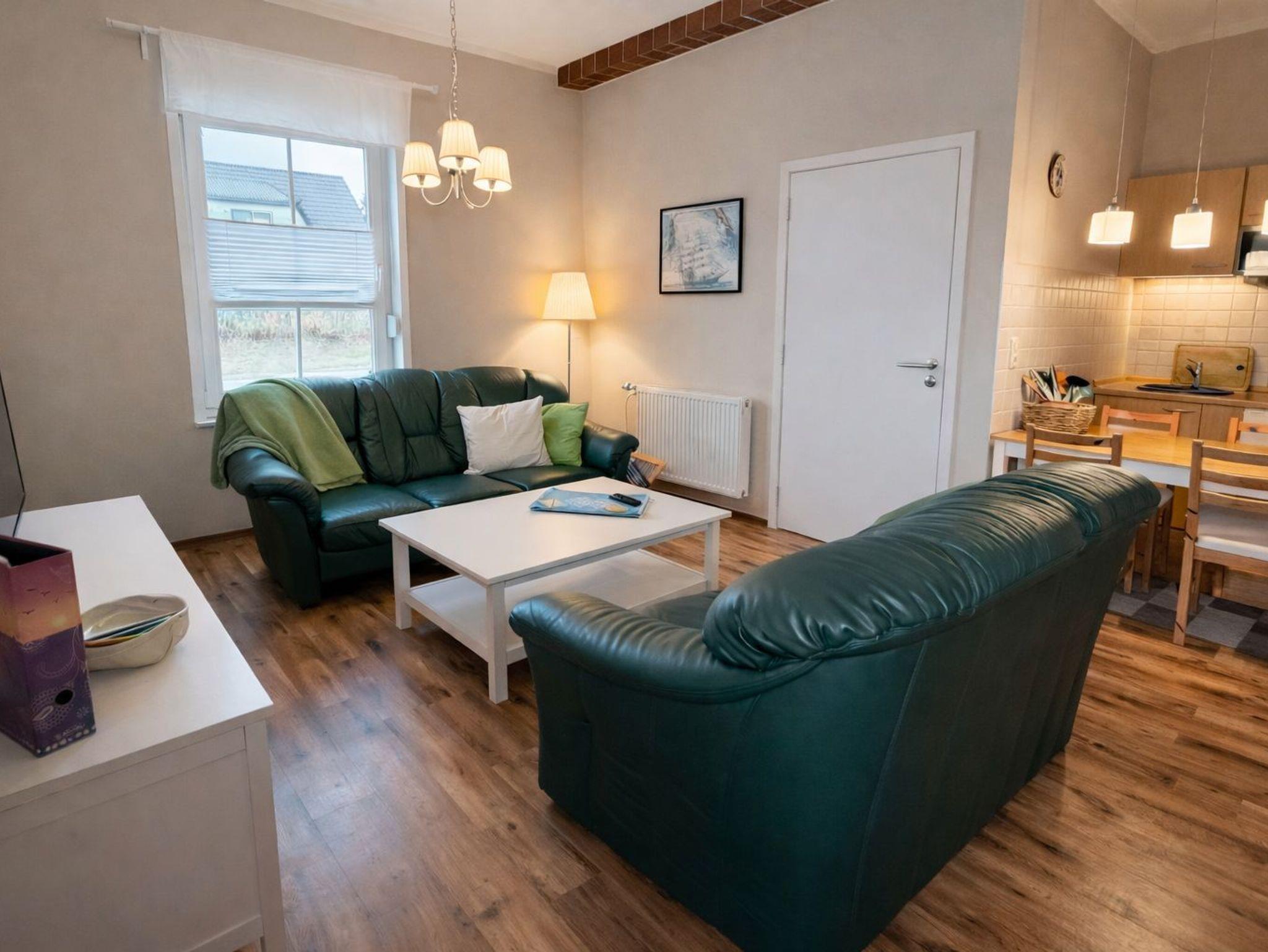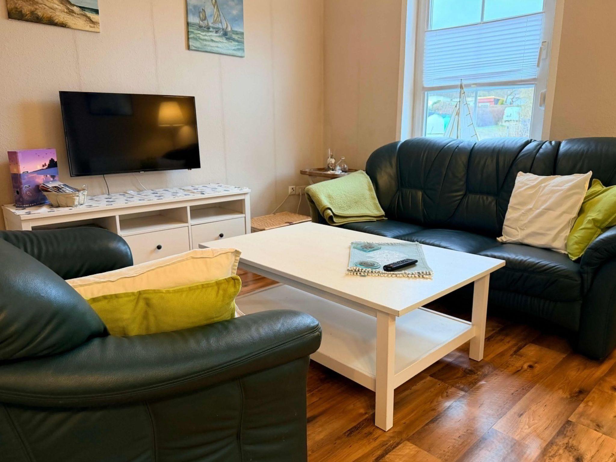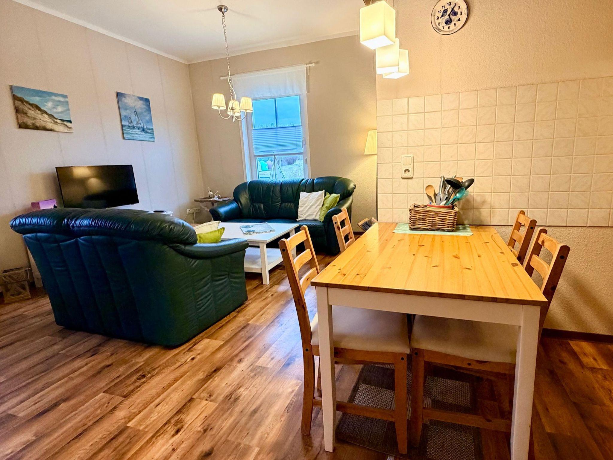 Das großzügige Wohnzimmer mit offener Küche ist gemütlich eingerichtet und lädt mit einer Sitzgruppe und großem Flachbild-TV zu entspannten Abenden ein. Die Küche bietet einen Essplatz für vier Personen sowie Backofen, Cerankochfeld und Mikrowelle – ideal für gemeinsame Mahlzeiten.