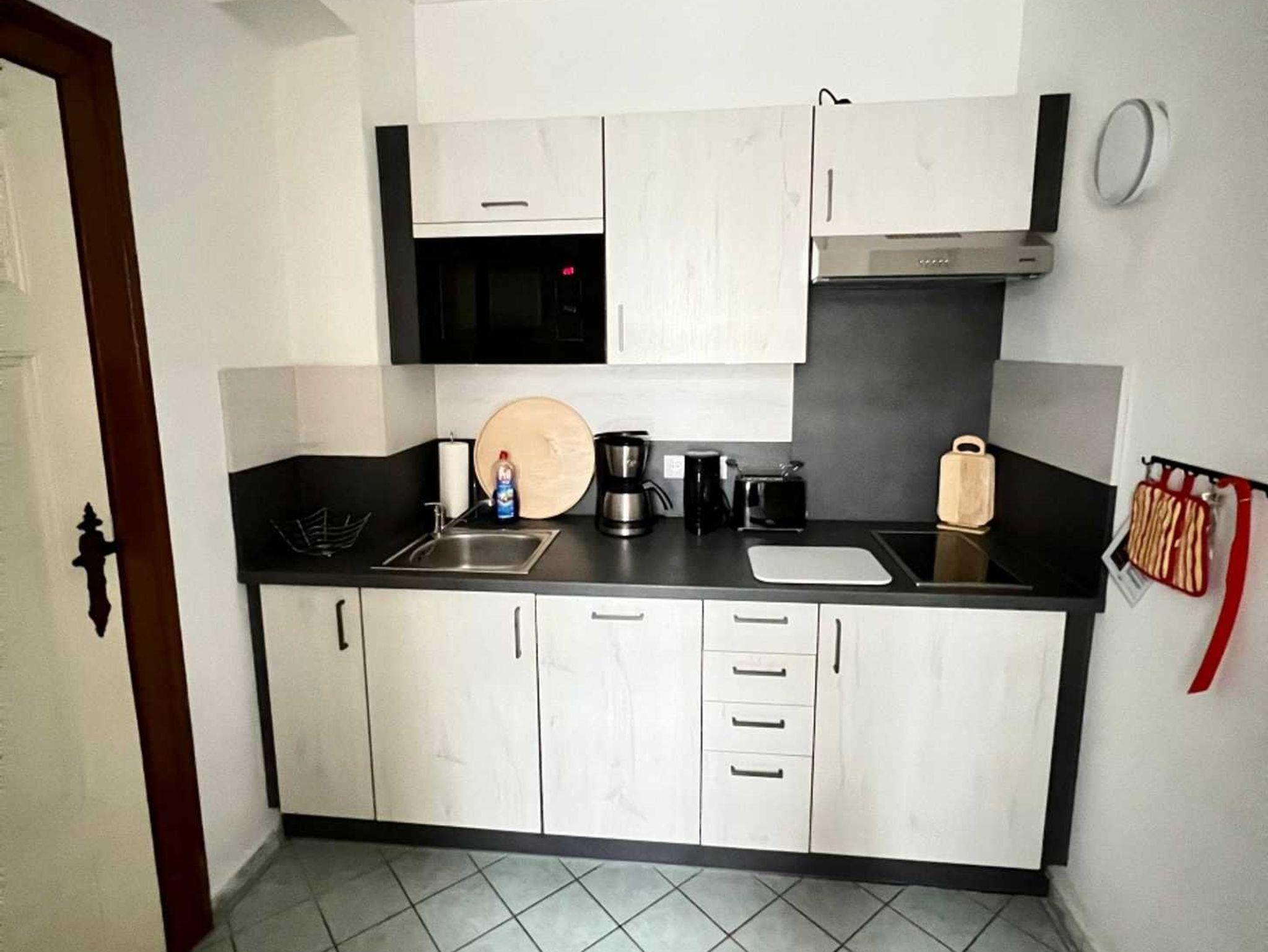 Die Ferienwohnung ist ca. 40 m² groß und besteht aus einem kombinierten Wohn- und Schlafraum mit Doppelbett und Sitzecke. Die Unterkunft ist ausgestattet mit Radio, TV, einmal Bettwäsche/Handtücher incl., Du/WC, kleine Küchenzeile mit Zweiplatten - Cerankochfeld, Mikrowelle, Geschirrspüler und Kühlschrank. Eine Aufbettung auf einem Zustellbett ist möglich und ein Babybett ist vorhanden. Im Garten steht Ihnen eine Sitzecke mit Grill zur Verfügung.
