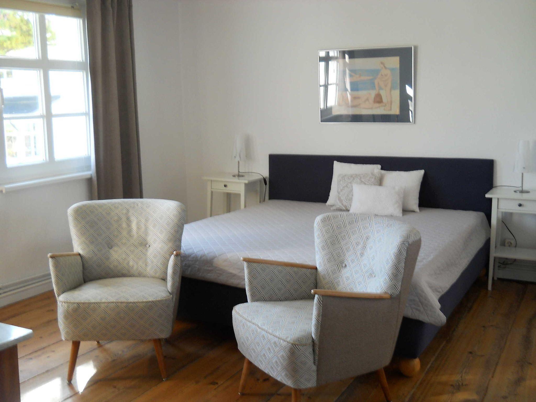 - ein großes helles Wohnschlafzimmer mit Meerblick von 17 qm mit Doppelbett ( 180 cm ), einer gemütlichen Sitzecke mit TV-Sat und Blick über die Altstadthäuser