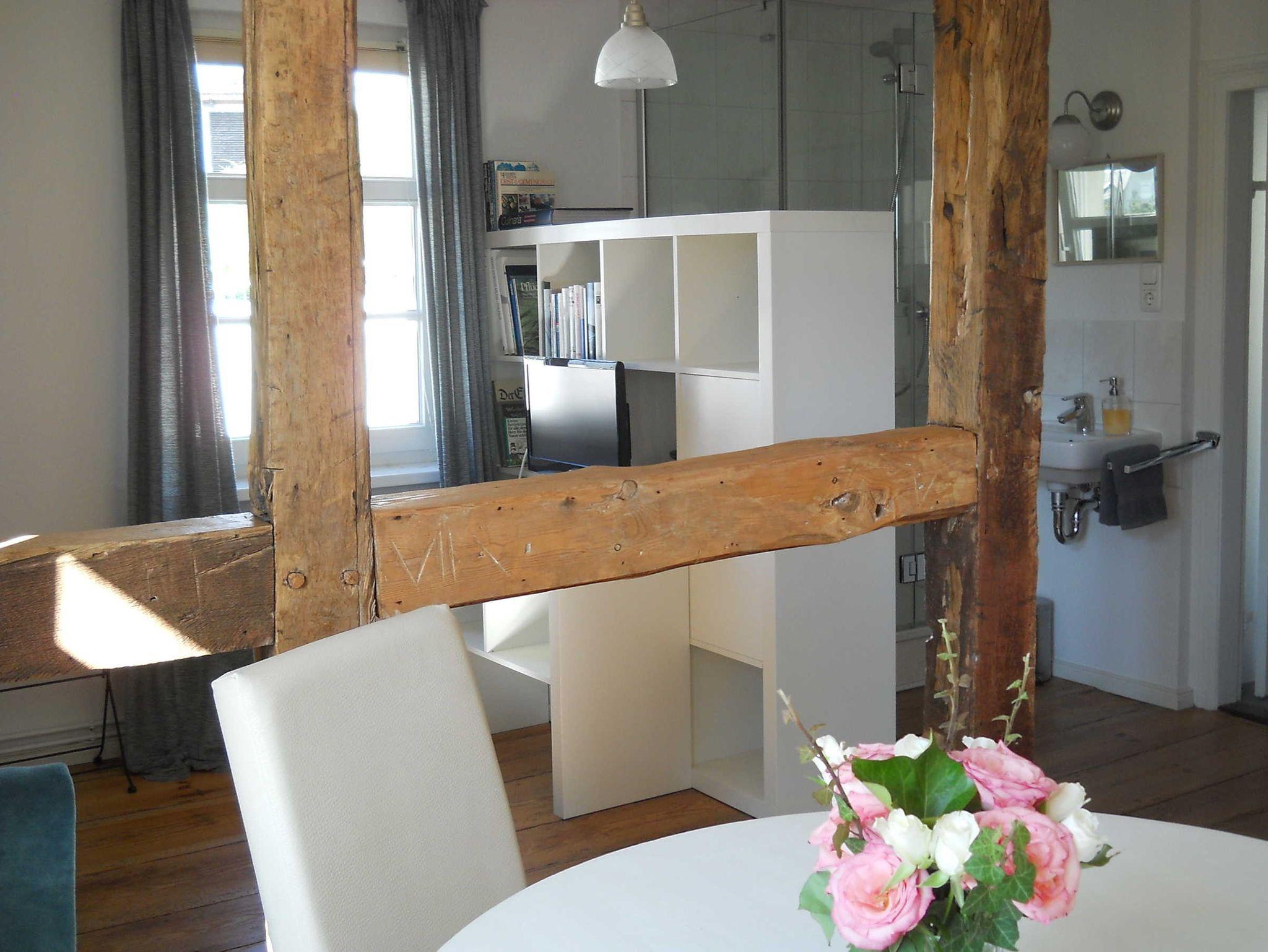 - ein offenes Fachwerk hat den besonderen Reiz und verbindet eine gemütliche Ruhezone mit Schlafcouch, angrenzend durch einen Raumteiler abgeschirmt, eine große Dusche und Waschbecken