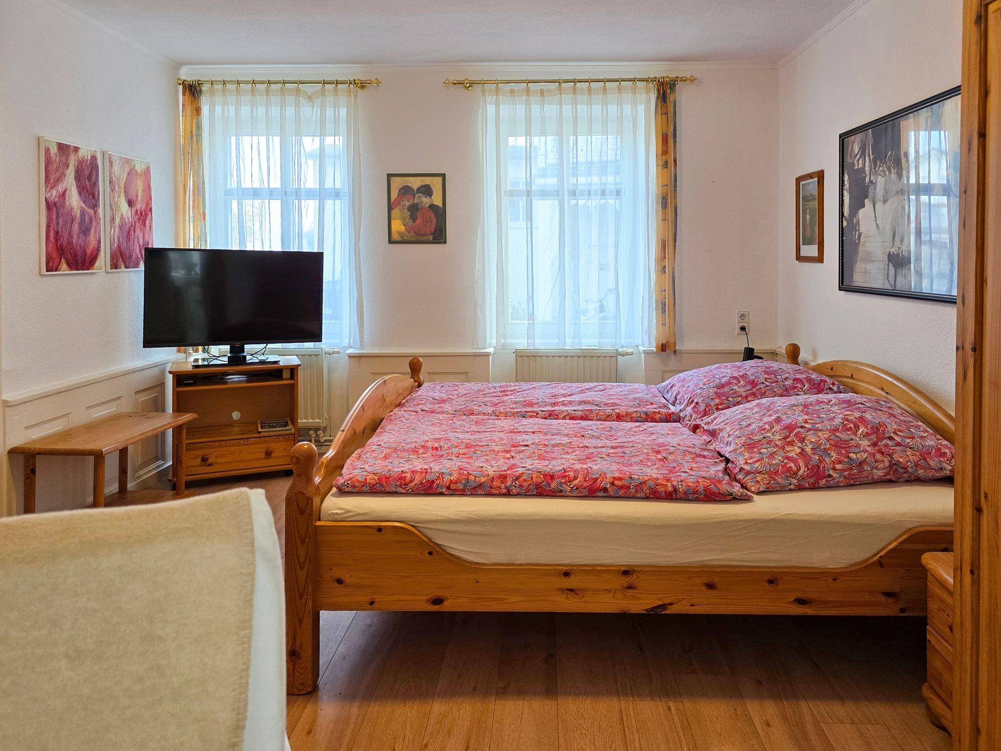 - Kombinierter Wohnschlafraum mit Doppelbett, Nachtschränkchen, Kleiderschrank, einer kleiner Sitzgruppe und Flachbild-TV.