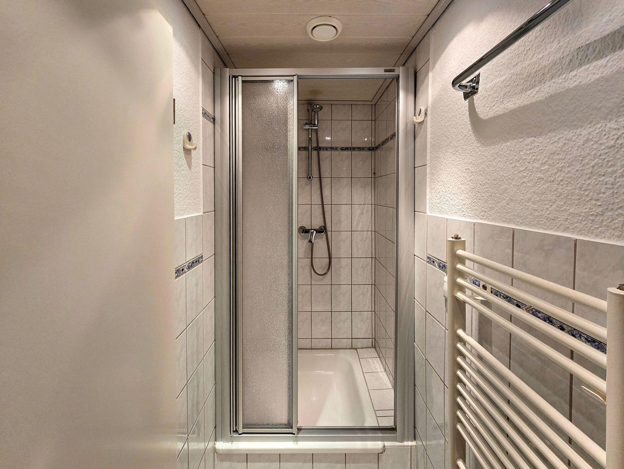 - Das Bad ist mit Dusche und Waschtisch ausgestattet. Das separate WC befindet sich über den Flur im Treppenhaus.