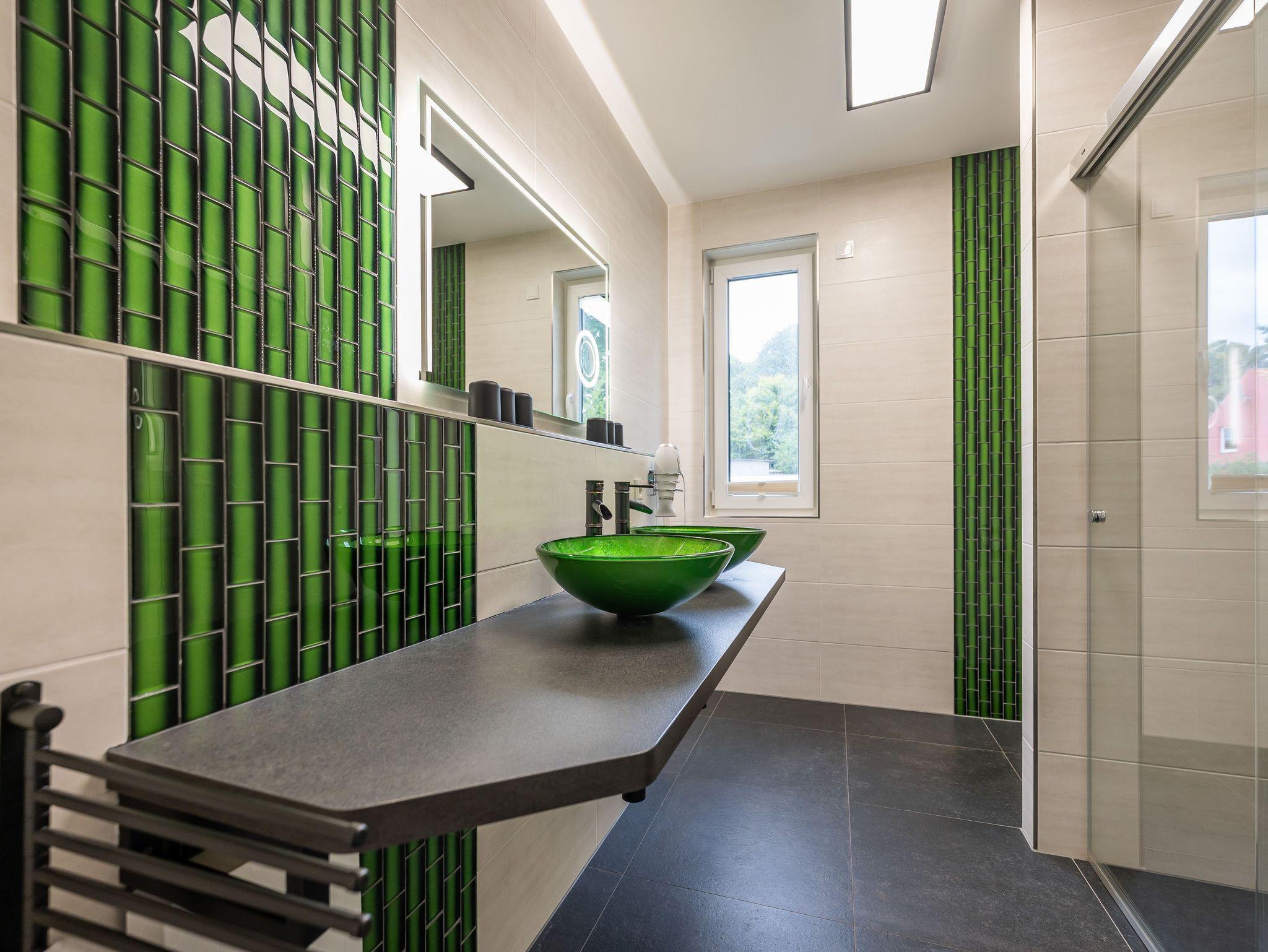 Im Bad befindet sich eine große ebenerdige Regendusche und zwei Waschbecken.