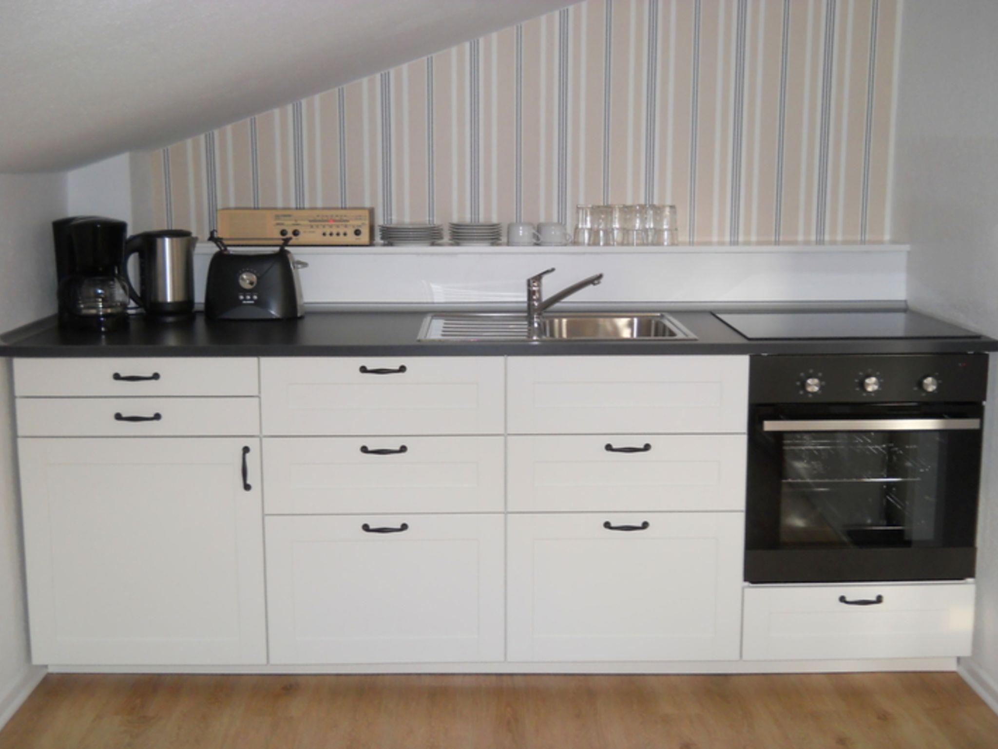 - eine voll eingerichtete Küche (Herd mit 4 Ceranfeldern, Backofen, Kühlschrank, Tiefkühlfach, Kaffeemaschine, Wasserkocher, Toaster)