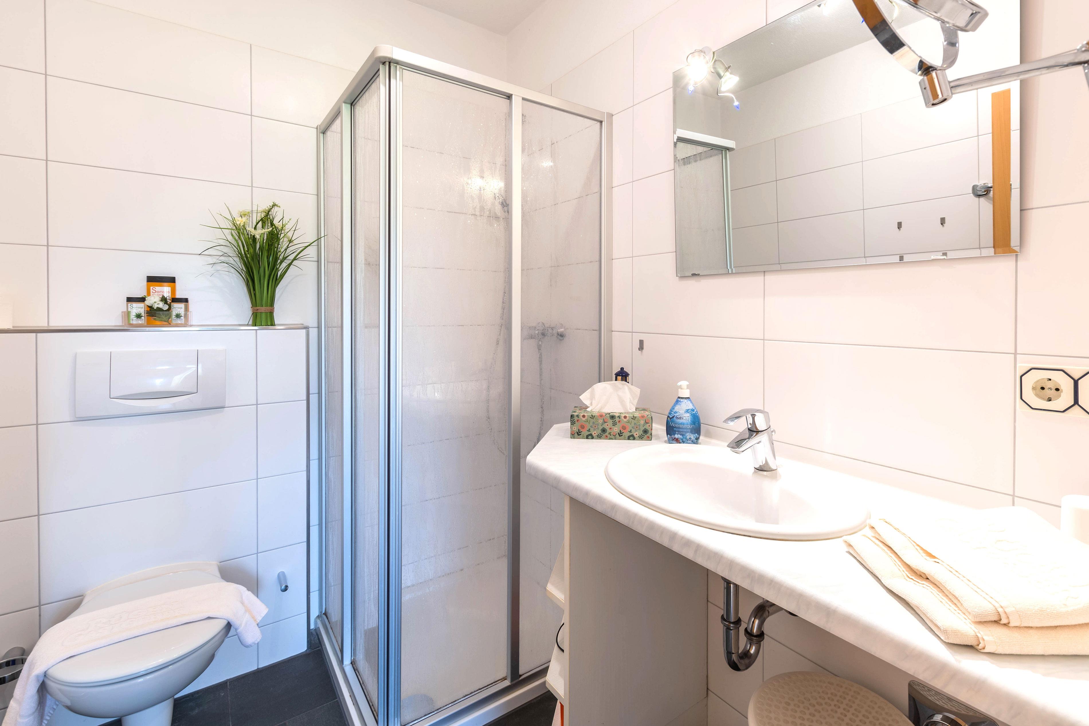 Das Badezimmer ist mit einer Dusche und WC ausgestattet. In den Schränken haben Sie genügend Stauraum für Ihre Wasch- und Kosmetikutensilien.