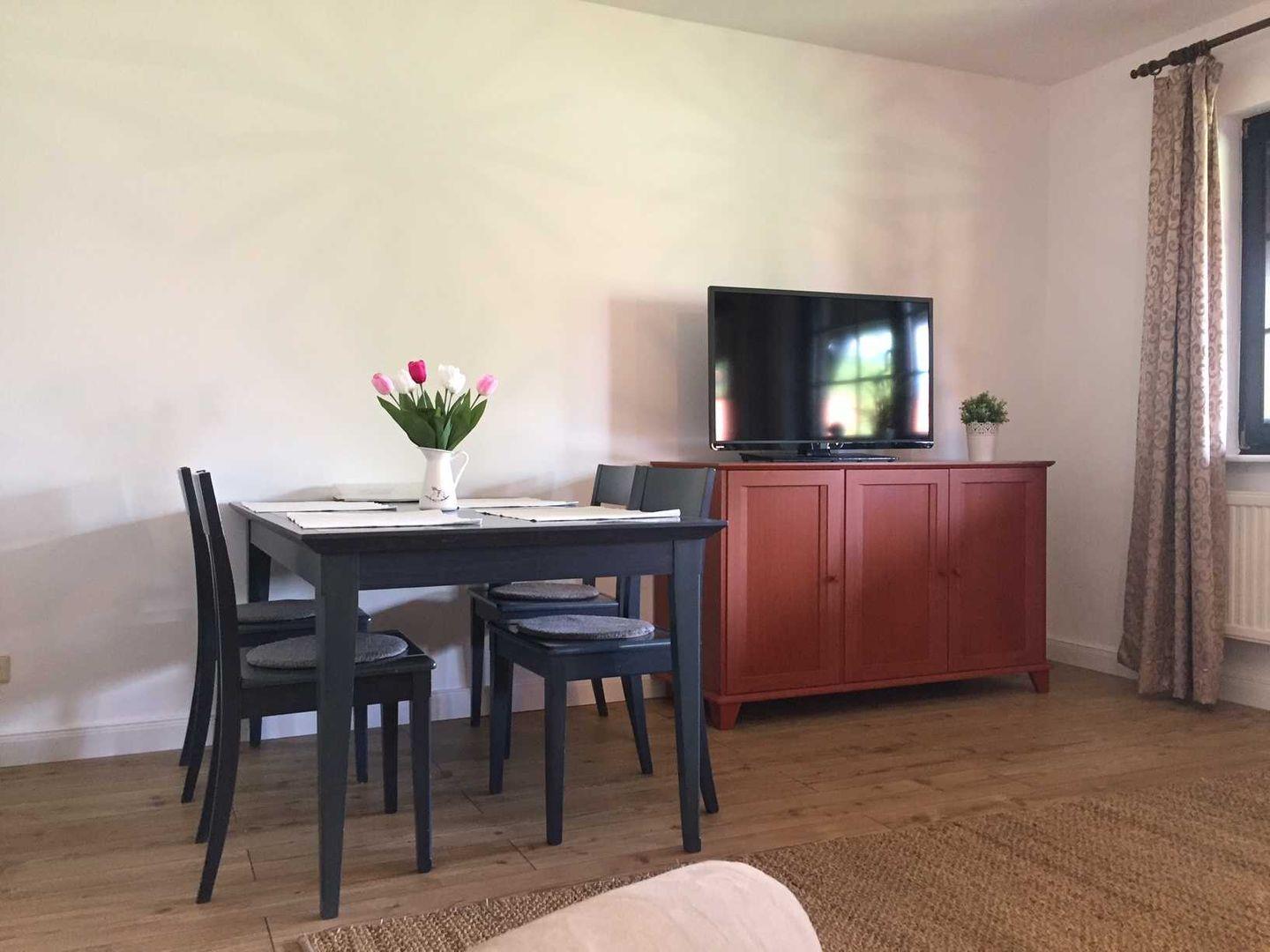 Die 2016 umfangreich renovierte Ferienwohnung befindet sich im 1.OG und hat eine Grundfläche von ca. 60 m². Das Wohnzimmer ist mit einem Tagesbett als Aufbettungsmöglichkeit für die dritte und vierte Person ausgestattet. Ein Flachbild - TV steht Ihnen für beschauliche Fernsehabende zur Verfügung. Zusätzlich finden Sie hier natürlich einen großen Esstisch und Kleinmöbel zur Aufbewahrung vor. Die liebevoll ausgewählten und aufeinander abgestimmten Wohnaccessoires lassen ein harmonisches Wohngefühl aufkommen.