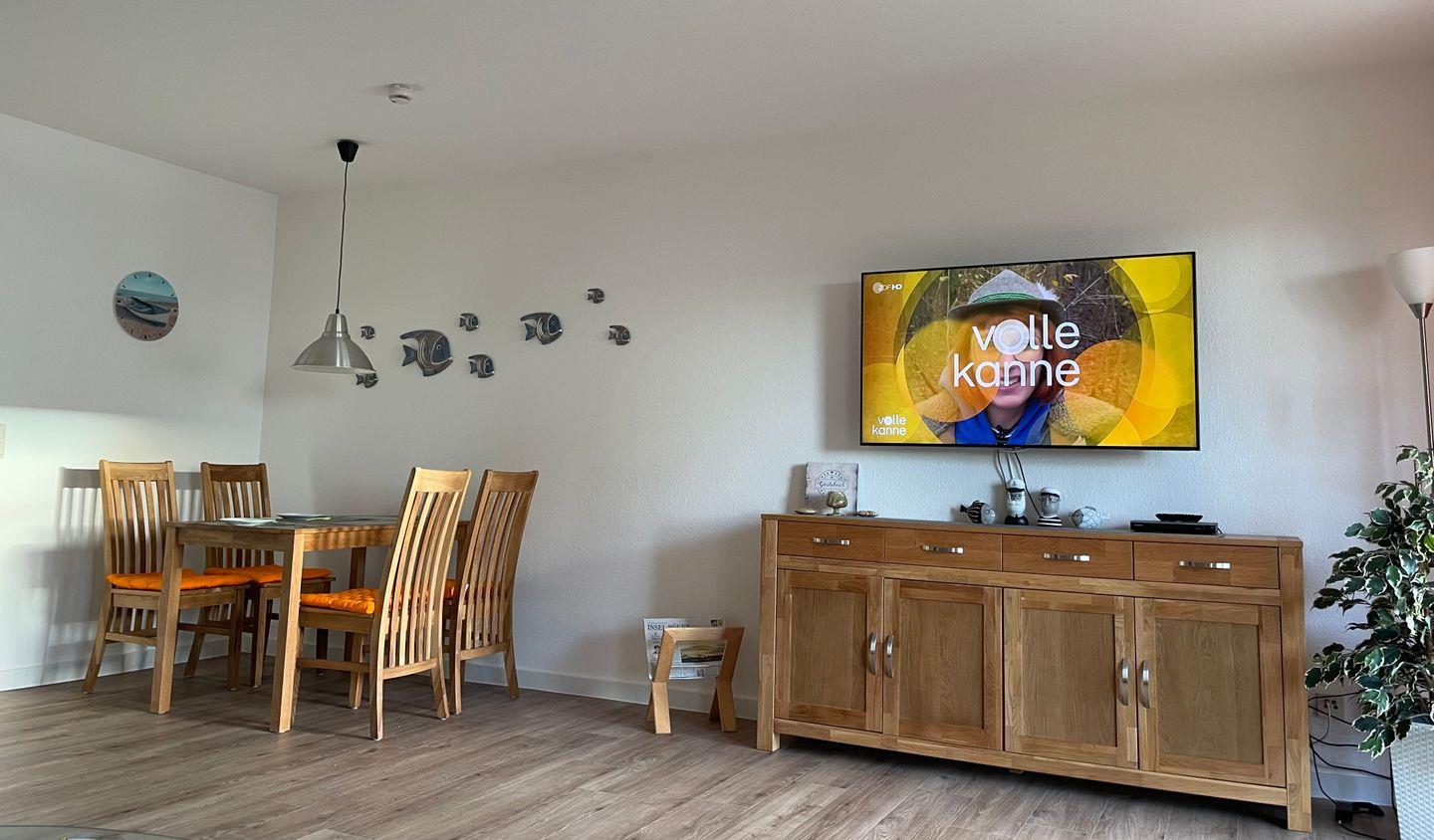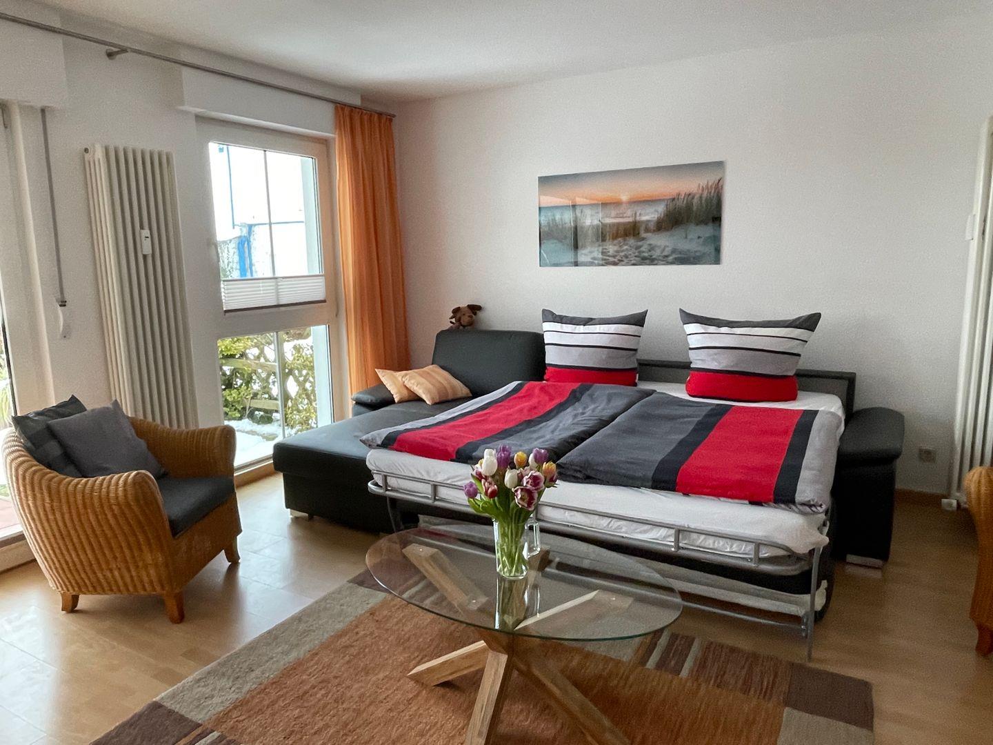 Das Wohnzimmer verfügt über einen integrierten Koch- und Essbereich mit einer komplett ausgestatteten Küchenzeile (Cerankochfeld, Backofen mit integrierter Mikrowelle, Geschirrspüler, Wasserkocher etc.). Auf einer Schlafcouch (Liegefläche 1,70 x 2,00 m) können 2 Personen sehr bequem übernachten. Es ist in kürzester Zeit wieder zu einer Couch umgebaut. Außerdem finden Sie hier einen Flachbildfernseher (55 Zoll) mit Internetanschluss, Radiosendern und DVD/CD Player. Das Schlafzimmer ist mit einem modernen Doppelbett und Kleiderschrank ausgestattet. Das Badezimmer bietet eine Dusche.
