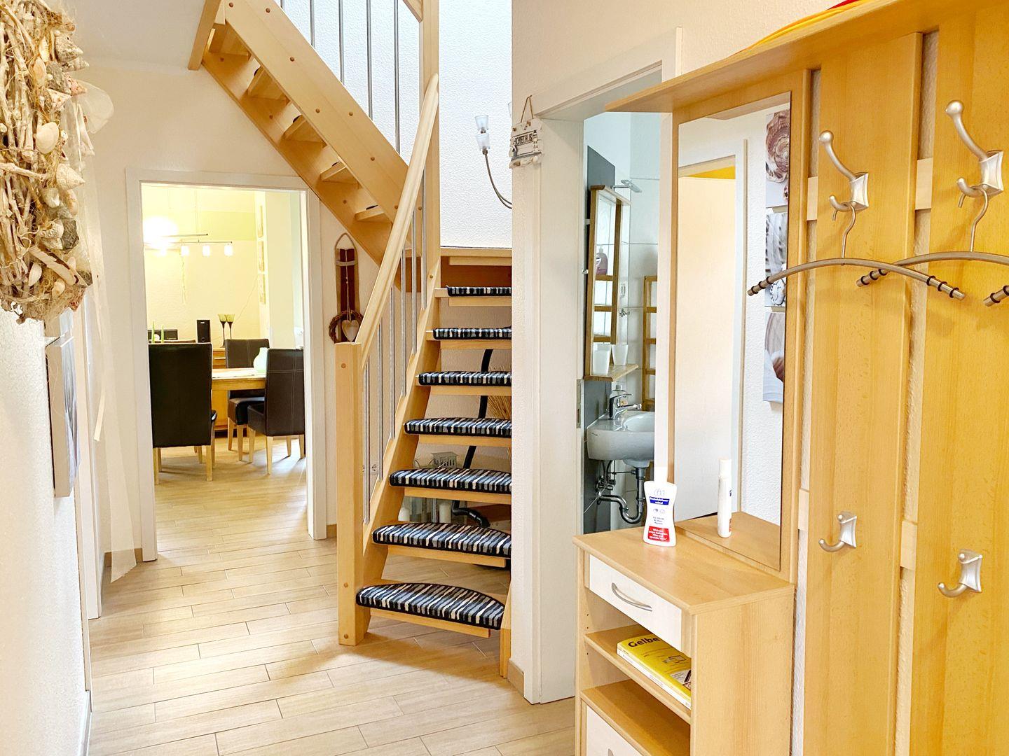 Die offene, moderne Einbauküche ist in den großzügigen Wohnbereich integriert und lässt keine Wünsche offen. Sie ist ausgestattet mit Geschirrspüler, Backofen, Ceranfeld, Mikrowelle, Kühlschrank mit Gefriermöglichkeit, Kaffeemaschine, Toaster, Wasserkocher und einer Vielzahl an weiterem Küchenzubehör. Es gibt zwischen Küche und Wohnbereich einen großen Esstisch mit gemütlichen Stühlen. Vor dem Wohnbereich mit der gemütlichen Sitzecke und Kamin befindet sich die Terrasse mit Gartenmöbeln und zwei Liegestühlen. Im Erdgeschoß gibt es ein Bad mit Echtglasdusche, WC, Waschtisch, Waschmaschine und Trockner. Von der Diele aus führt eine Treppe ins Obergeschoß. Im Obergeschoß gibt es neben einem weiteren Wohnbereich mit Couch, Sesseln und Flachbild-TV drei separate Schlafzimmer. Zwei der Schlafzimmer verfügen über je ein Doppelbett, das dritte Schlafzimmer bietet zwei Einzelbetten. Im OG gibt es ein weiteres großzügiges Badezimmer mit Dusche, Badewanne, Waschtisch und WC. In beiden Bädern gibt es Haartrockner. WLAN ist im Haus vorhanden. Außerdem gibt es ein Kinderbettchen und einen Hochstuhl. Ein Grill ist vorhanden.