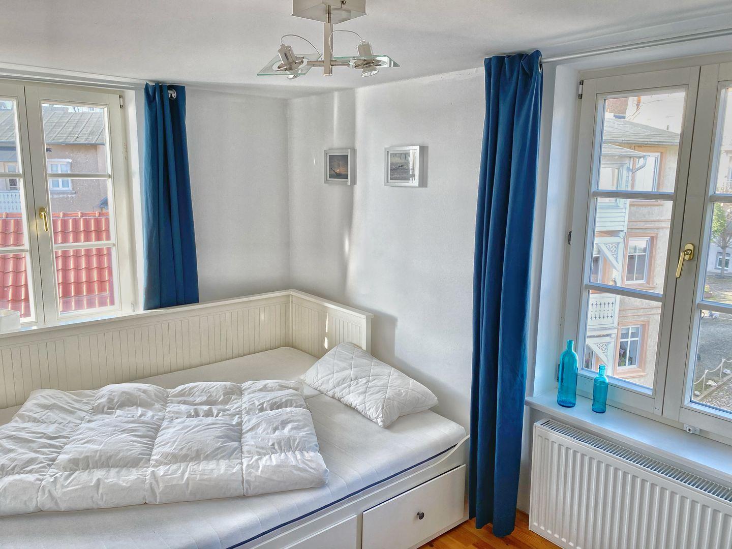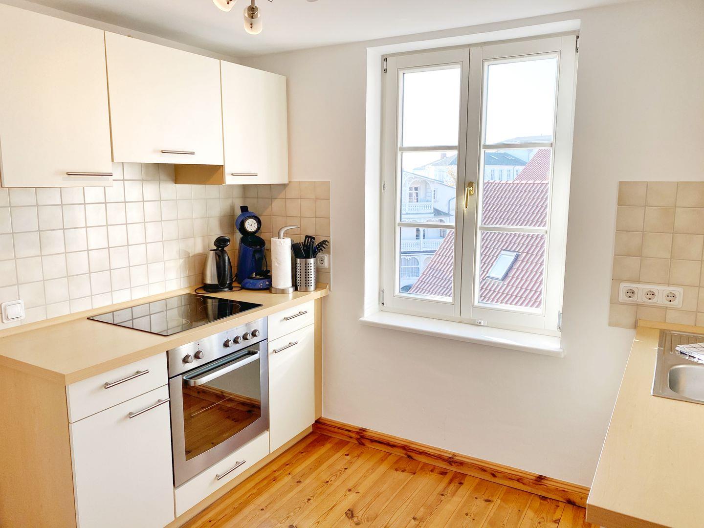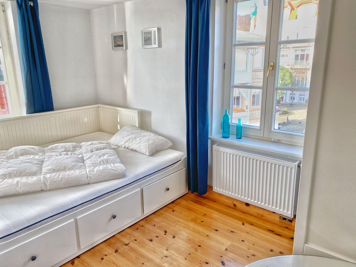 Appartement "Blue White": Die 3-Zimmer-Wohnung mit 60 Quadratmetern Wohnfläche bietet bis zu 6 Personen Platz. Die Ferienwohnung befindet sich im 2. Obergeschoss und bietet sowohl einen herrlichen Blick von Sassnitz über die Ostsee bis nach Binz, als auch einen Blick auf die Altstadt von Sassnitz auf Rügen.Zur Ausstattung des Appartements gehört eine Voll-Küche, Senseo Padmaschine, FLAT-TV mit DVD Player, Mini-Stereo-Anlage. Raumaufteilung: Wohnraum, 2 Schlafzimmer, Küche, Bad mit Dusche und Fön. Größe: 60 qm - belegbar bis 6 Personen. WLAN ist vorhanden.