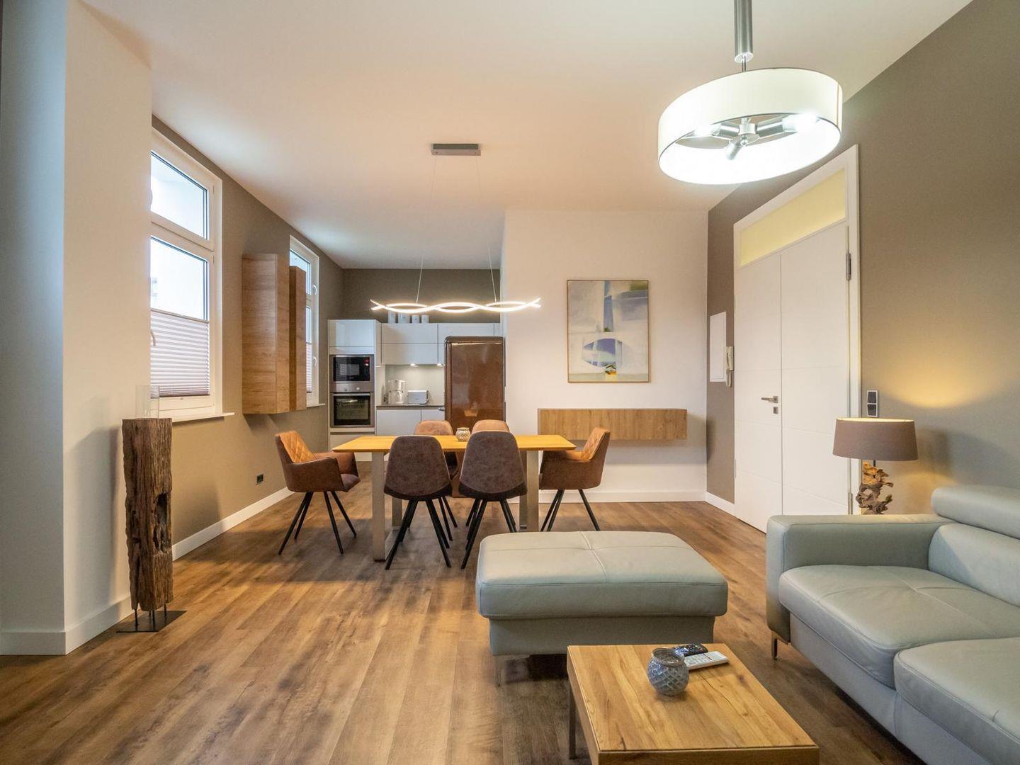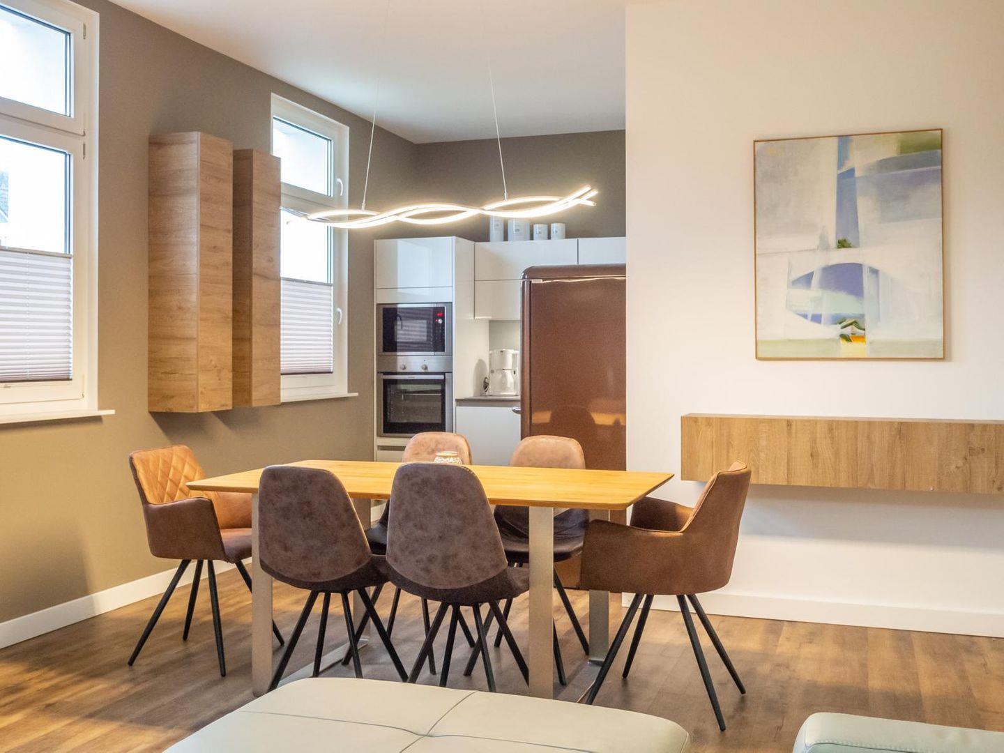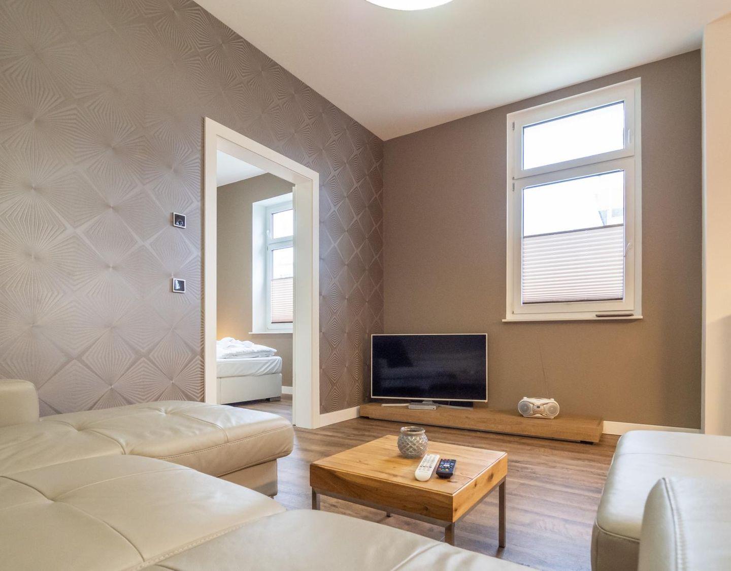 Die Ferienwohnung befindet sich im Hochparterre der Villa "Gössel". Sie hat eine Wohnfläche von ca. 50qm und besteht aus einem Schlafzimmer mit Doppelbett, einem Wohnzimmer mit Schlafcouch für zwei weitere Personen, einem Bad mit Dusche und einer im Wohnbereich integrierten, moderne Einbauküche. Die ganze Wohnung ist sehr modern und sehr geschmackvoll eingerichtet. Es gibt sowohl im Schlafzimmer als auch im Wohnzimmer TV. Die Küche verfügt über sämtliche Annehmlichkeiten wie Geschirrspüler, Ceran- und Induktionsherd, Backofen, Mikrowelle, Kühlschrank, Gefriermöglichkeit und natürlich über Kaffeemaschine, Wasserkocher, Toaster und genügend Küchenutensilien. Den Gästen steht außerdem eine Waschmaschine zur Verfügung. In der Wohnung gibt es ein kostenfreies WLAN. Zur Wohnung gehört der Pkw-Stellplatz Nr. 3 direkt am Haus sowie abschließbare Fahrradunterstellmöglichkeiten im Keller des Hauses.