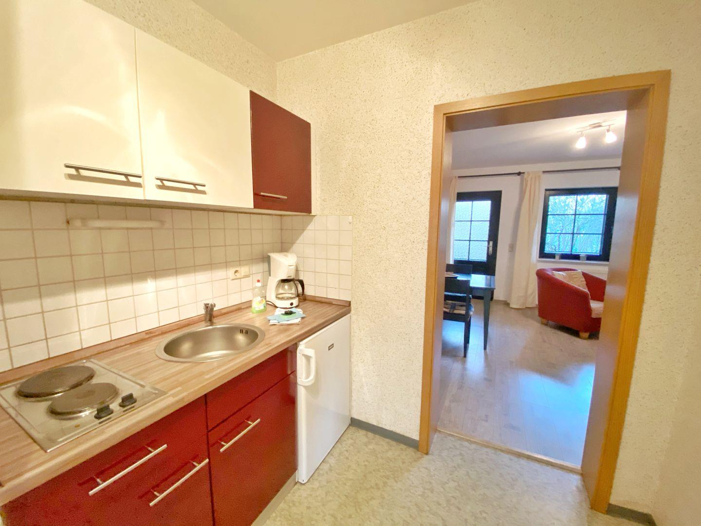 Die gemütliche Ferienwohnung hat eine Grundfläche von ca. 40 m² und unterteilt sich in einen Wohnraum mit Doppelbettcouch, einem Essbereich und Flachbild-TV, ein Schlafzimmer mit Doppelbett und Kleiderschrank, einen Flur mit Miniküche (Kühlschrank, 2 Kochplatten, Kaffeemaschine, Wasserkocher, Toaster) und ein Badzimmer mit Dusche und WC.